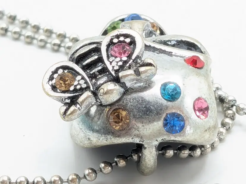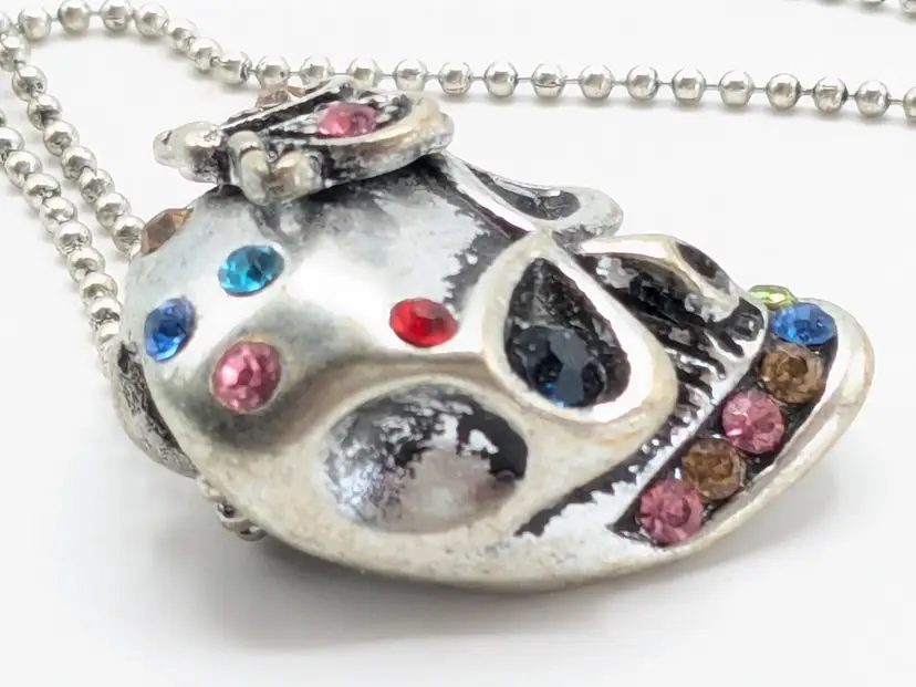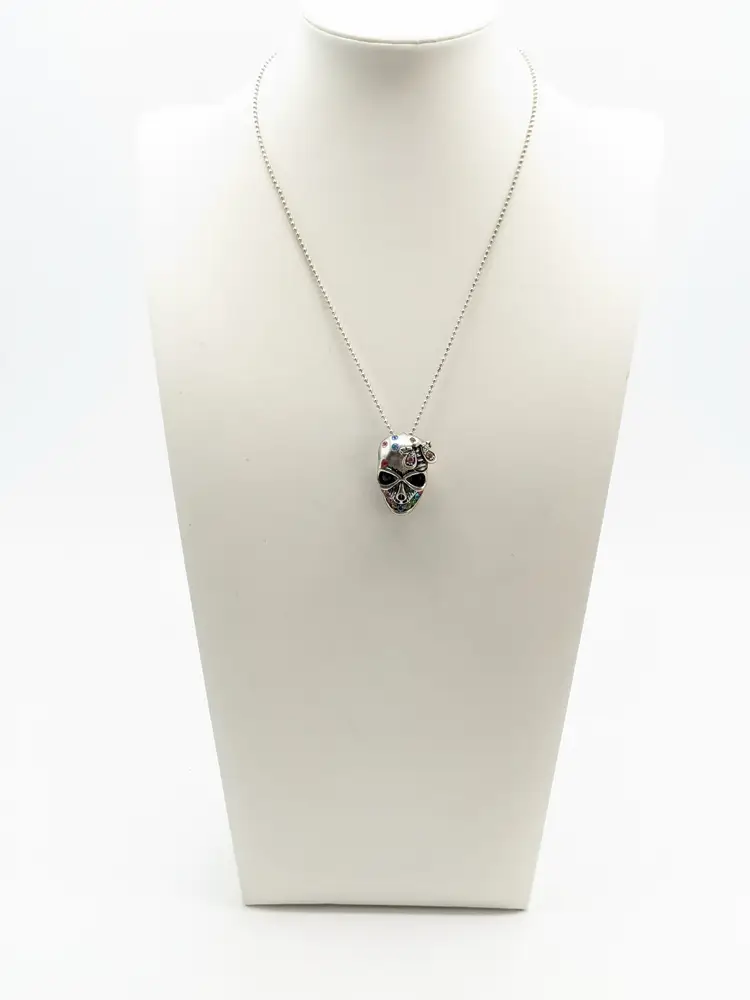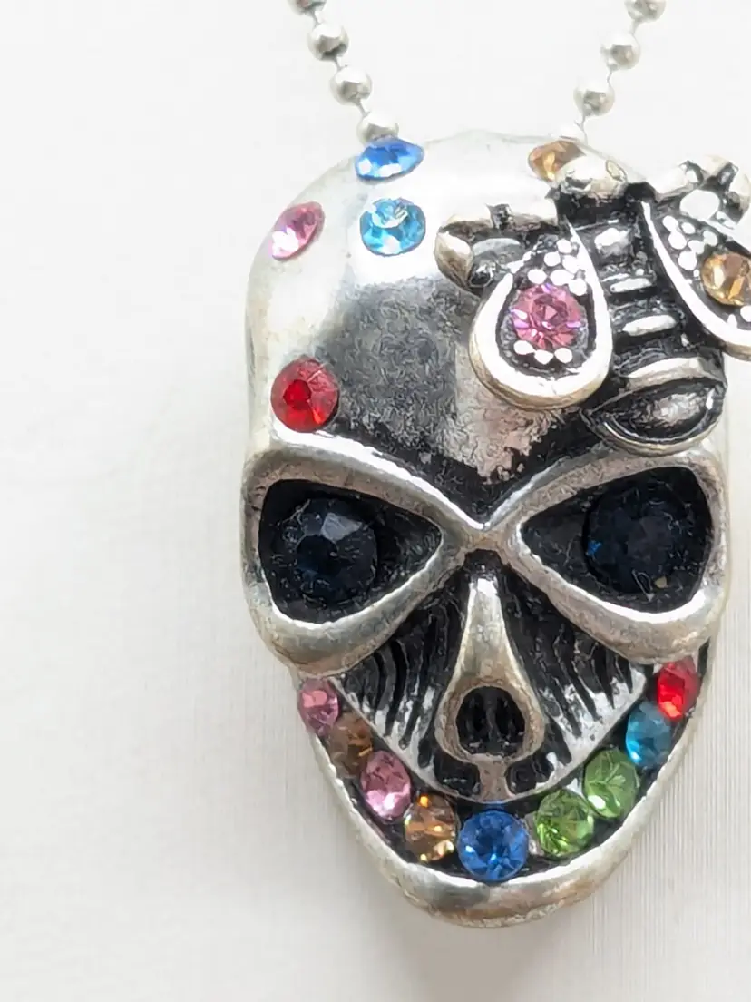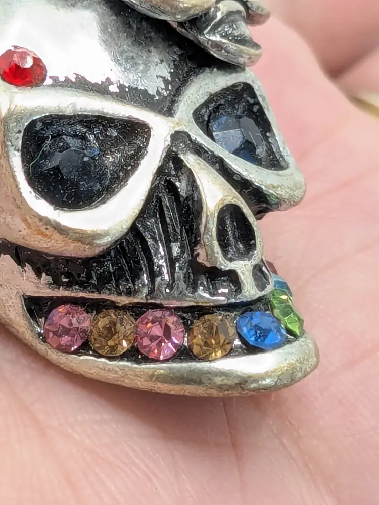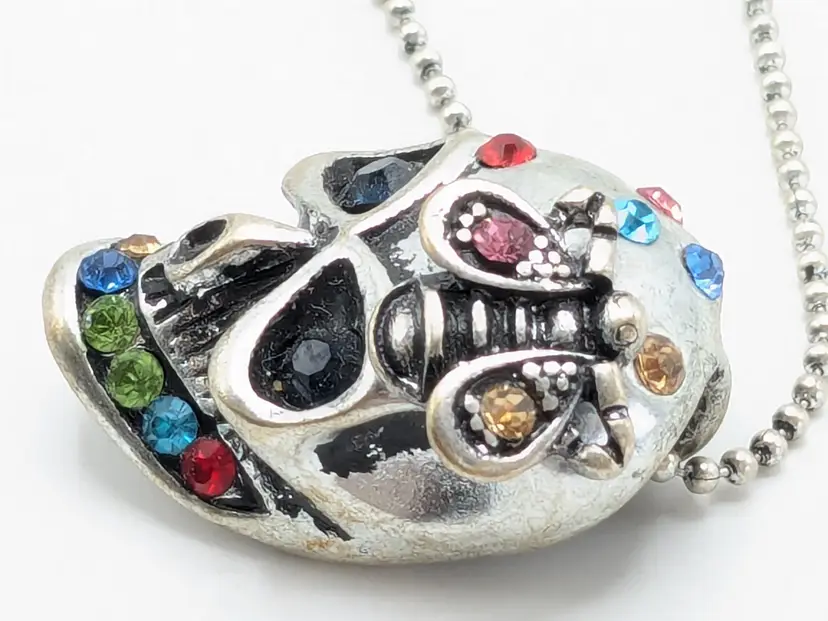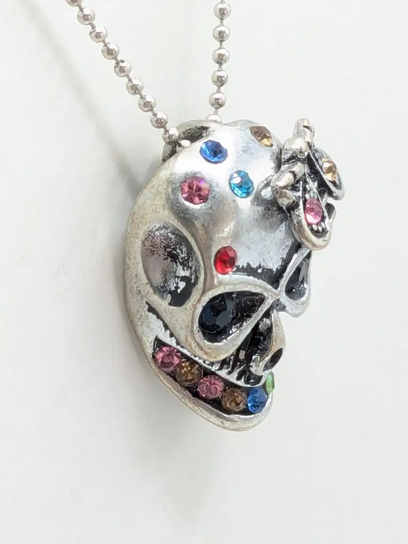 Good condition. Skull features dark rhinestones in eyes and colorful stones. Atop his head is a bee. Perfect for Halloween! Chain measures 16" with a 2" extender. Pendant measures 1 1/8" in length and 5/8" wide. EN3