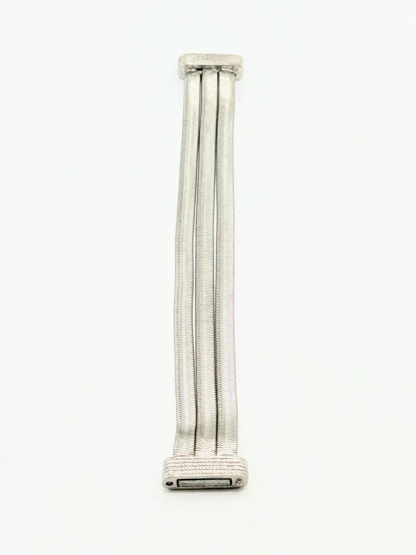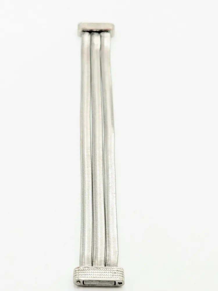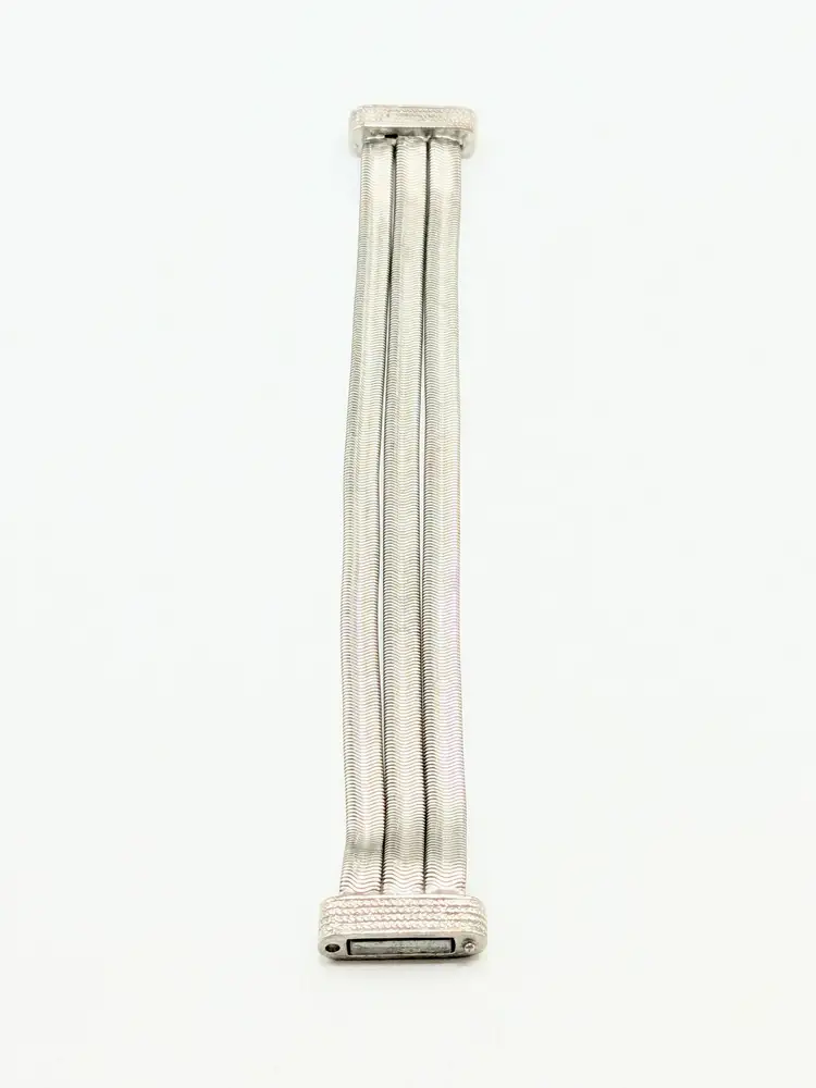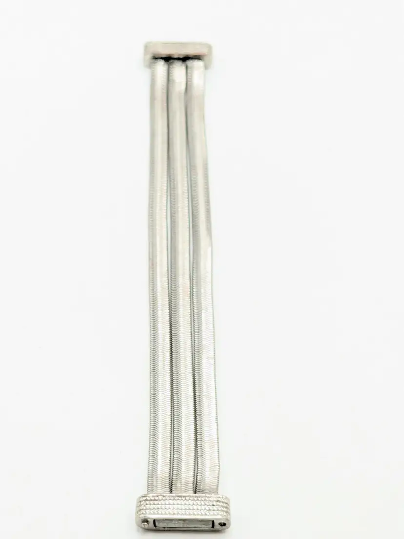 Elegant bracelet in good condition. Features a unique snake chain triple strand design with a textured magnetic clasp. Perfect for adding a touch of sophistication to any outfit. Size 7. (EN2)
