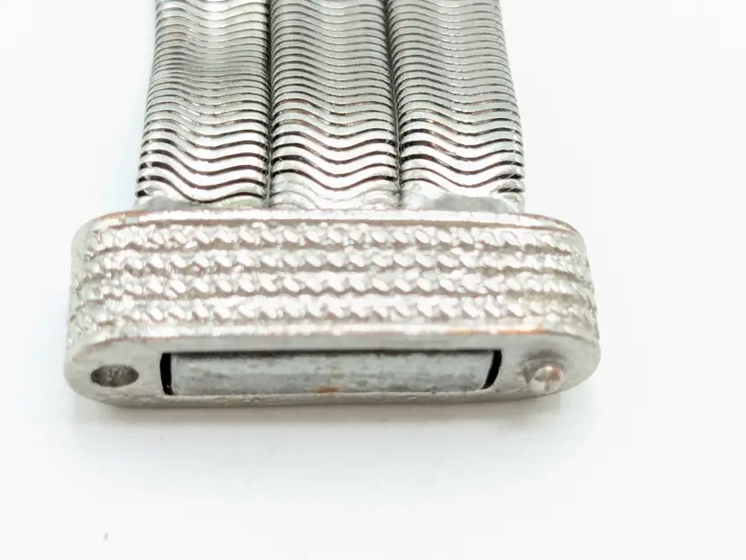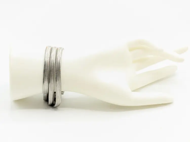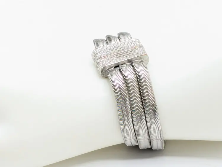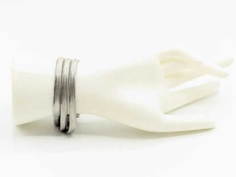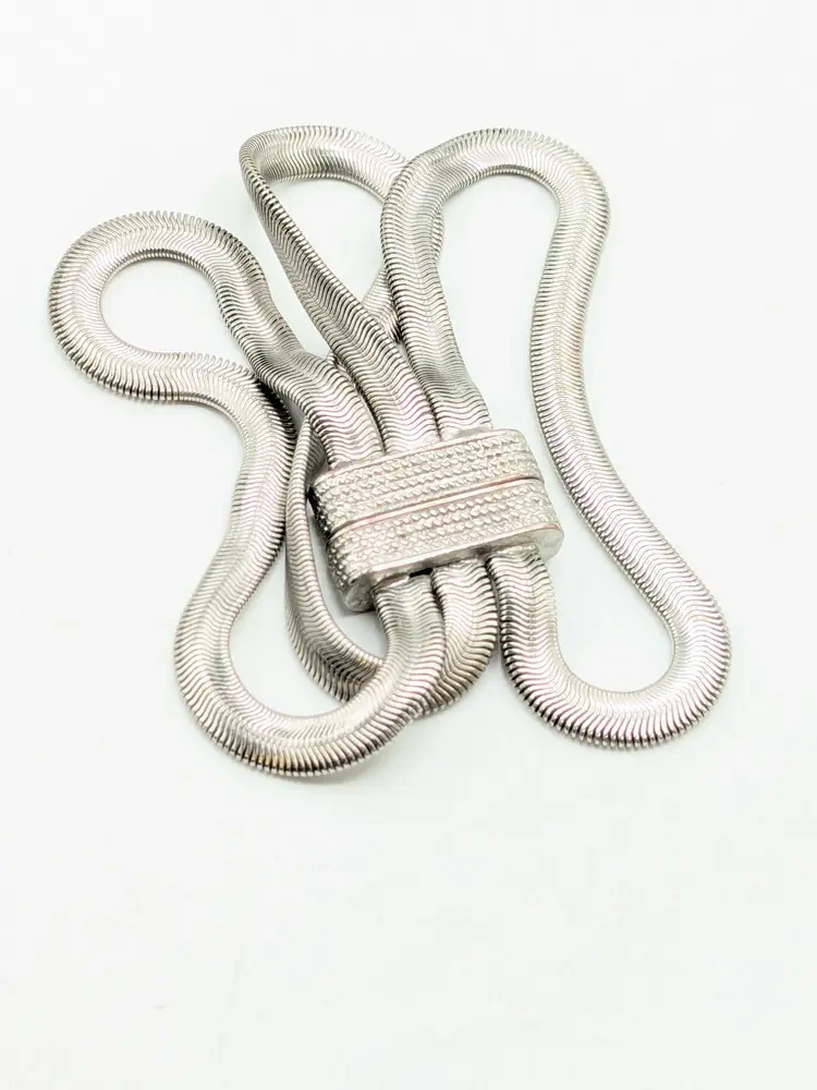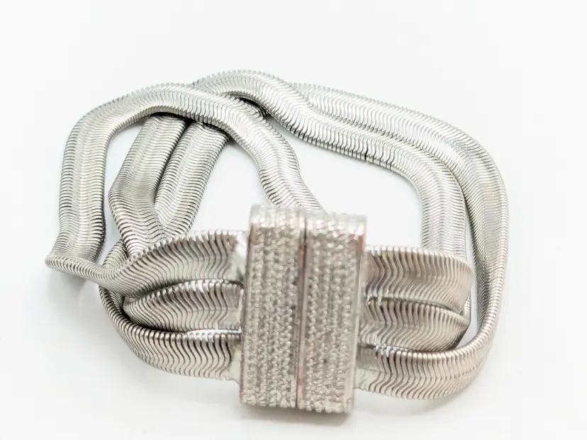 Elegant bracelet in good condition. Features a unique snake chain triple strand design with a textured magnetic clasp. Perfect for adding a touch of sophistication to any outfit. Size 7. (EN2)