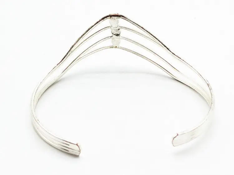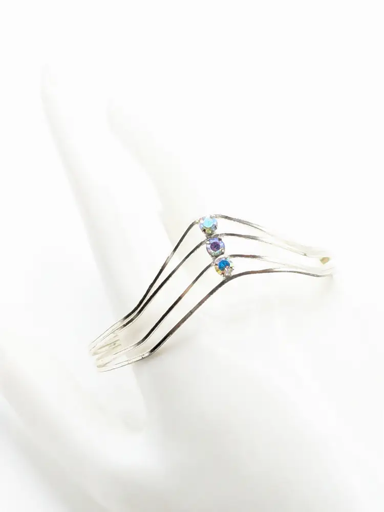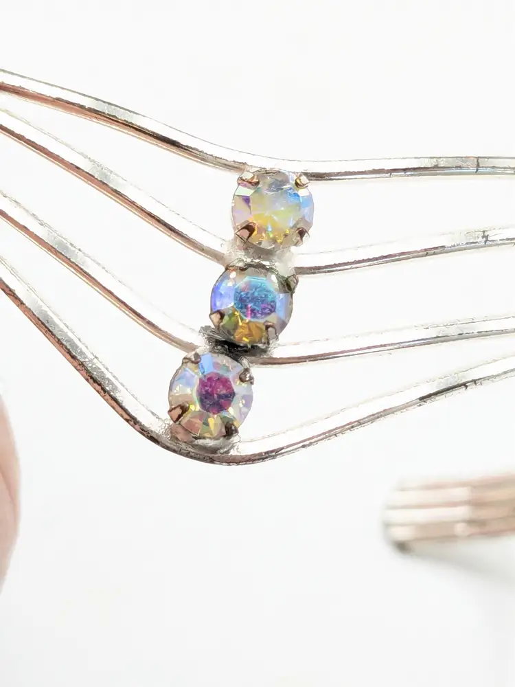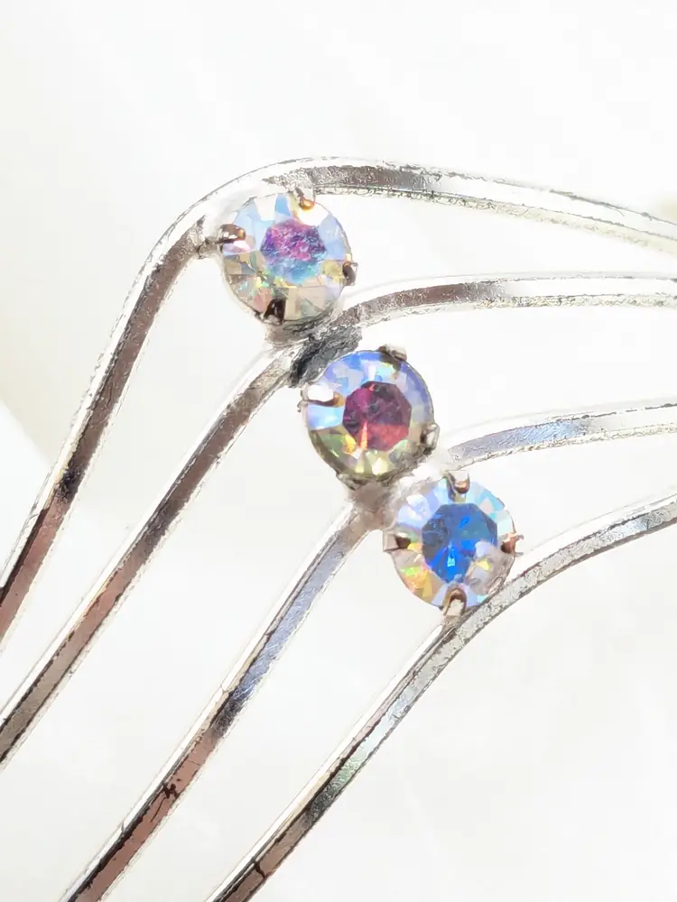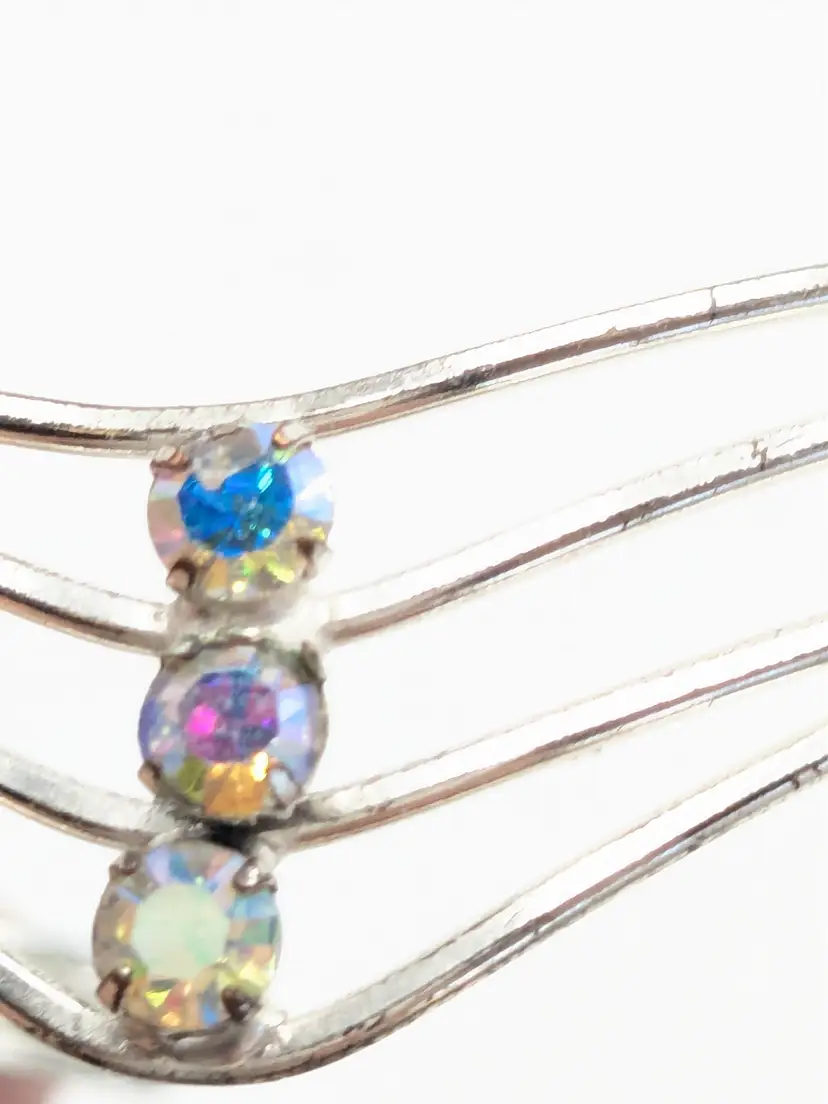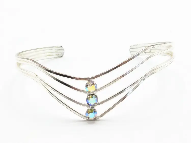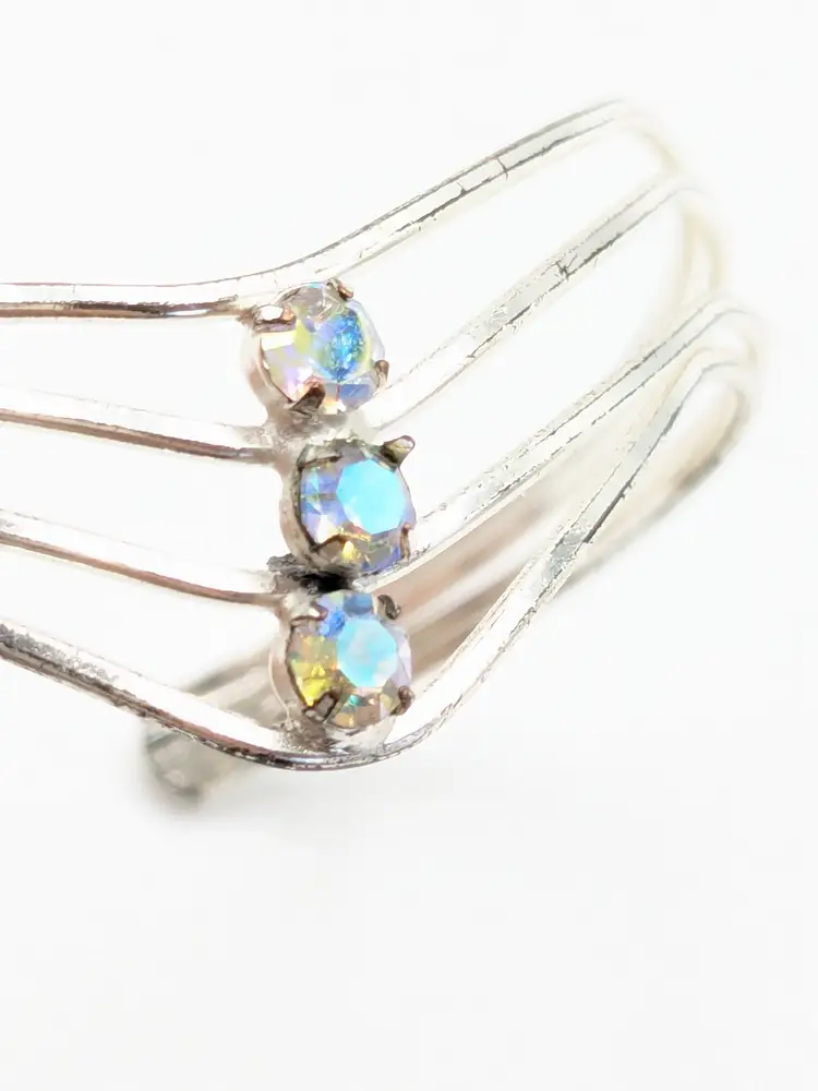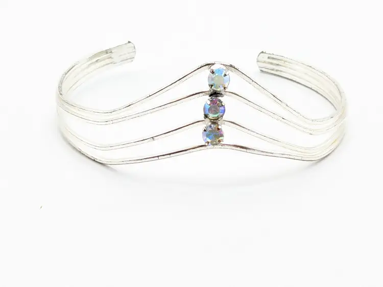 Good condition. Silver tone is bright and shiny with no color loss. Features aurora borealis gems. Lightweight. Size 7". Center is 5/8" wide. EN3