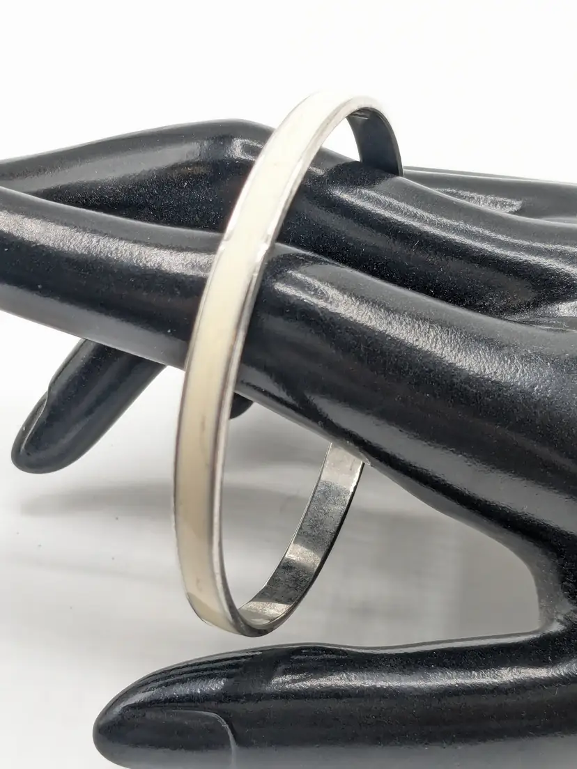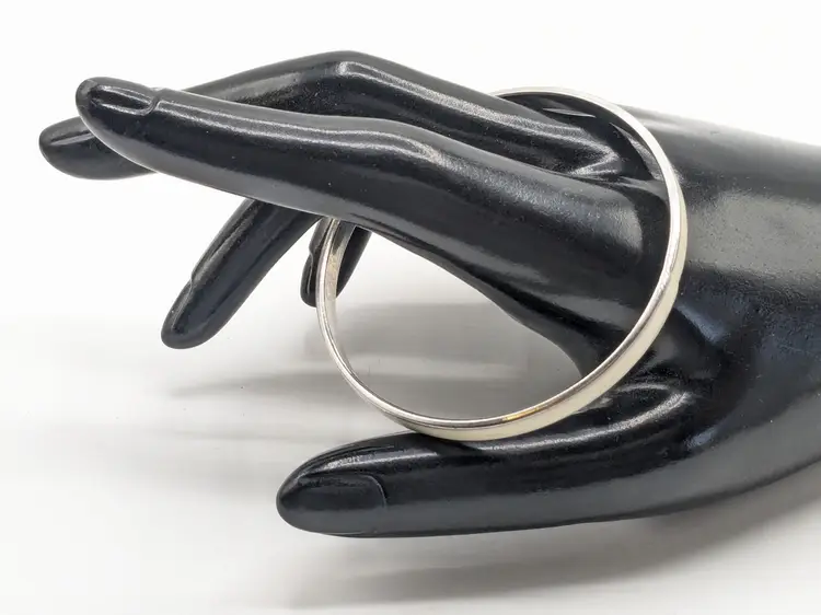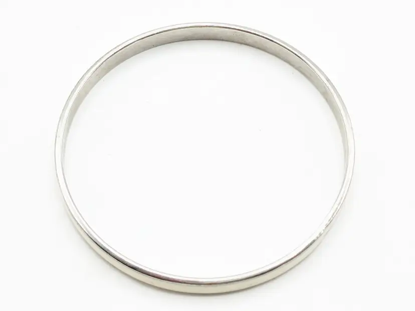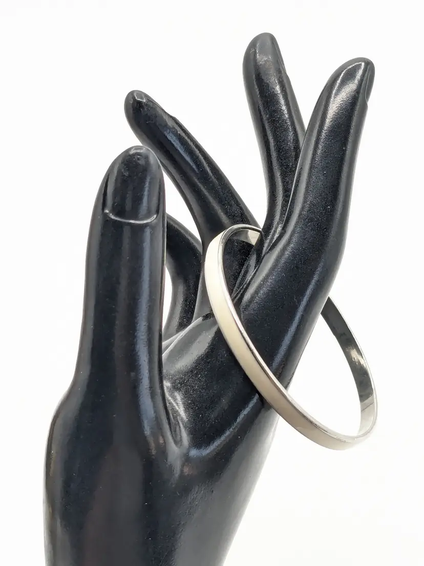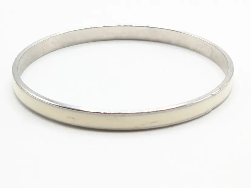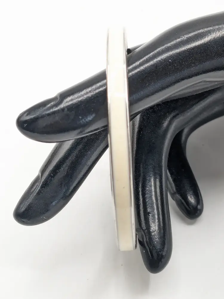 Good condition. Silver tone is bright and shiny with no color loss. No enamel loss. White in color. Size 7" with a 2 1/4" diameter and 1/8" wide. EN3