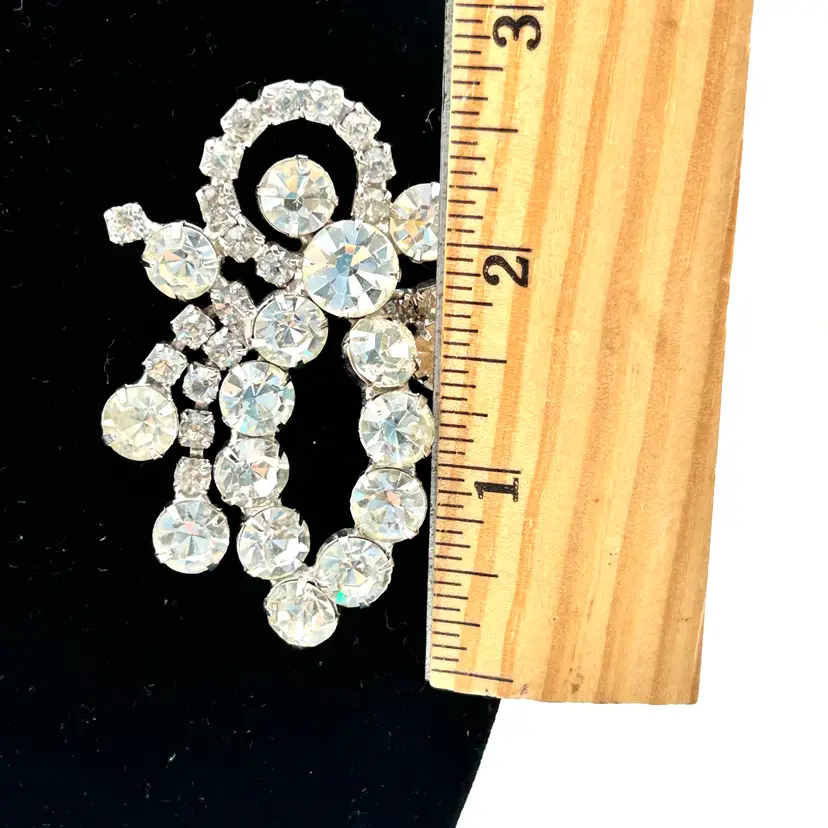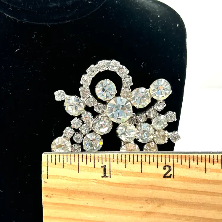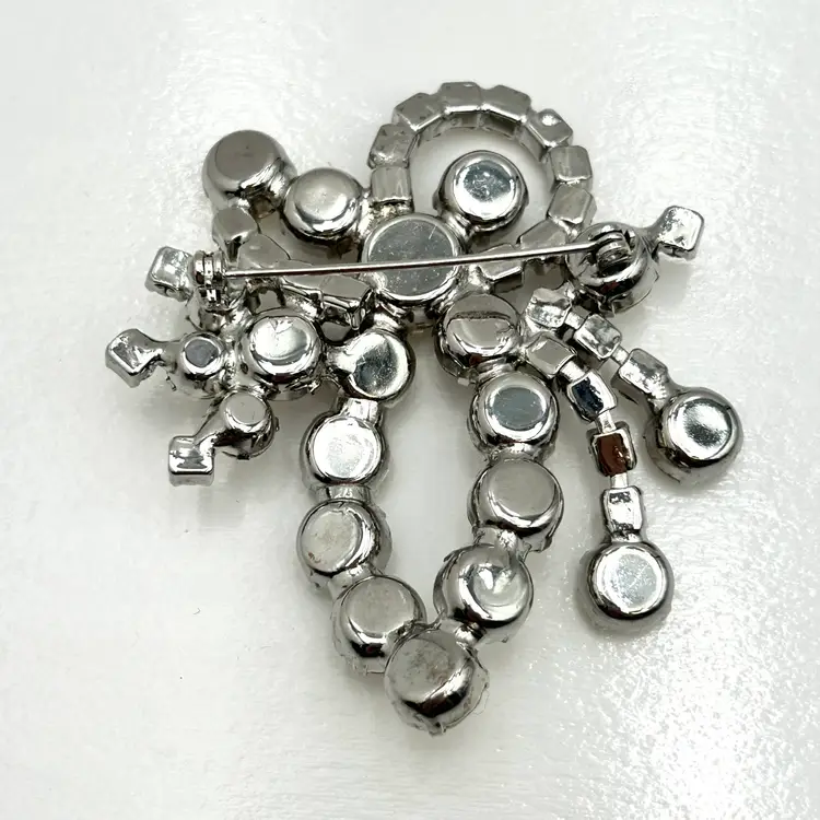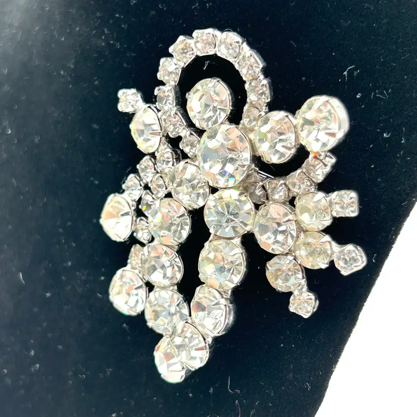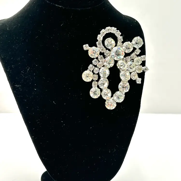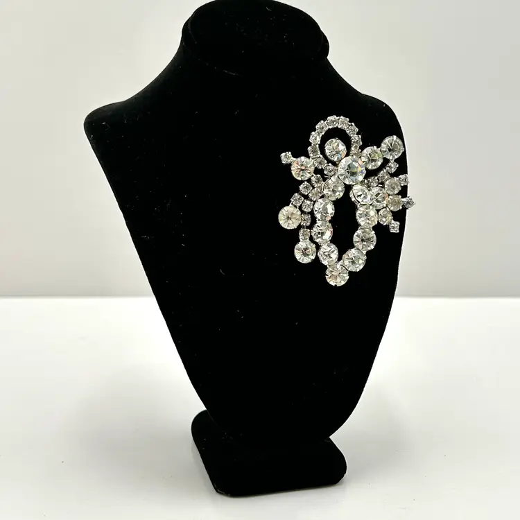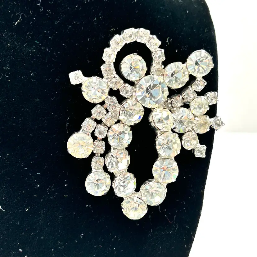 Absolutely stunning with all sorts of bling, vintage rhinestone brooch. It is a silver tone pronged rhinestone brooch that appears to be prong set. It has the look of a bow made from varying shapes and sizes of clear rhinestones. The brooch is about 2 ½ inches tall and 2 inches wide. The clasp works well and there are no missing stones.