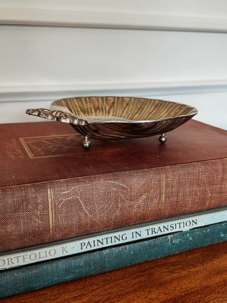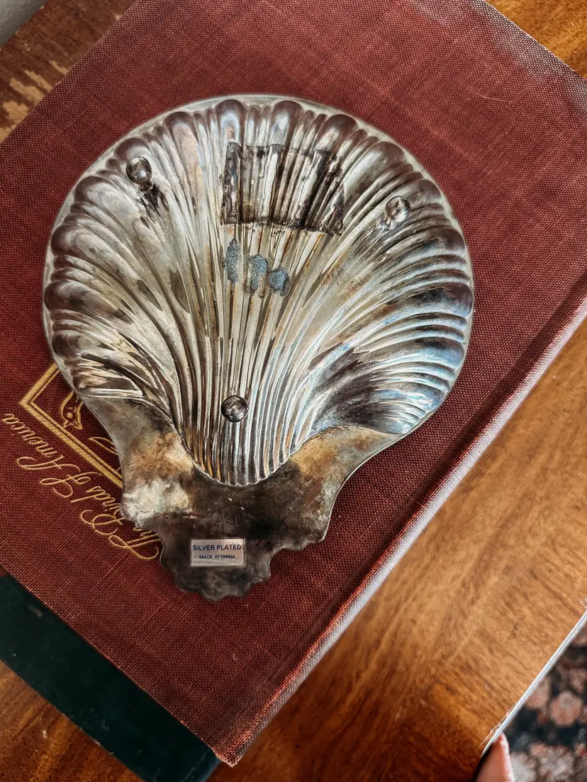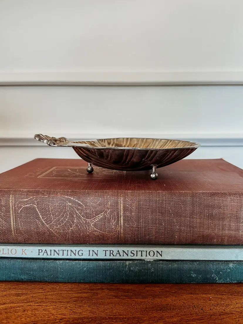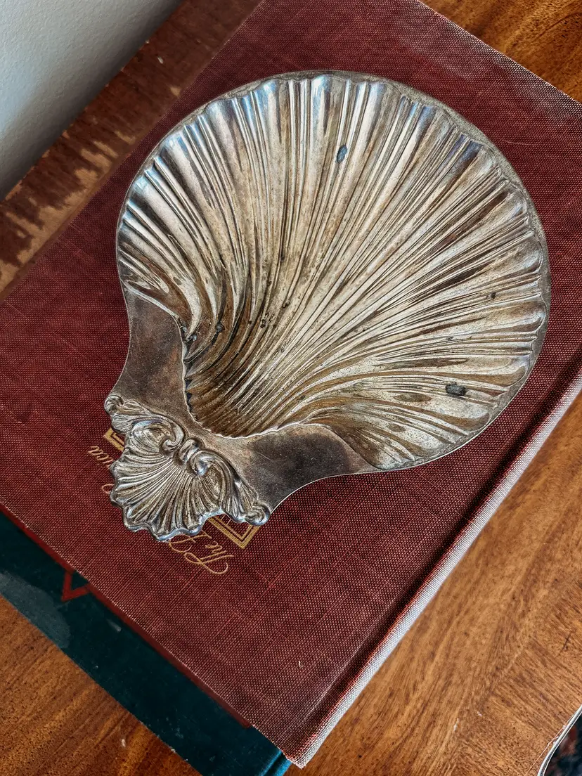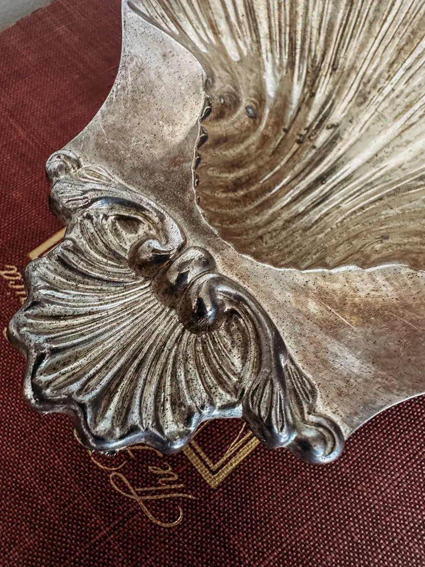 beautiful silverplated shell tray with three feet. In beautiful vintage condition! measures 8x7"