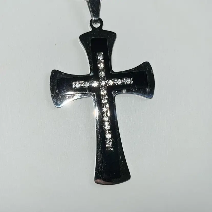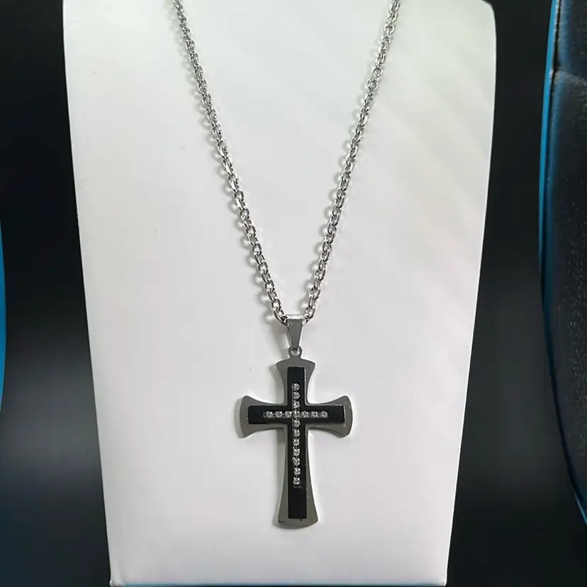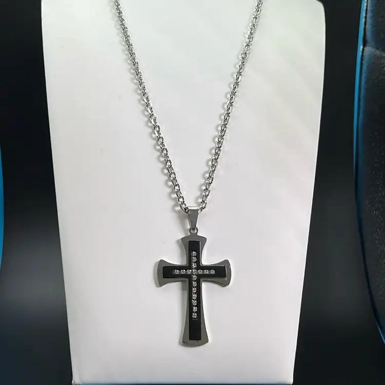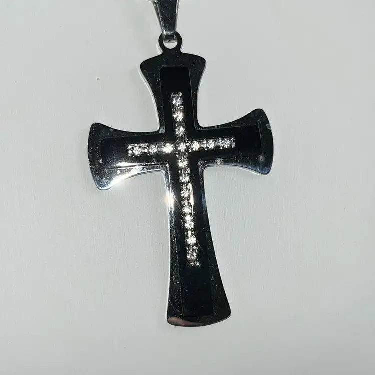 Silvertone And Black Cross Necklace With Rhinestones, Lobster Clasp 24โ€ Long