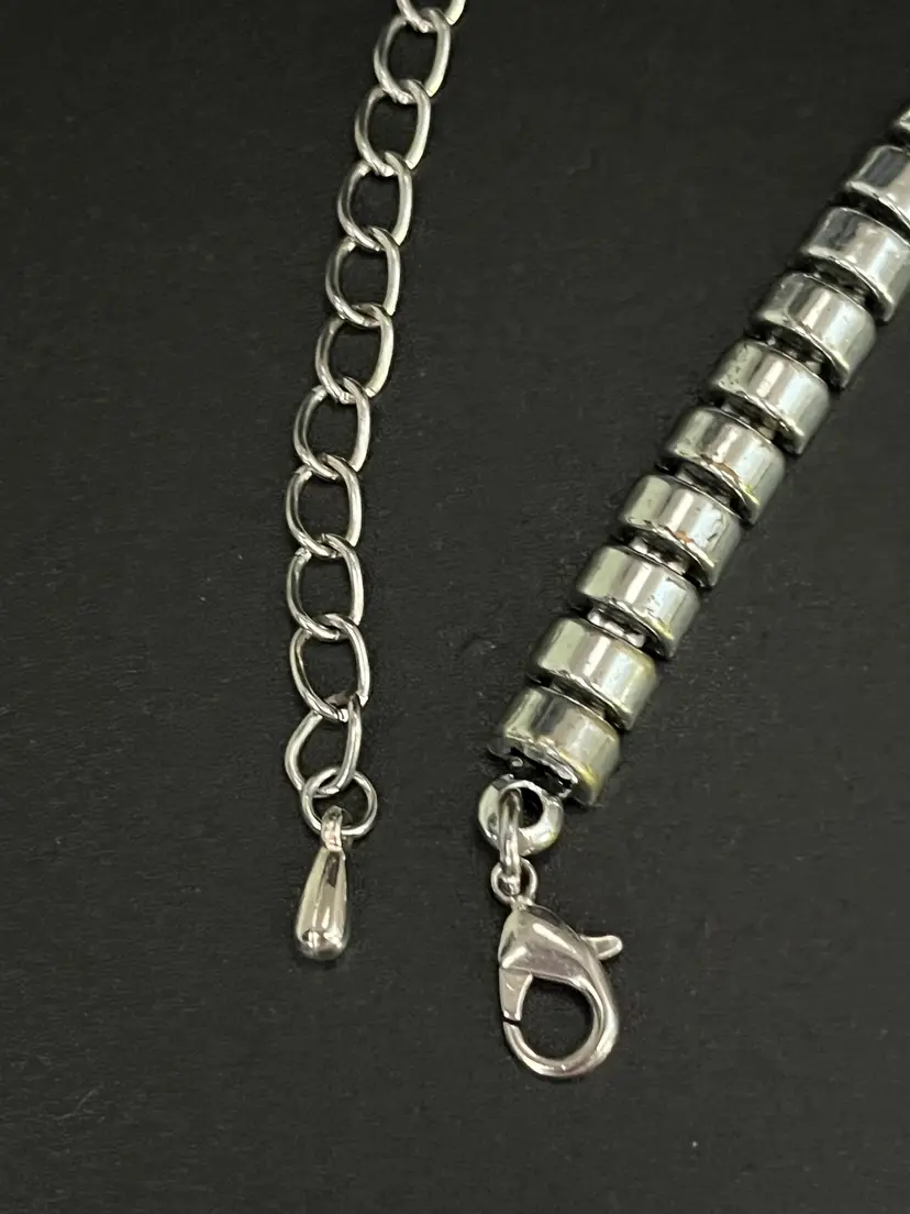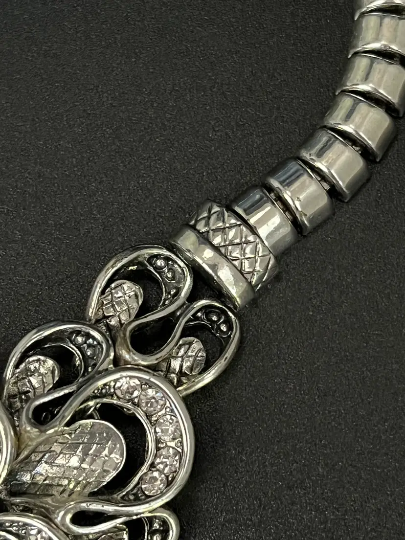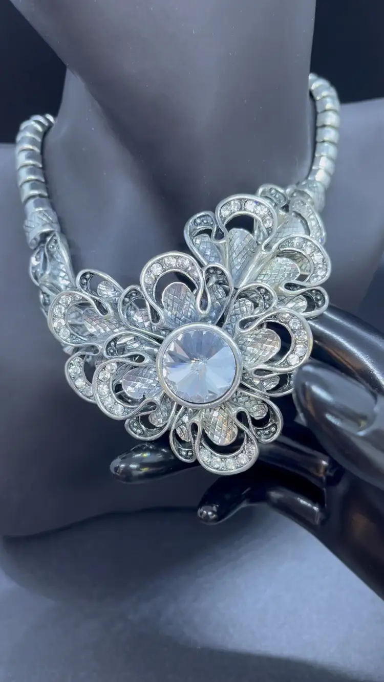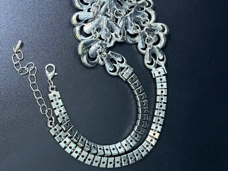 Make a bold entrance with this costume silver statement necklace featuring an intricate floral design. Adorned with sparkling rhinestones and a large central gem, it's perfect for adding a touch of elegance to any outfit. Ideal for special occasions or as a unique gift. Looks heavier but only weighs 3.5 oz. Adjustable length 17"-19" SKU B104