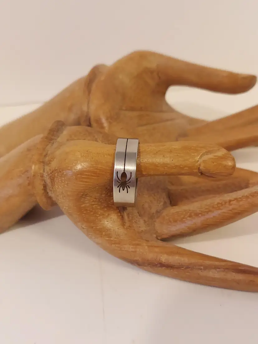 This unique silvertone ring features two carved spiders on either side of the ring. The size is approximately 9.75. There are no markings.