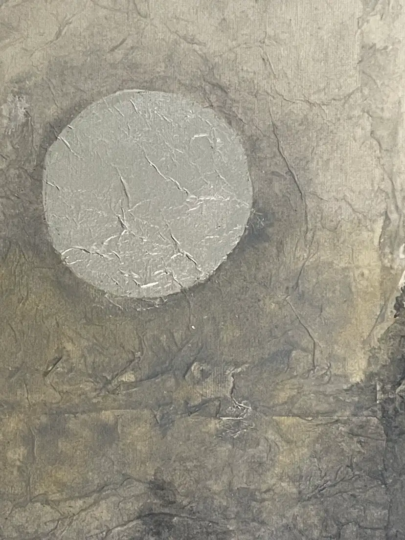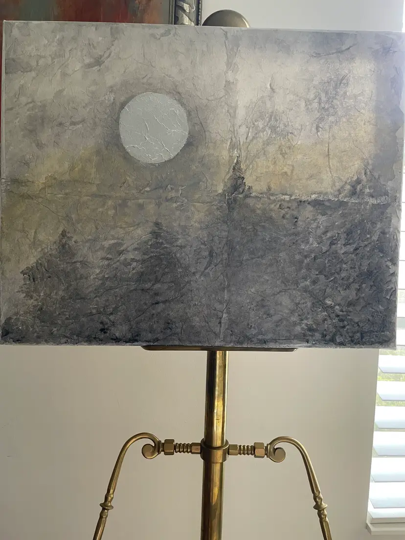Original Artwork Titled "Silvery Moon" Mulberry Paper on Canvas. Acrylic Painting. By Deb Vogel 16 X 20 Can be hung unframed or it can be framed . Moon is Silver Leaf. Colors are in various shades of silver grays.