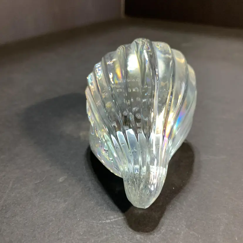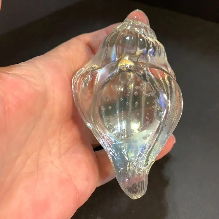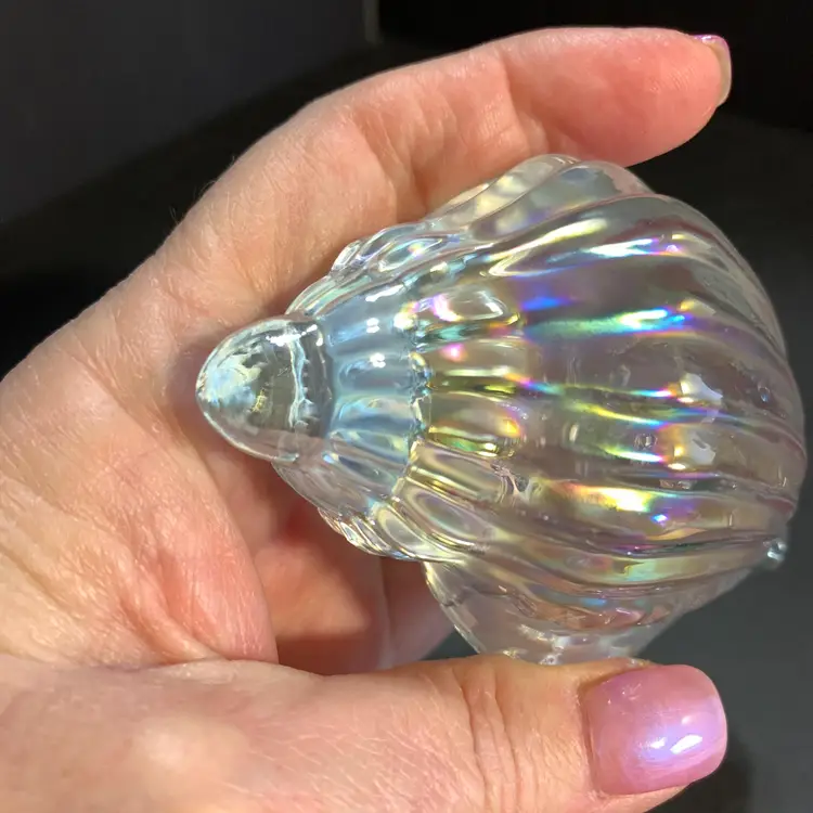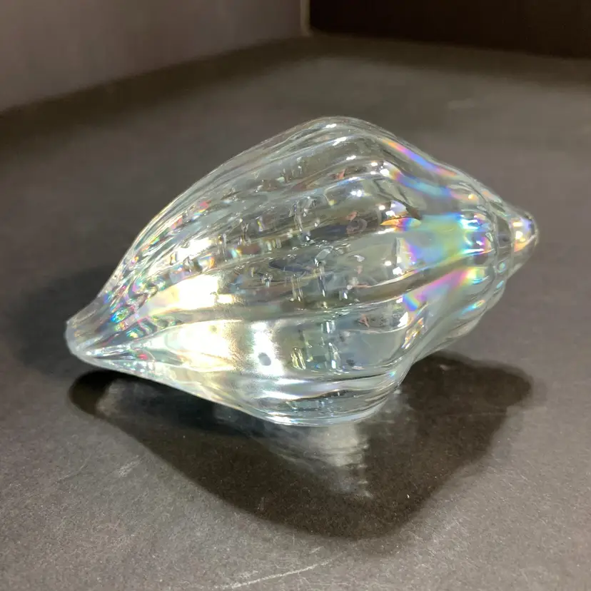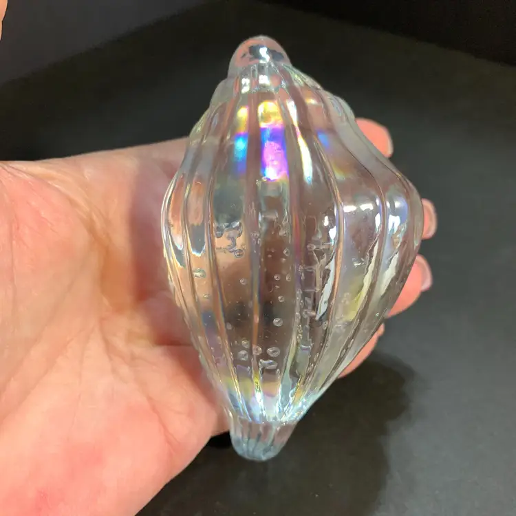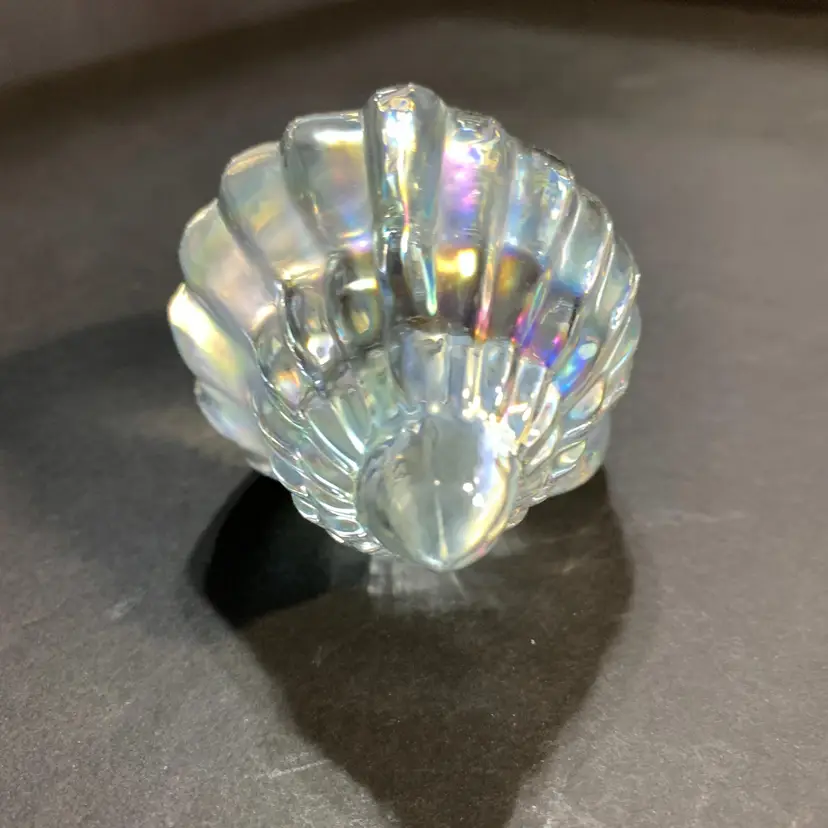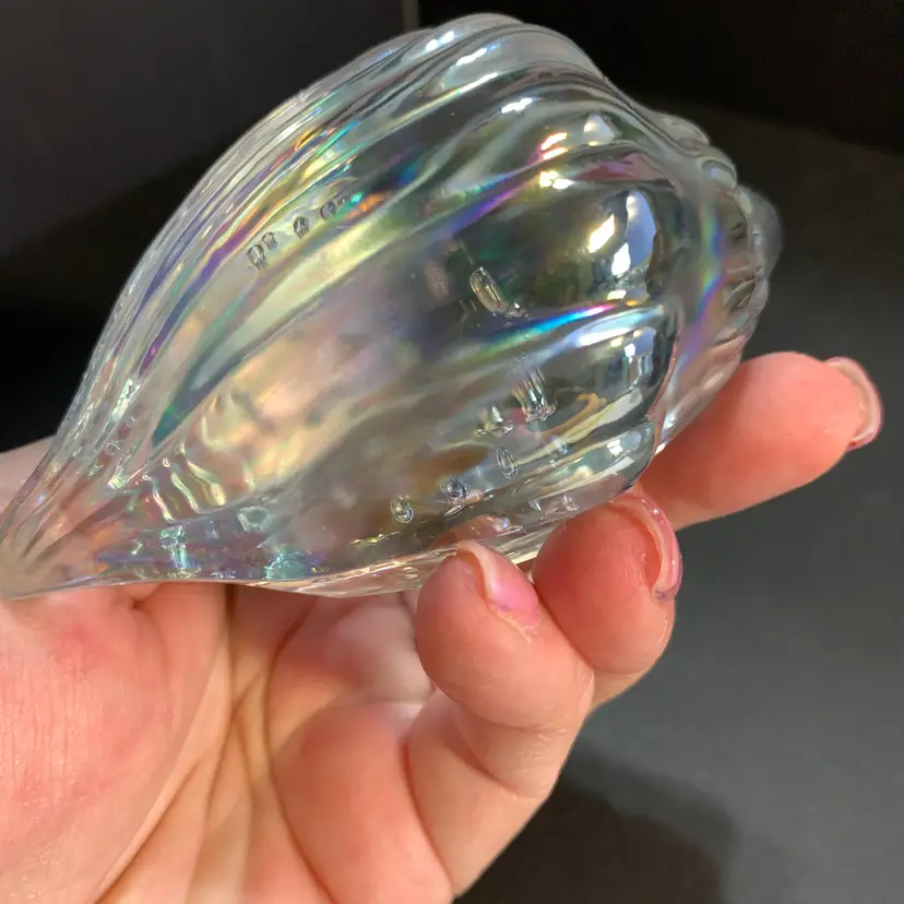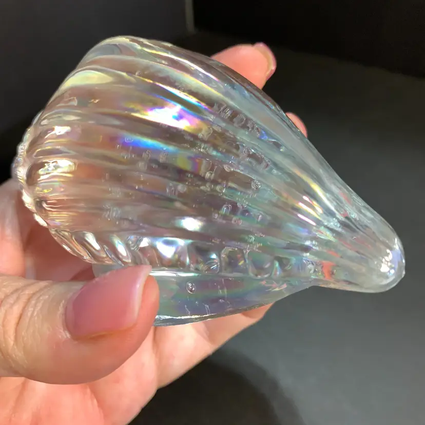 This has a beautiful iridescence. No chips or cracks. Measures 4 inches across, 2 1/4 inches wide and 2 1/4 inches tall. Weighs 10 ounces. If the actual postage ends up being less than what you paid, you will be refunded for anything over one dollar.