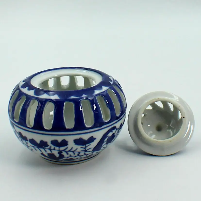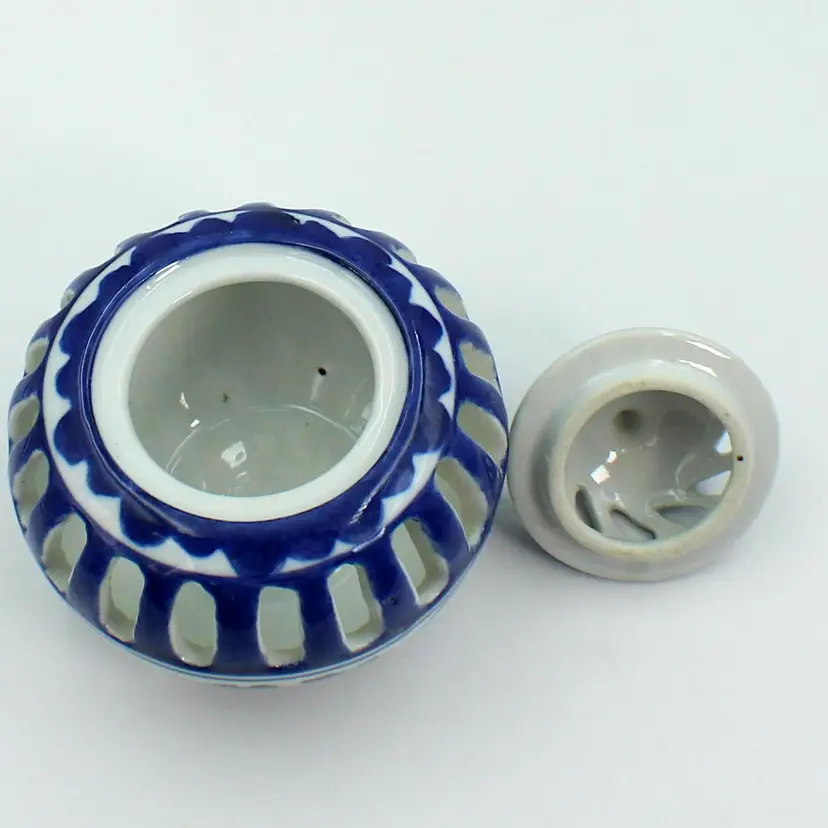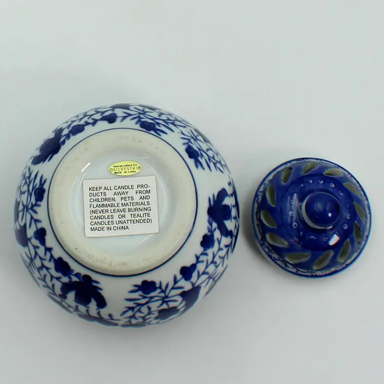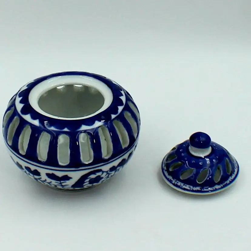 Very Nice Silvestri Vintage Blue And White Votive Candle Or Potpourri Holder. Measures 4" H x 4" Diameter (at widest part)