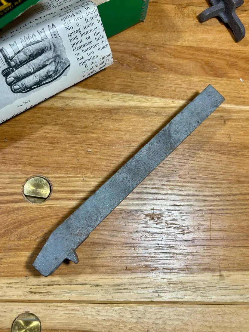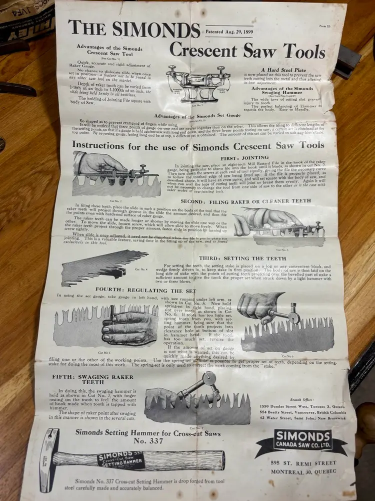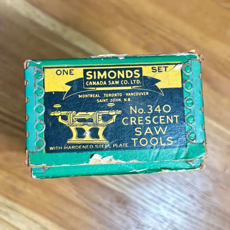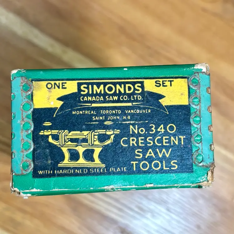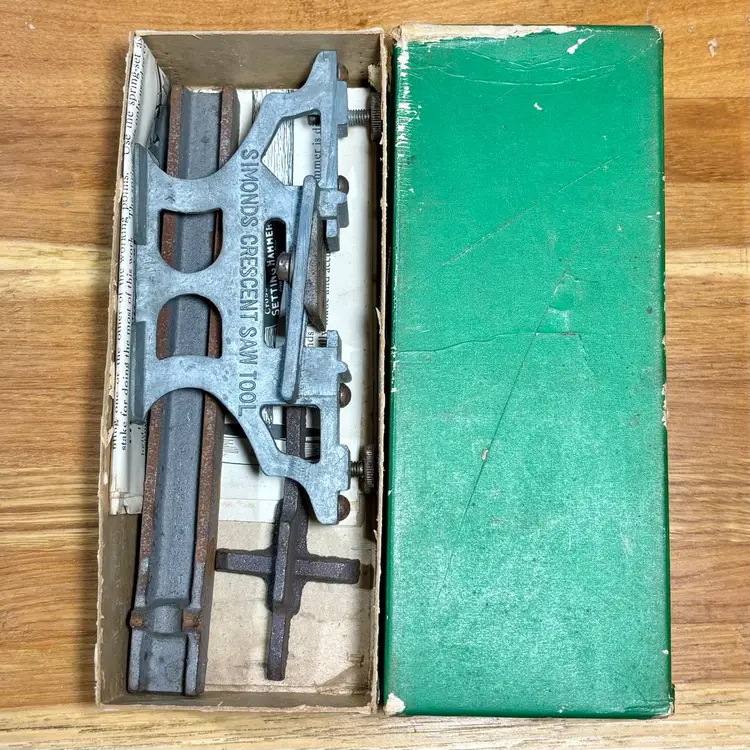 Excellent condition antique Simonds No. 340 Crescent Saw Sharpening Tools in box with instructions. No issues, complete kit for setting teeth on large buck saws, crescent saws, and other hand saws. Includes Raker gauge, teeth set stake, spider gauge and instructions with the original green box. The box is in good condition with complete labels on both ends. See pictures for details. Let me know if you have any questions.