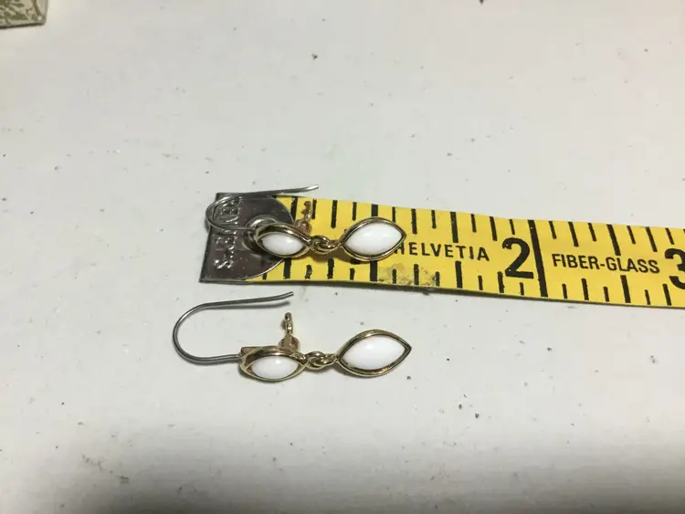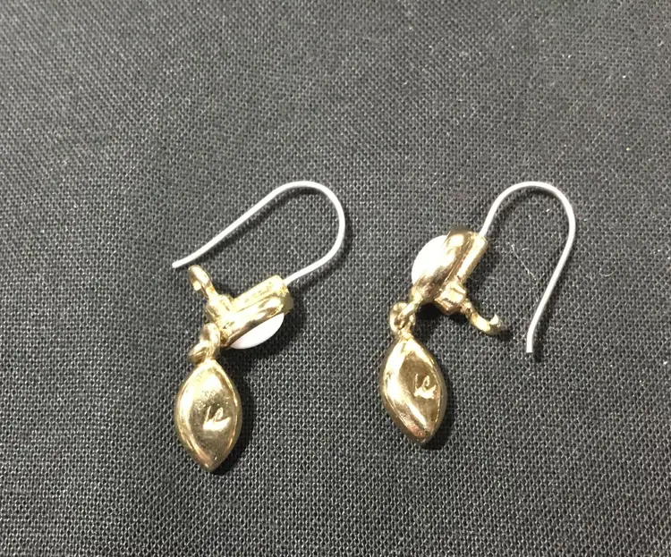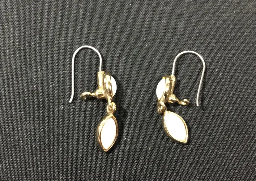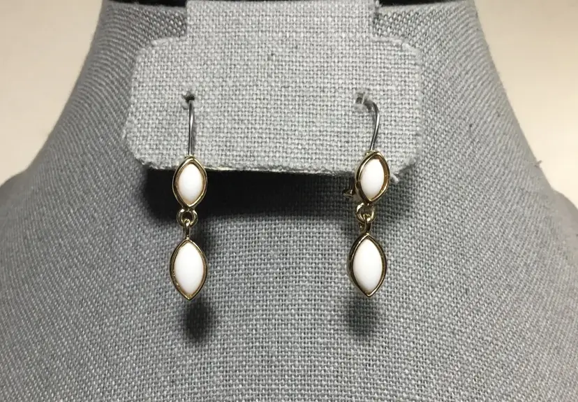 1+ inches gold tone dangle earrings, Liz Claiborne, white glass cabochons, top cabochon is fixed, bottom cabochon dangles. So simple and classic for holidays. Wires with hook clasp.