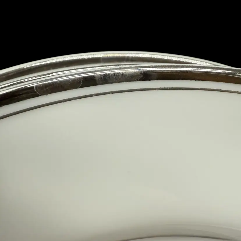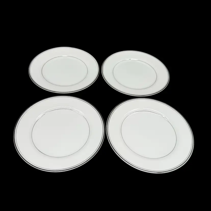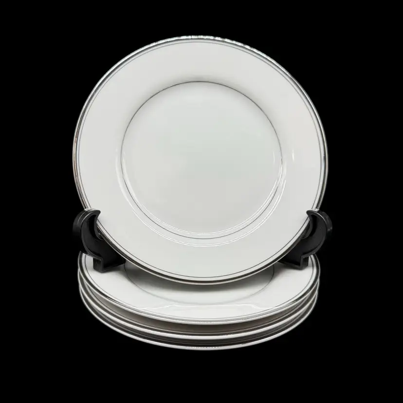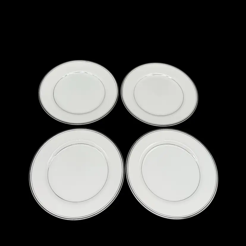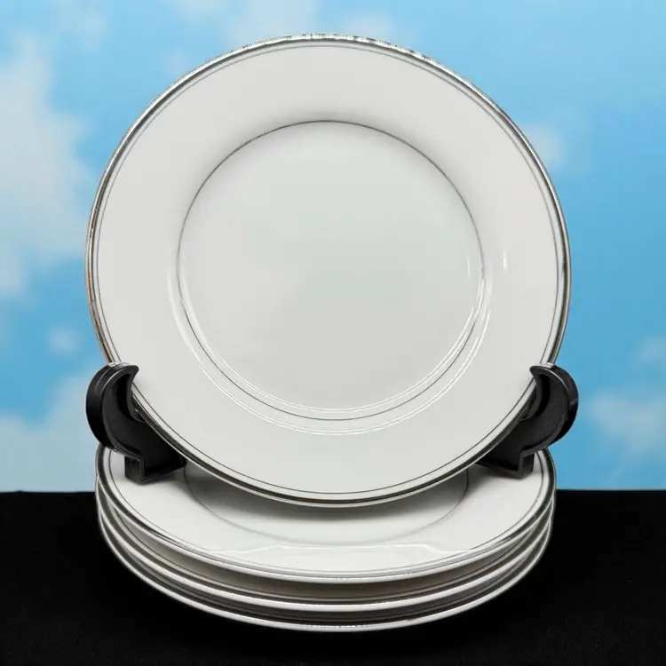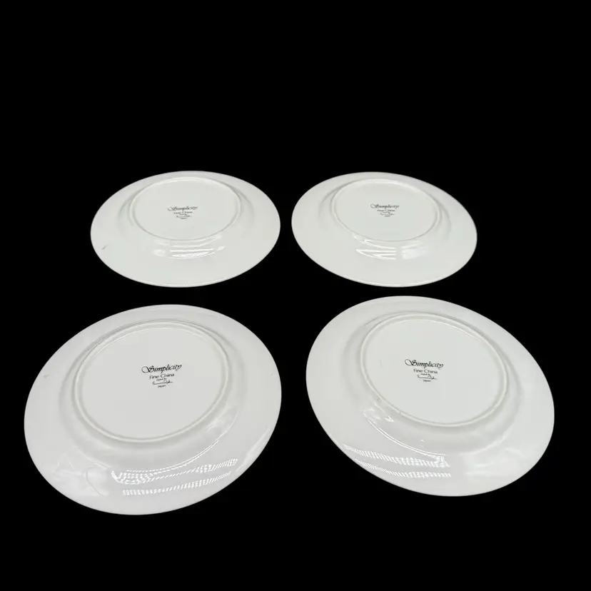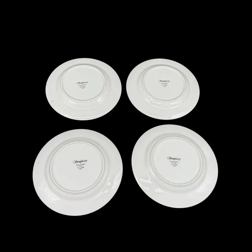 The Simplicity Fine China 4 Bread & Butter Plates are a vintage set made in Japan, featuring a timeless white and silver trim design. These 6.5" porcelain plates are perfect for all occasions and come in a set of four, making them a versatile addition to any table setting. With a contemporary style and a vintage original production, these bread plates exude elegance and sophistication, ideal for those who appreciate the artistry of pottery.
