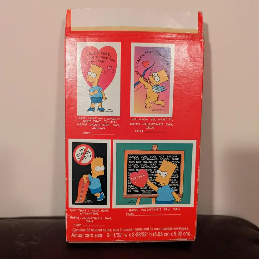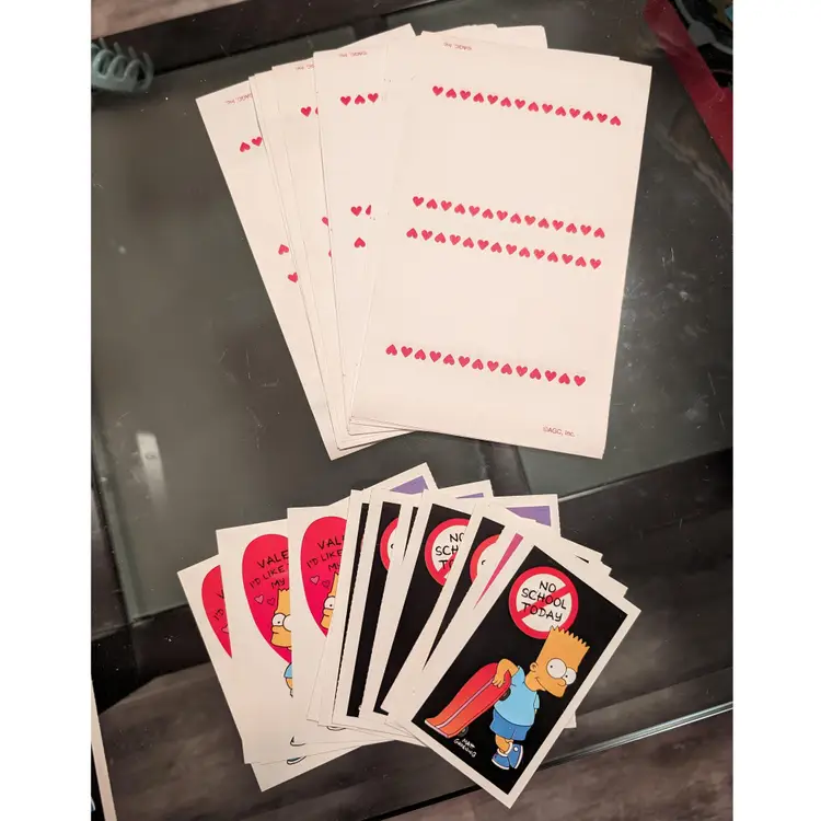 Disclaimer: box has been opened and set is not complete. Included with this lot is the original box, a stack of various valentine cards (4 different images), and the corresponding envelopes. The cards and envelopes themselves are in great condition! Unfortunately the box has been ripped open and damaged, but is more of a keepsake than anything. Be sure to check out my other listings for more Simpsons merch!