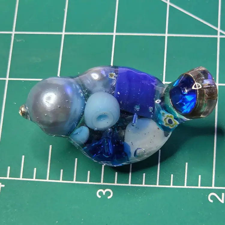This gal is made with a silver seed bead beak, a blue pearlized bead from a necklace for her head, a body made from just about every blue bead from my stash and a tail made from beads from a bangle bracelet that we used to make the original Singing The Blues Bird.