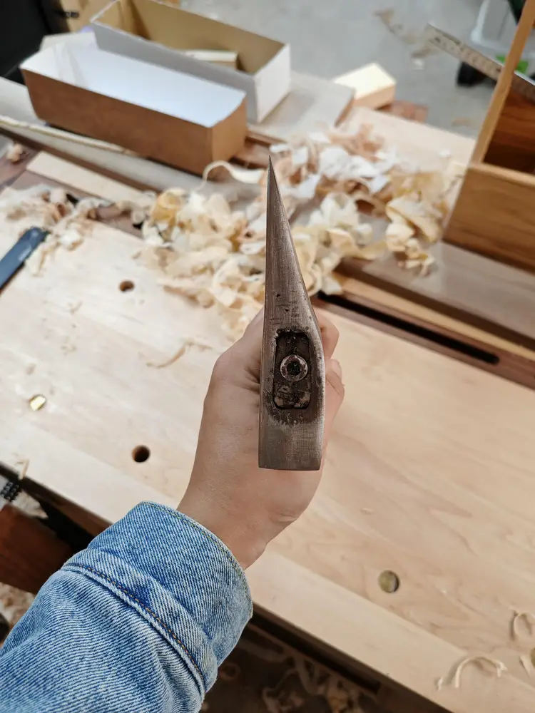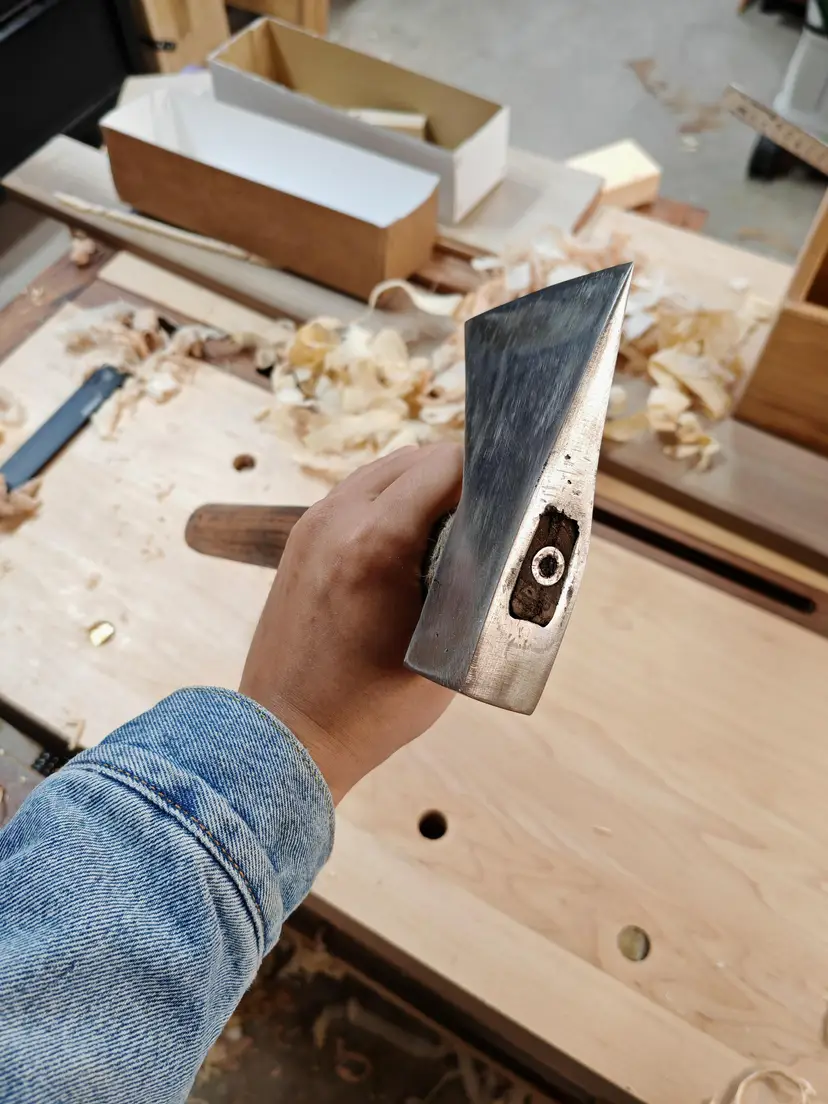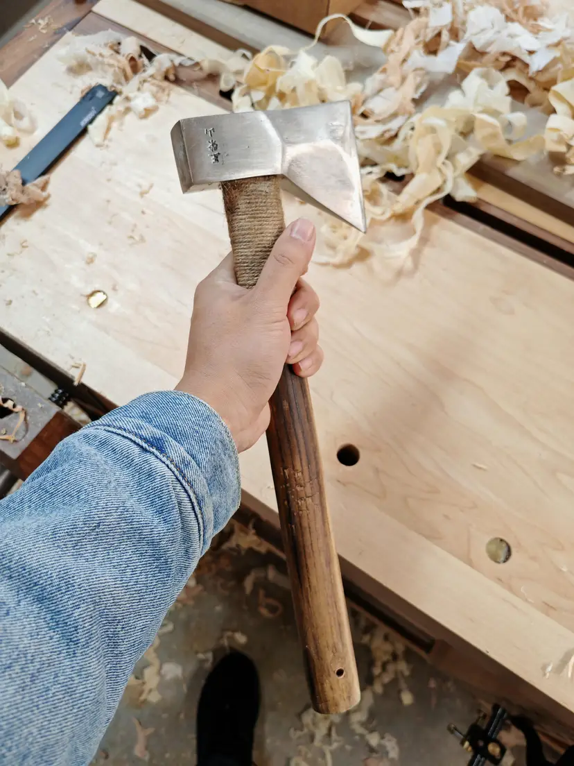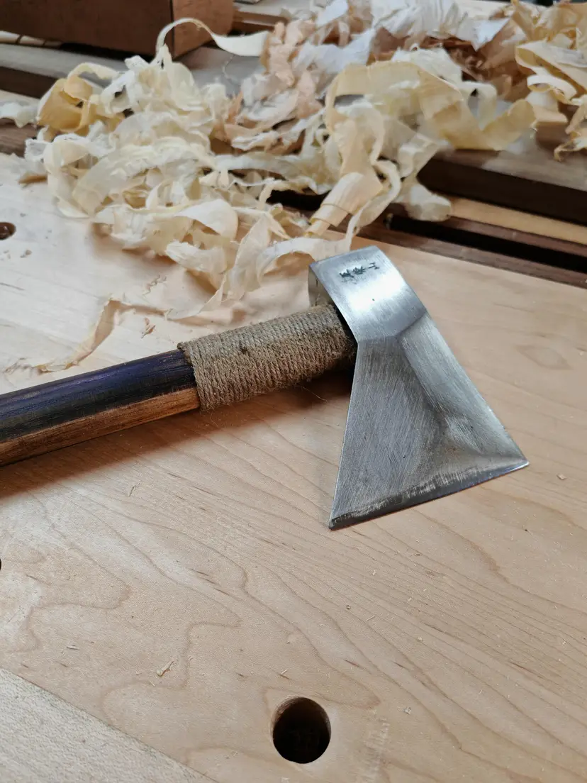 1.5 lb Chinese-style woodworking hatchet, single bevel. Made by Master Wangrongshan (王荣山). Sharp and ready for use.