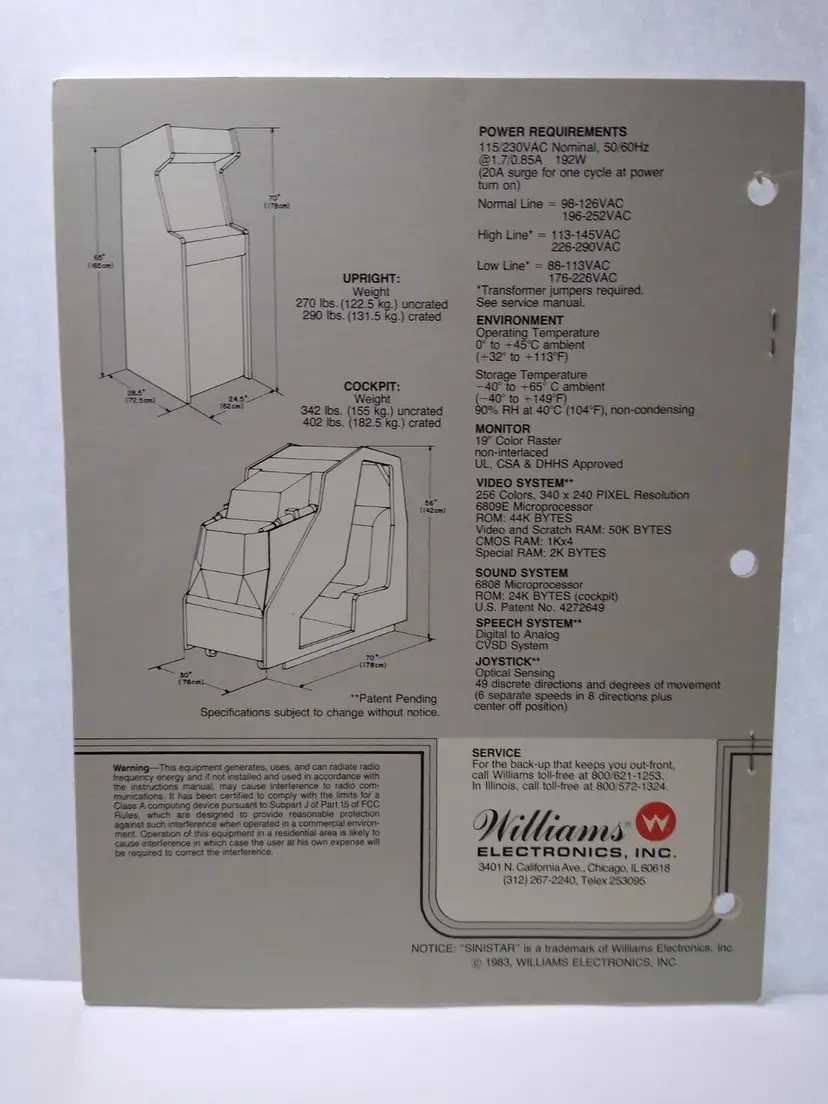 Arcade: Manual Modified Item: No Country/Region of Manufacture: United States Year: 1983 Game Title: Sinistar Brand: Williams