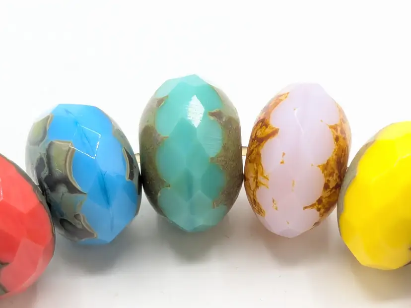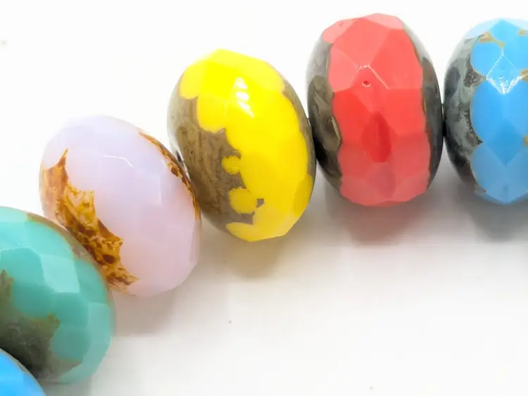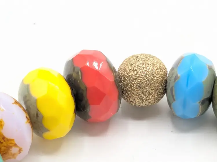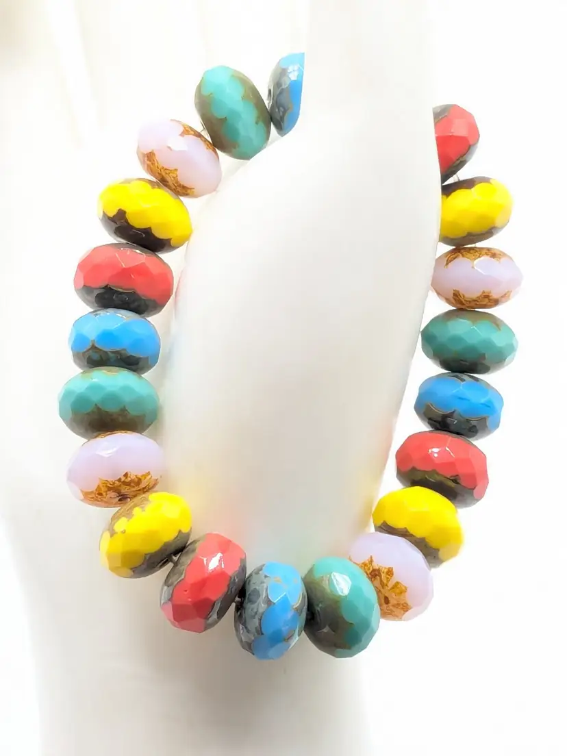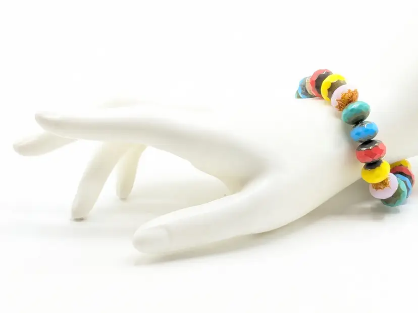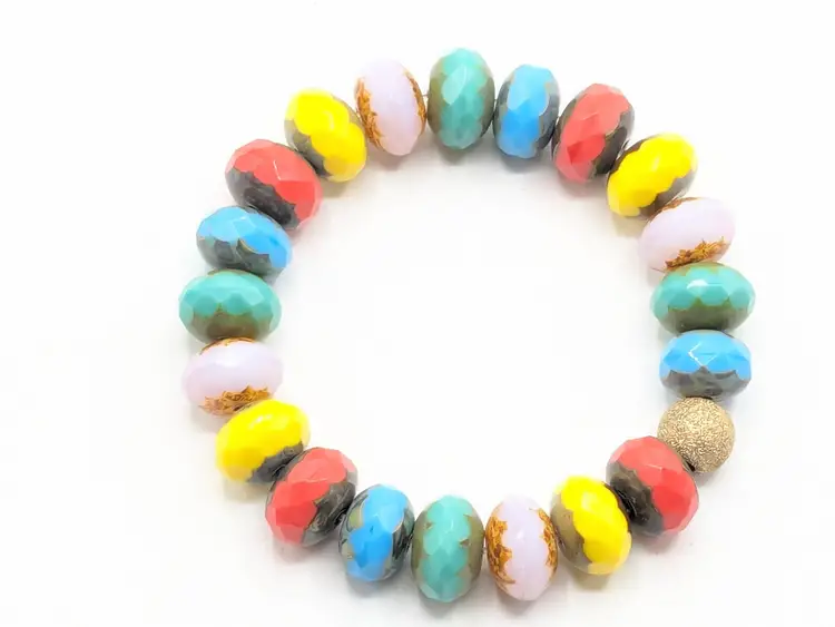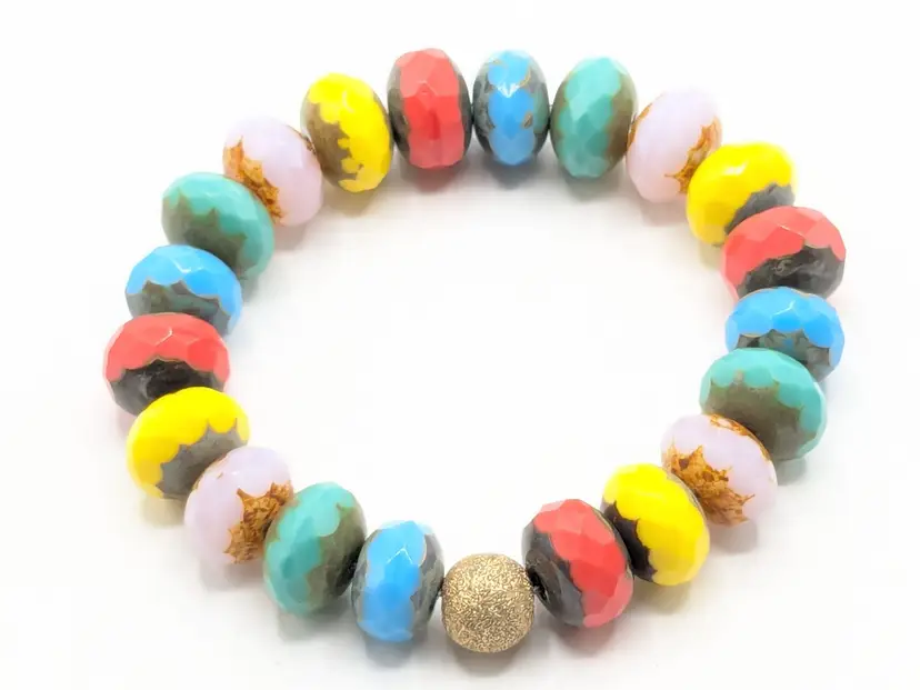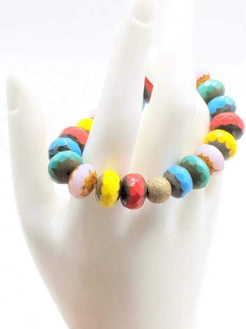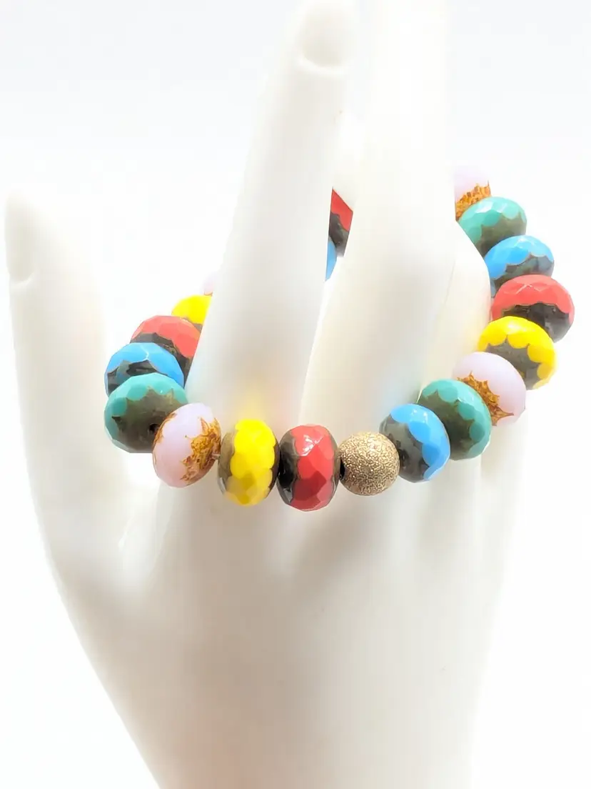 Reminds me of the candy bracelets worn when we were young! Good condition. Colorful faceted rondelle Czech glass beads with a gold-filled stardust accent bead. Sits at a 6 1/2 but is a stretch bracelet. EN3