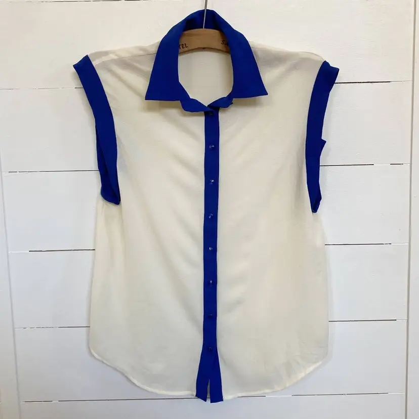 Sisley Sleeveless button up dress top Imported from Italy Semi-sheer Cream with blue trim and buttons all the way down shirt features contrast trimming and a traditional collar. Trim with 9 jeweled button placket. Sleeveless with trim at sleeves. Finished hem. Unlined. Relaxed fit. Lightweight. Loose fit, slightly textured 98% Polyester 2% Elastane Size XS Excellent Pre-owned Condition Measurements taken flat: Armpit to armpit: 20" Shoulder to hem length: 27" Designed in Italy, Imported From a sustainable brand Open to reasonable offers Fast shipping Bundle & Save *Crossposted Smoke free home Tags: Imported, Italy, Designer, Trends, 90's, Y2K, Preppy