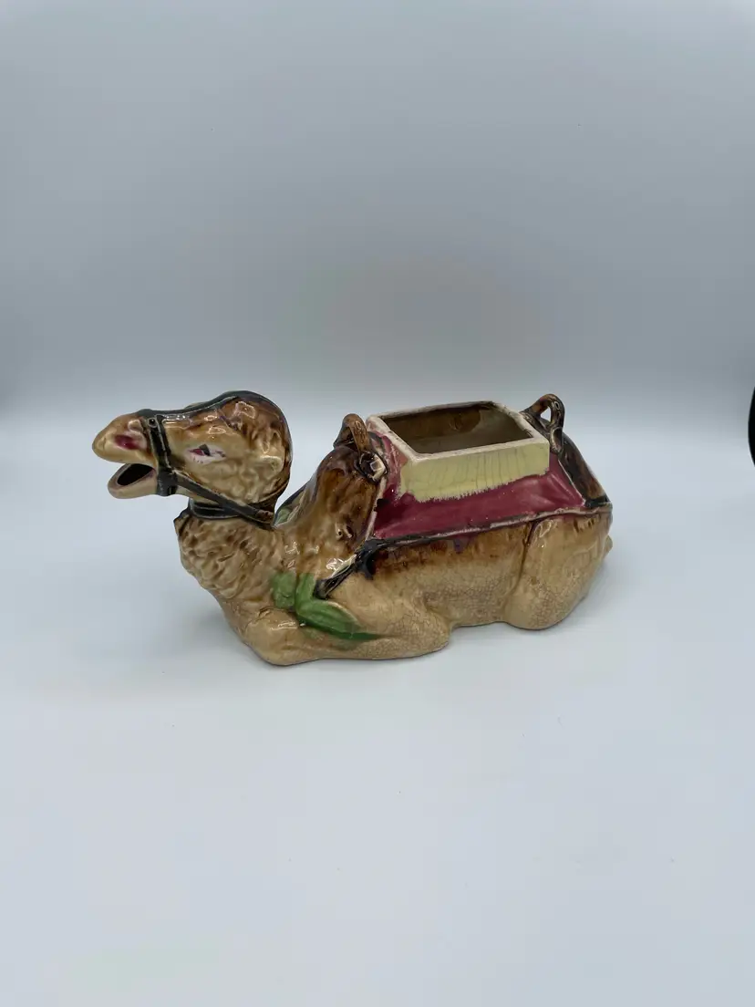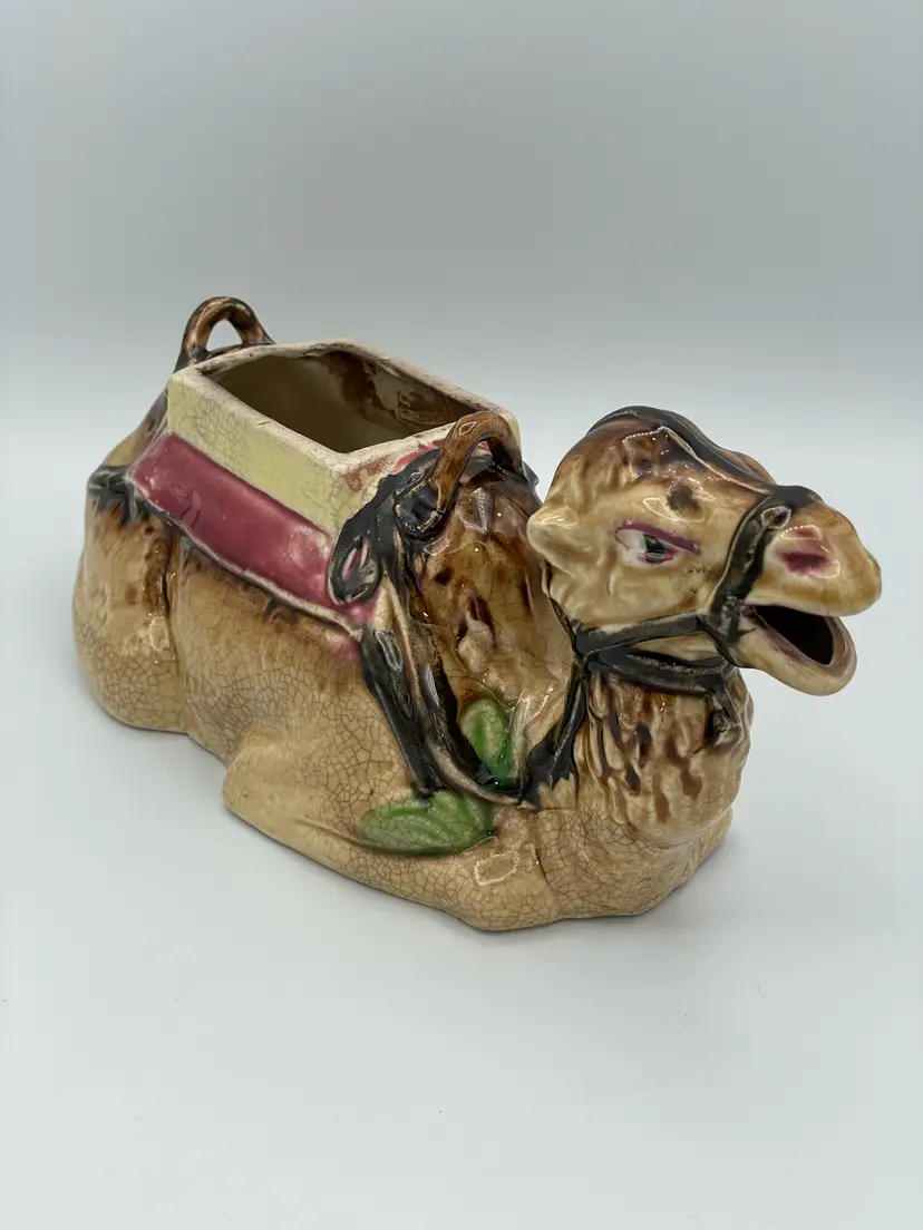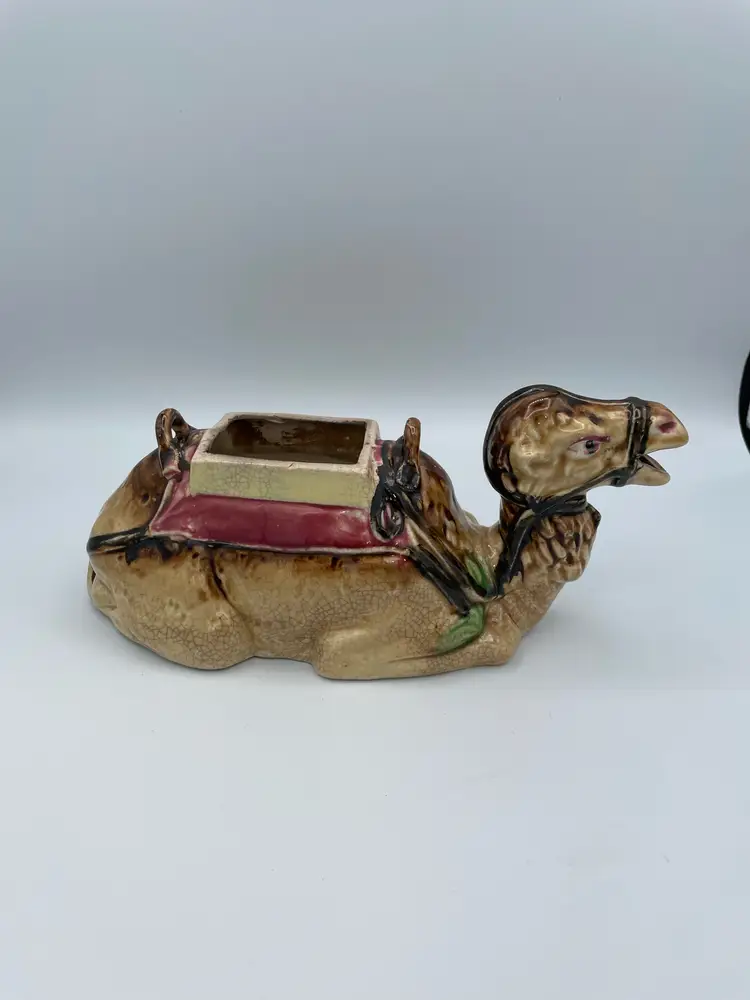 Vintage Japanese Sitting Camel. Meant to be a teapot however is missing lid and handle. Would make a great planter (faux plant - air plants). Due to Age Has Crazing Throughout. 10" Wide.