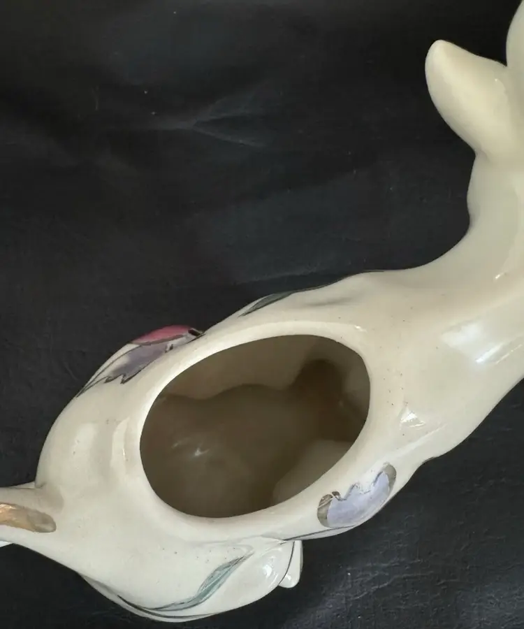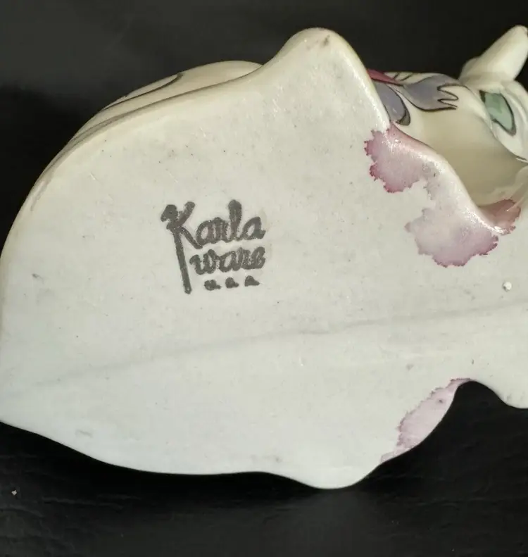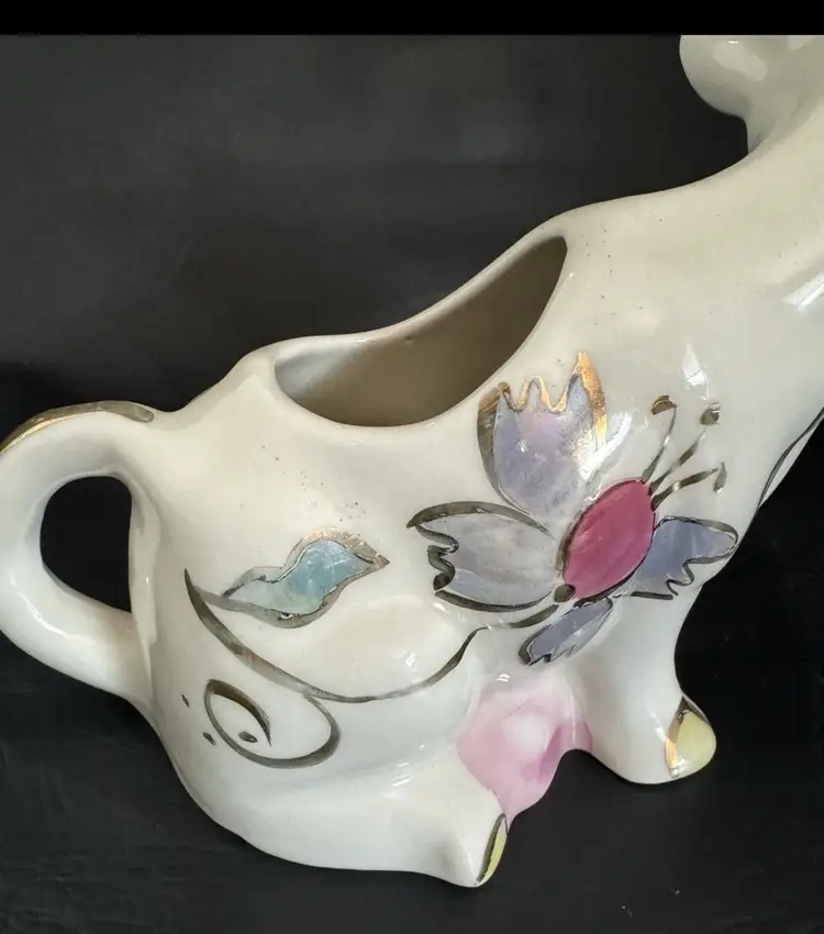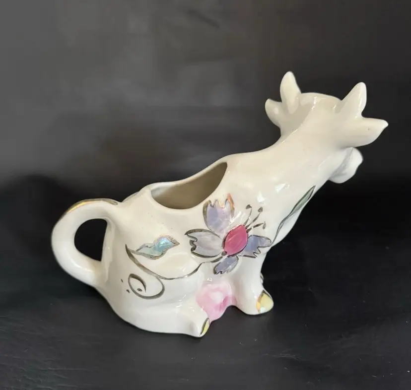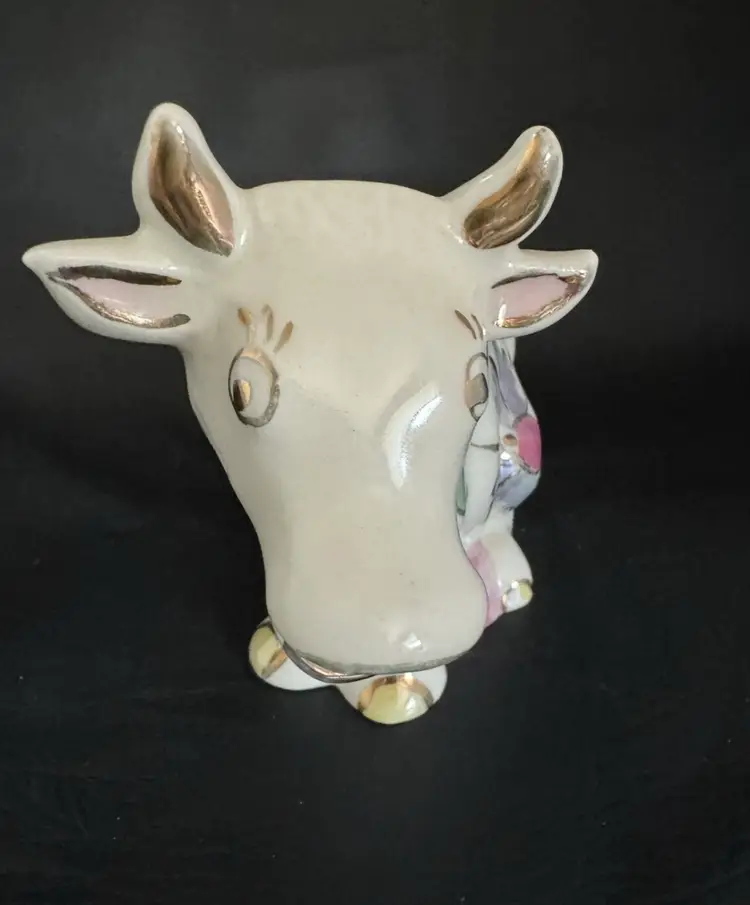 This adorable sitting cow creamer by Karla Ware Pottery is a must-have for any collector or lover of farm-themed decor. Made of high-quality porcelain, this creamer is beautifully hand-painted with a gold finish. It is perfect for adding a touch of whimsy to your morning coffee or afternoon tea.