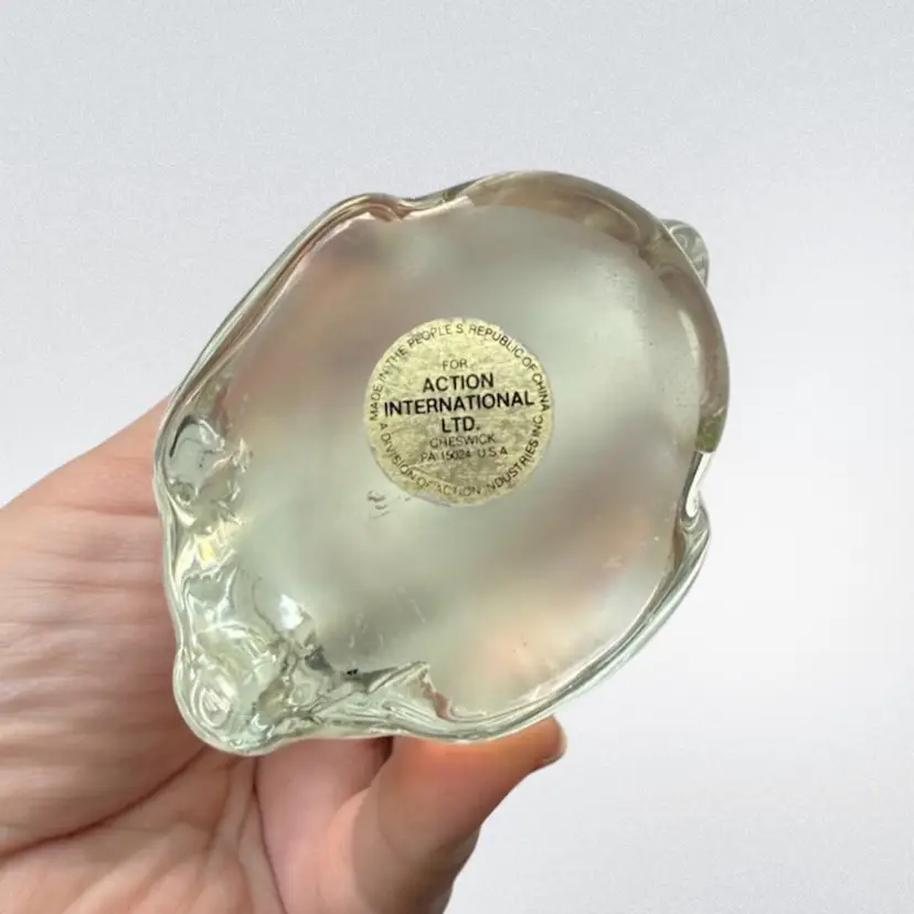 Cute solid glass paperweight with sticker on the bottom. Minor scratches.