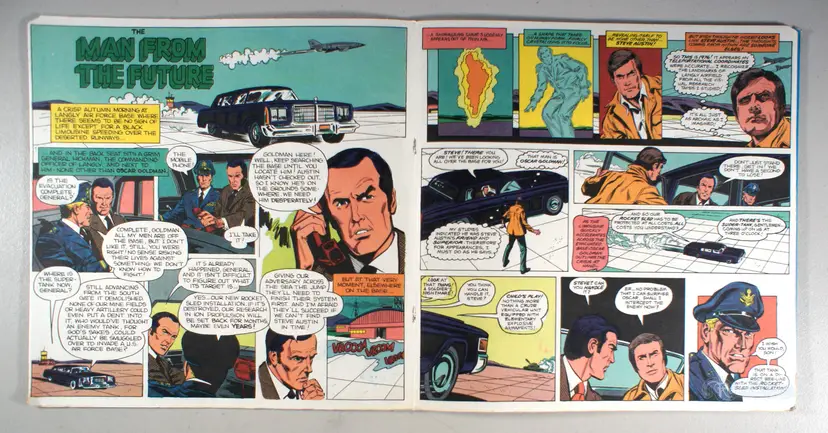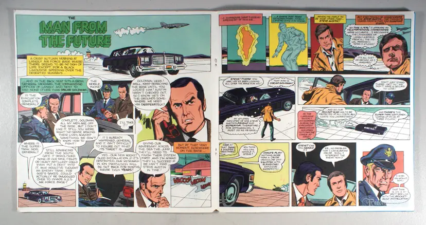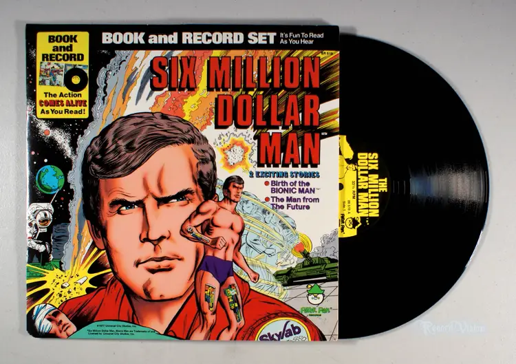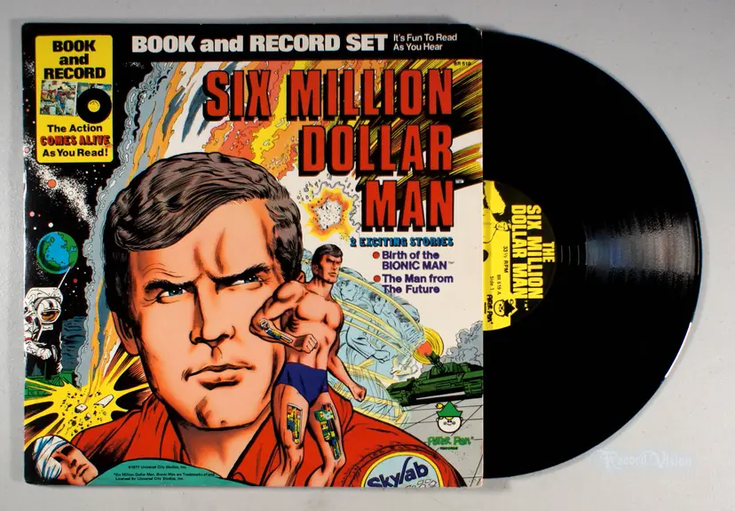 This Six Million Dollar Man Book & Record set features two exciting stories: Birth of the Bionic Man and The Man from the Future. Both stories are also told in illustrated in full color comic book format so you can read along and follow the action with the record providing dialogue, sound effects, music, and more!!!
