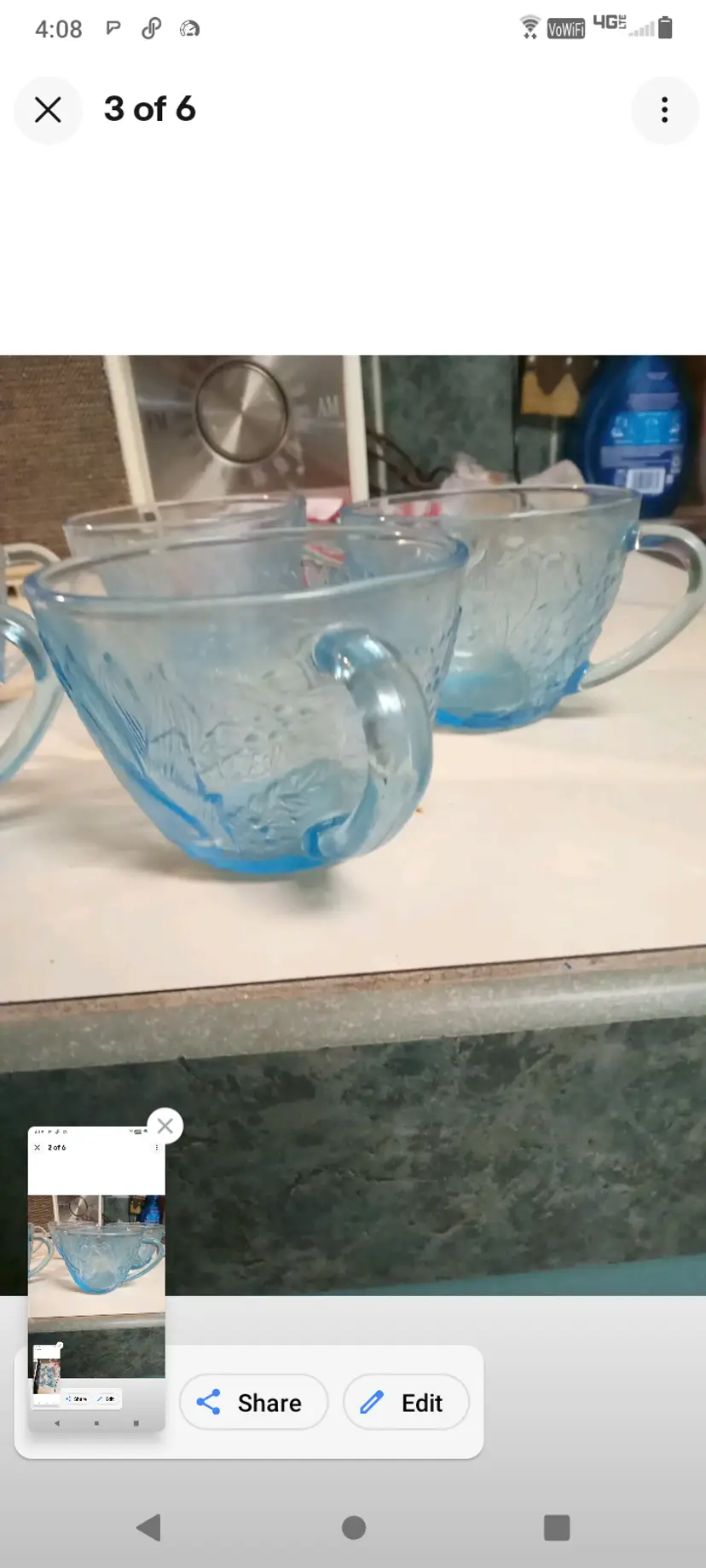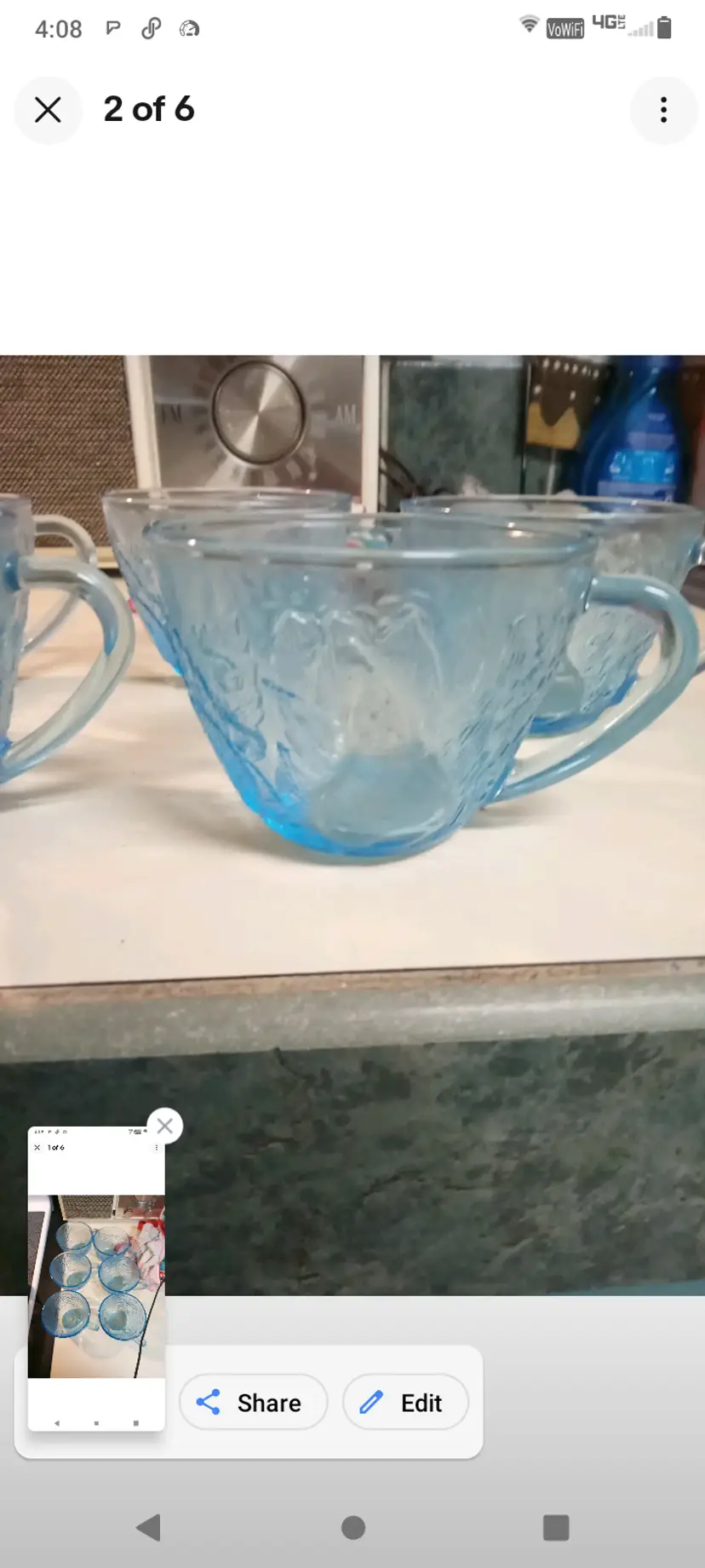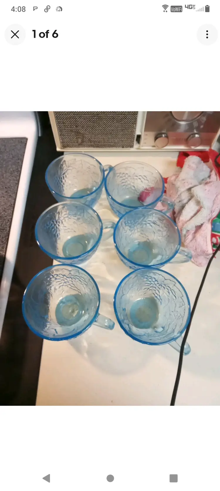Add a touch of Mid-Century Modern to your collection with this vintage six-piece set of Indonesia Ice Blue Glass Teacup Coffee Mugs. The round mugs are made of pressed glass and feature an embossed fruit pattern on a glossy finish. Each mug has a capacity of 6 oz and stands at 2 5/8" tall with a diameter of 3 1/2". The production technique is fused glass and the mugs are retired, making them a unique and original addition to your decorative cookware, dinnerware, and serveware collection. The set is perfect for all occasions and is a great way to showcase your love for fruits.
