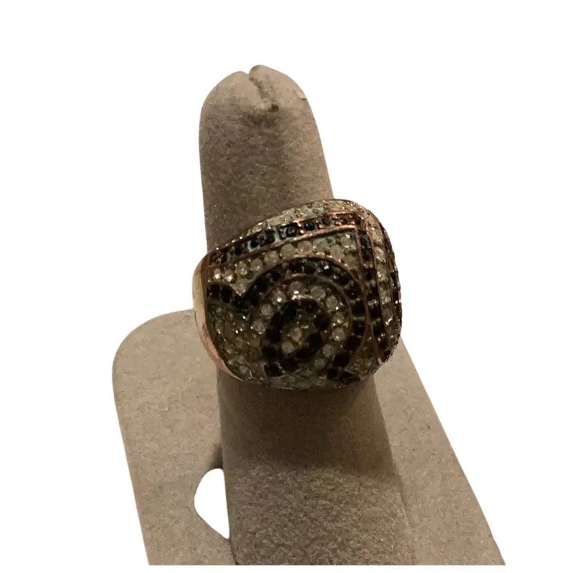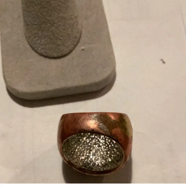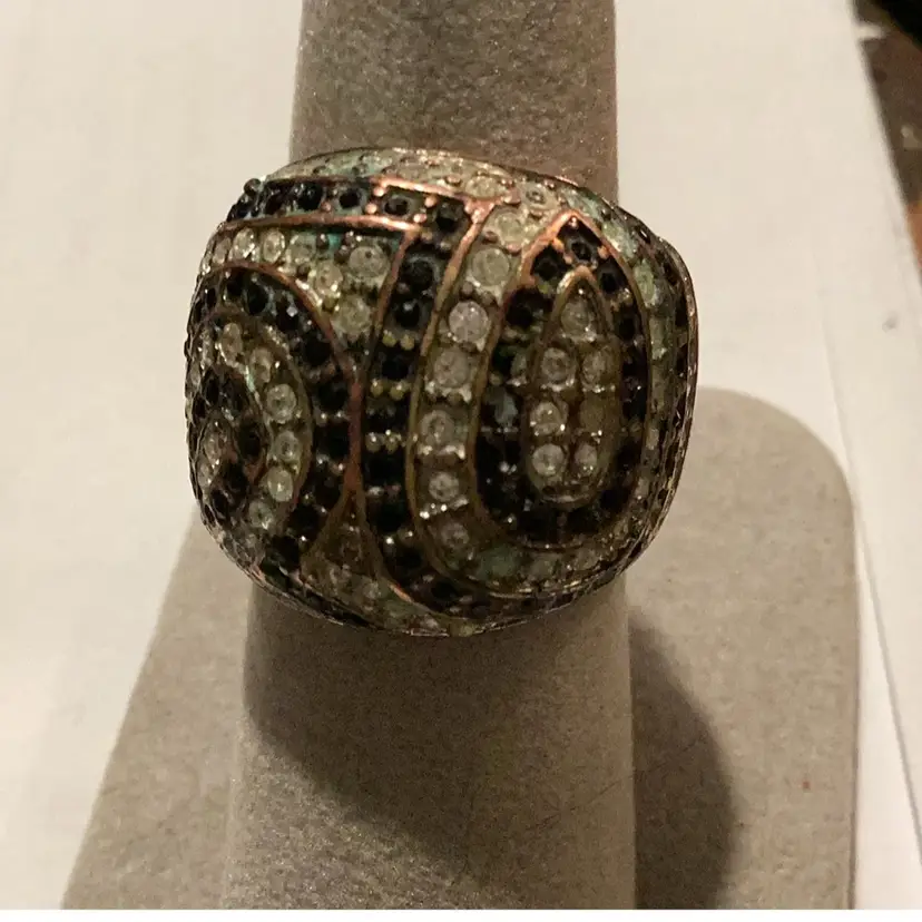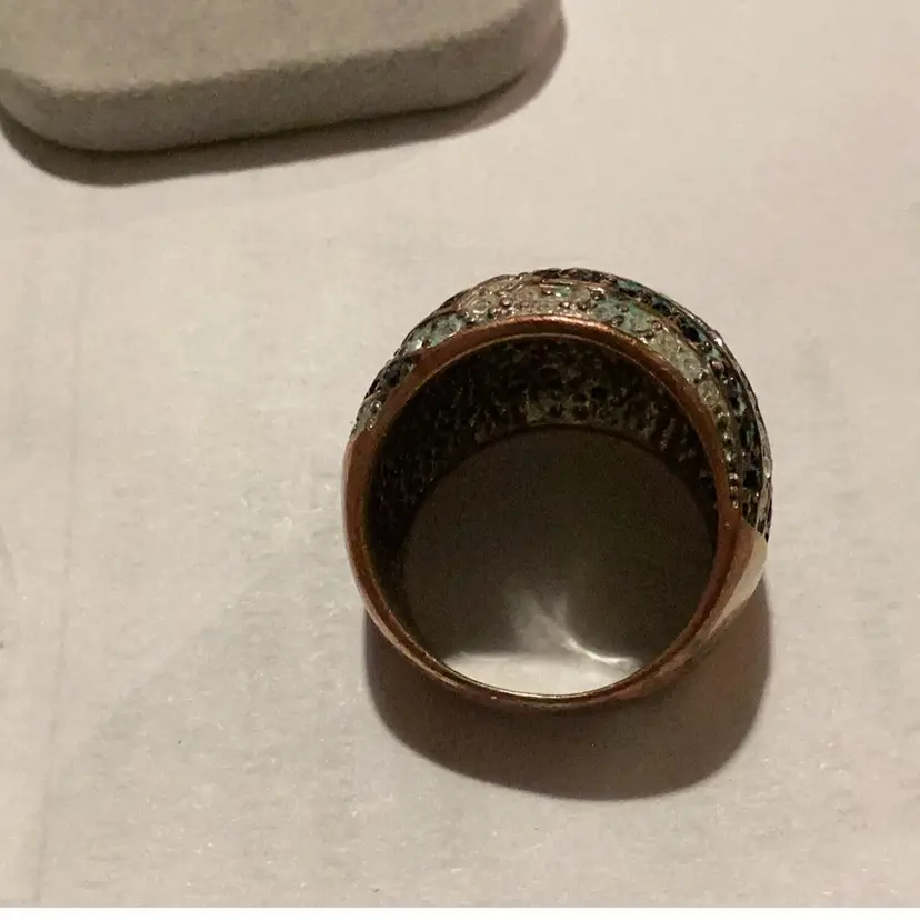 This ring is a size 7 1/2. It’s got all kinds of little rhinestones on it. There is some rust because it’s believed. I think this is copper and copper rust to green just like the Statue of Liberty.