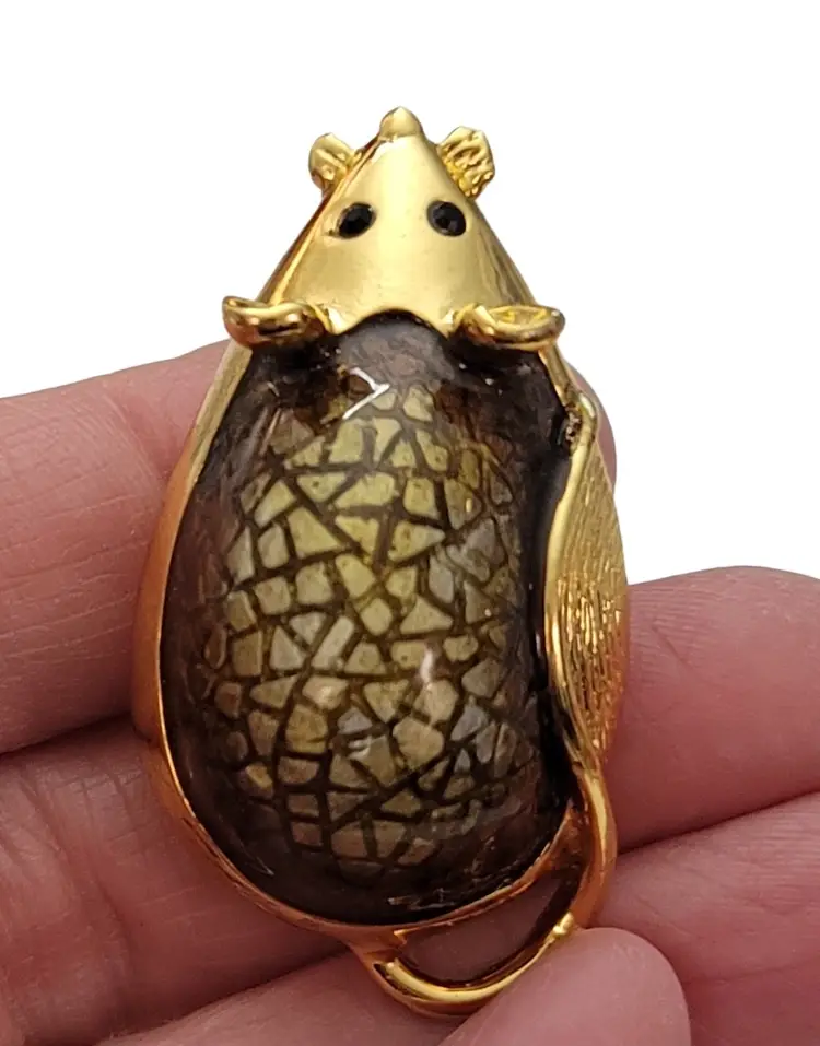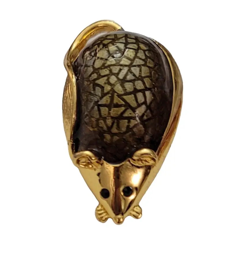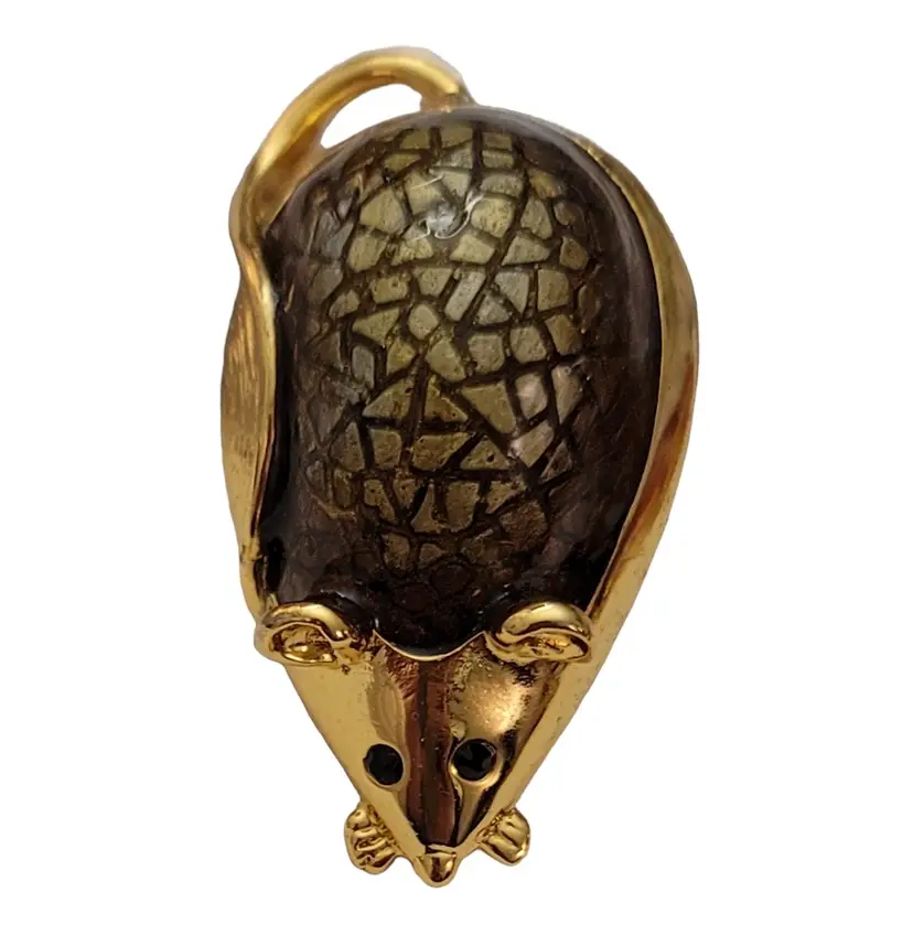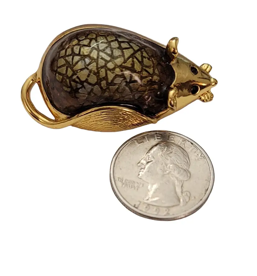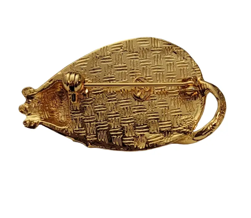 This SJ Mouse Brooch is a charming accessory that will add a special touch to your ensemble. It features a mouse figure in a radiant gold tone, with green textured resin enamel back with a glossy finish. It measures approximately 1.7 inches in width and 1 inch in length. The back of this pin has a textured line pattern and is marked SJ. Finished with a locking pin that functions properly, ensuring it stays securely attached to your clothing or accessory throughout the day. This brooch is easy to wear any time of year, and will certainly impress.