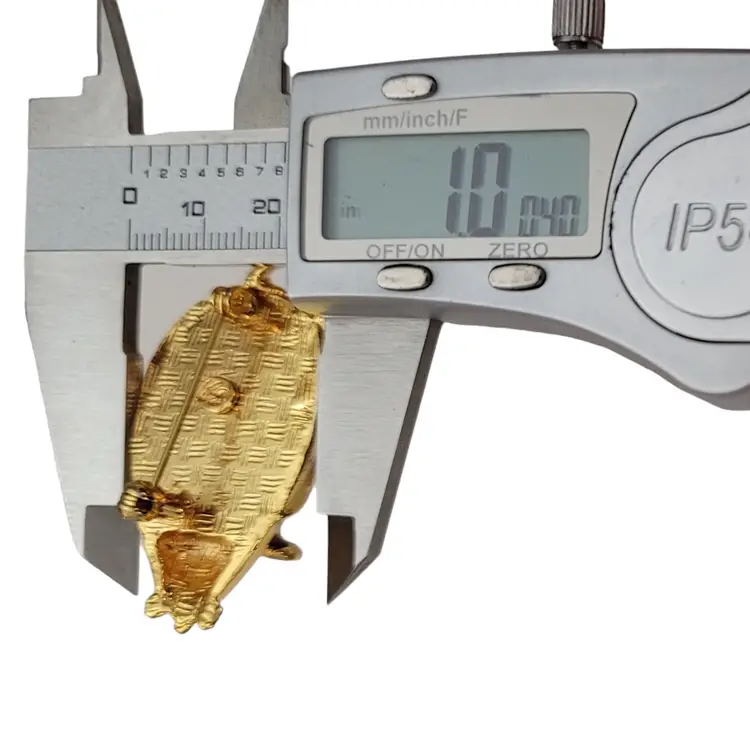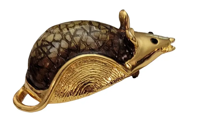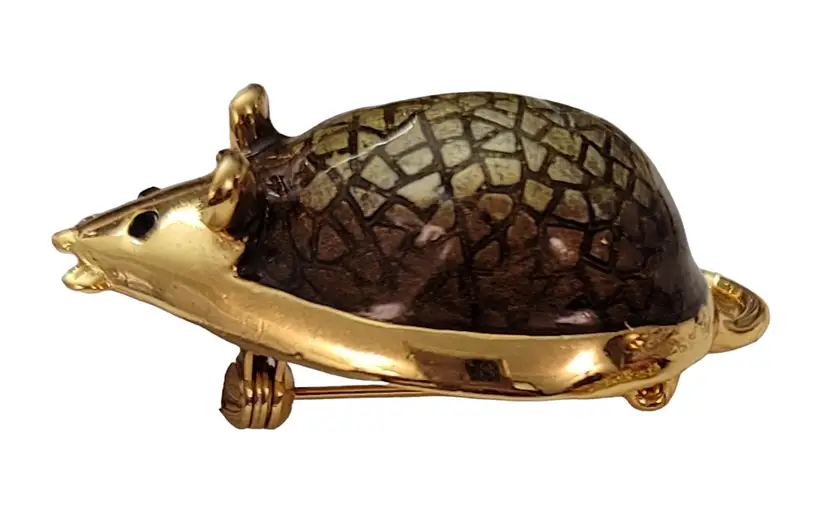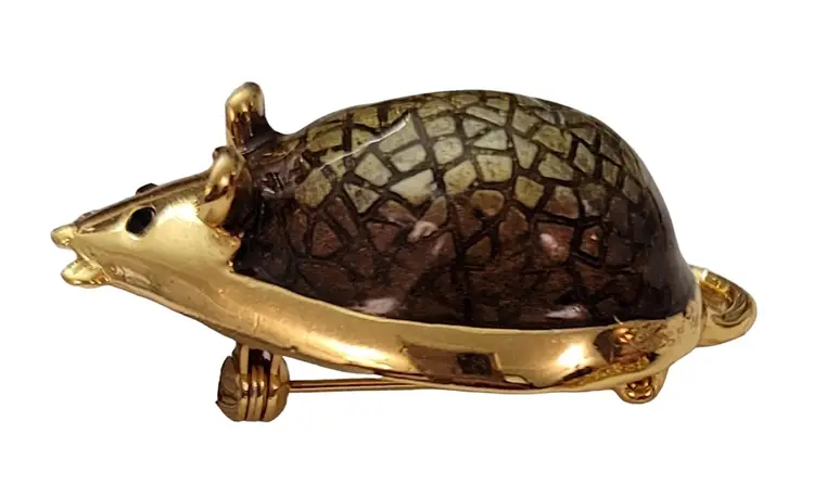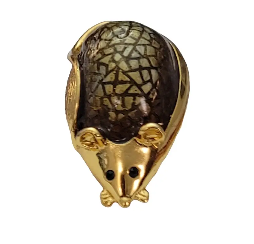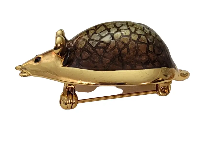 This SJ Mouse Brooch is a charming accessory that will add a special touch to your ensemble. It features a mouse figure in a radiant gold tone, with green textured resin enamel back with a glossy finish. It measures approximately 1.7 inches in width and 1 inch in length. The back of this pin has a textured line pattern and is marked SJ. Finished with a locking pin that functions properly, ensuring it stays securely attached to your clothing or accessory throughout the day. This brooch is easy to wear any time of year, and will certainly impress.