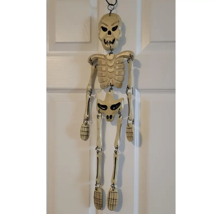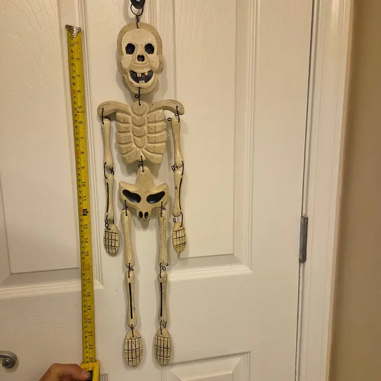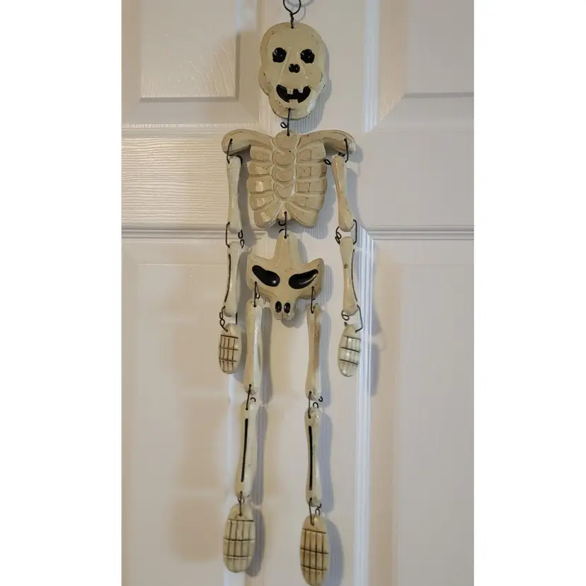 Vintage halloween skeleton made of wood. Two sided. One with scary face one with happy face.