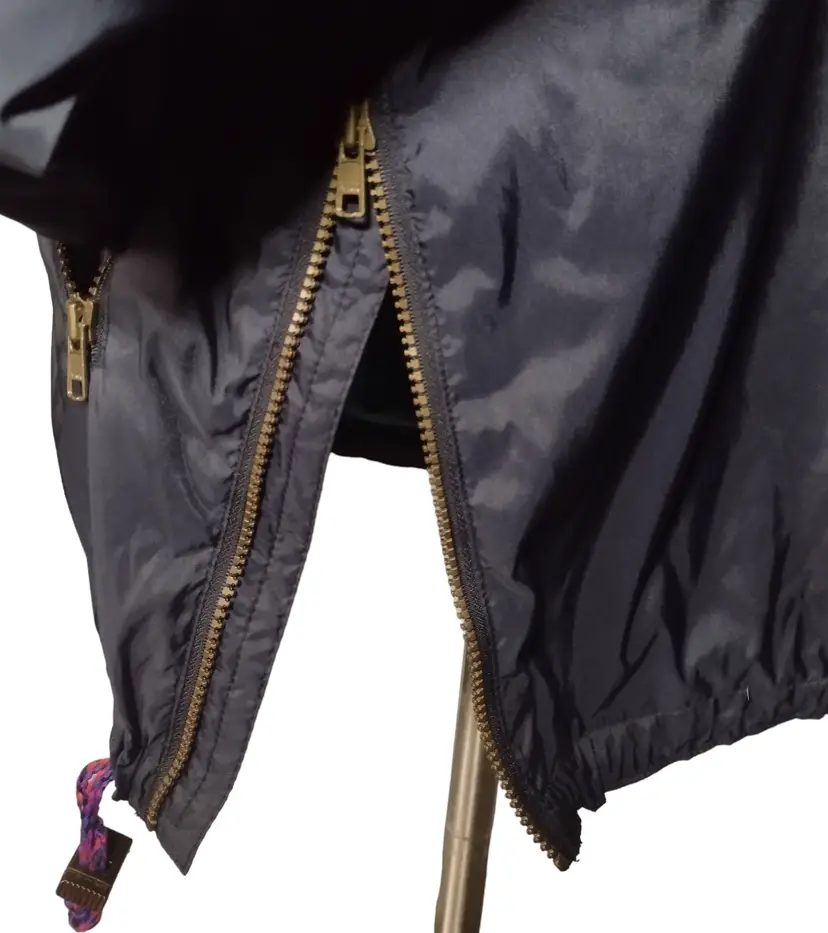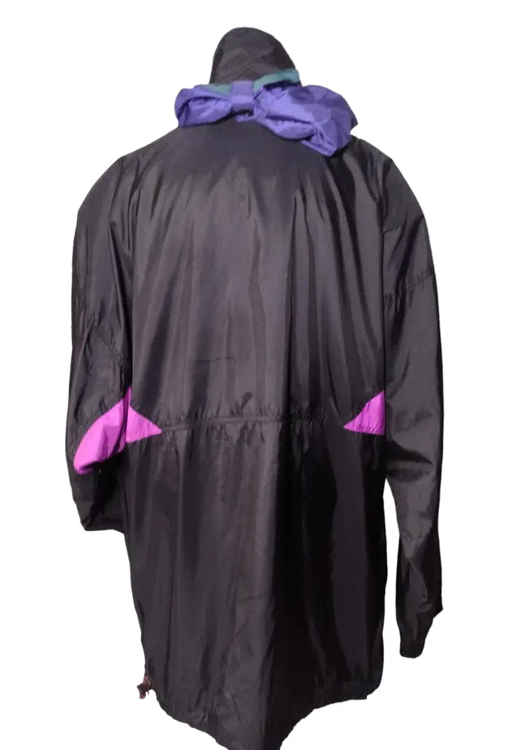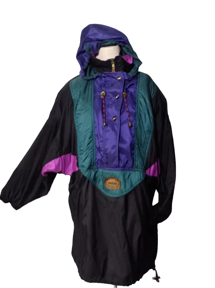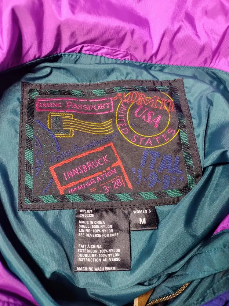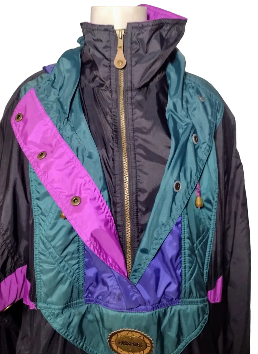 Item is pre-owned and in very good condition with no holes, tears or stains. Smoke free environment. This is a very nice retro ski jacket with raglan sleeves complete with shoulder pads, a front zip with rhinestone snaps. There is venting on the underarms and the hood can be folded when nit needed. There is also a side zip. It was hard exactly to measure the chest as these sleeves are raglan, but it approximately measures 25" x shoulder to shoulder measures 22" x shoulder to hem measures 28".