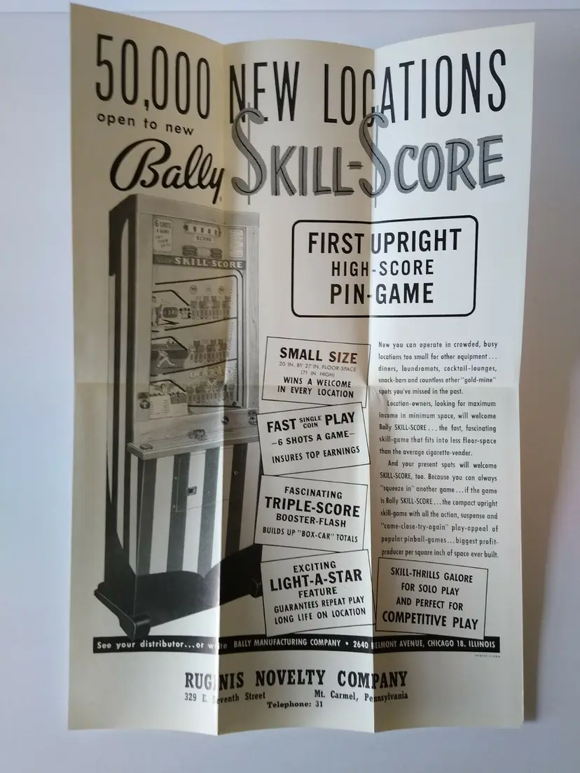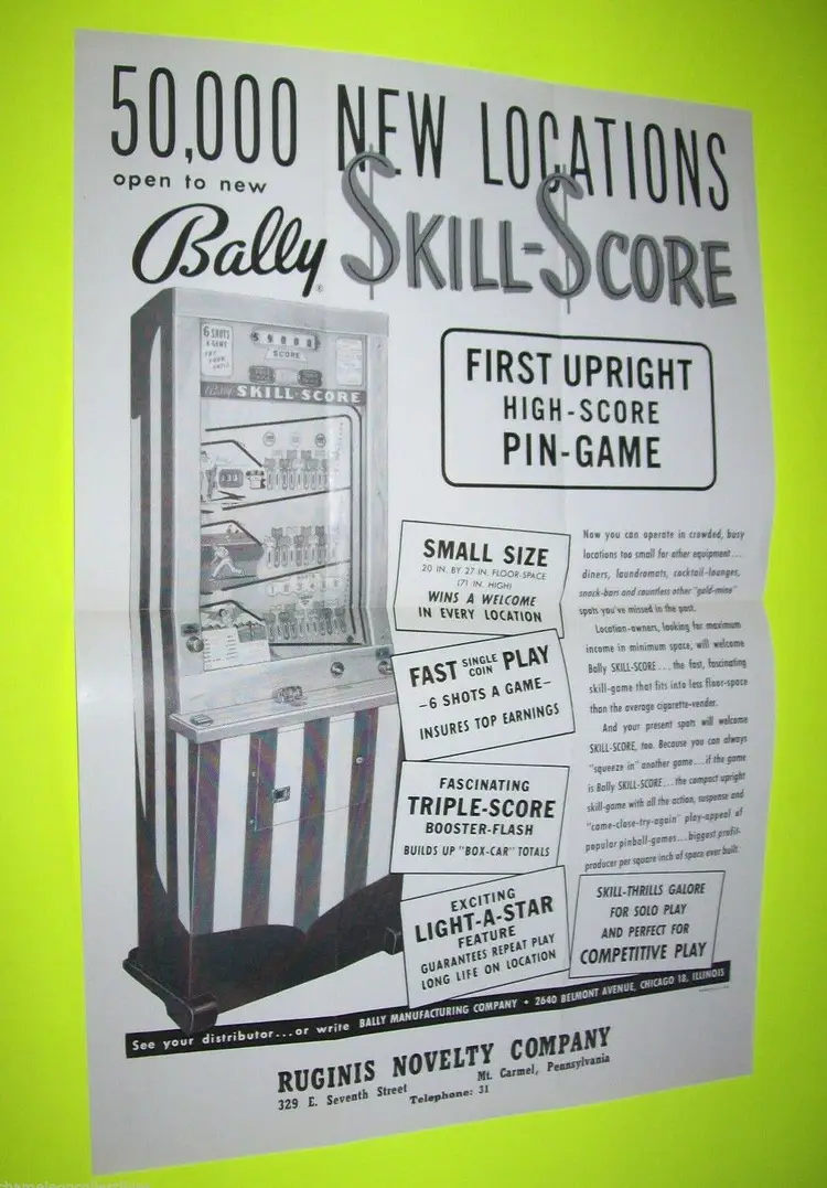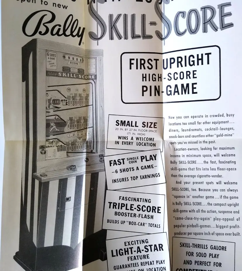 Brand: Bally Year: 1960 Game Title: Skill Score Original/Reproduction: Original Country/Region of Manufacture: United States Modified Item: No Arcade: Flyer