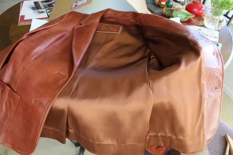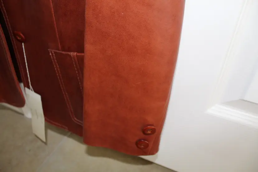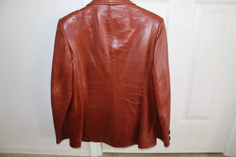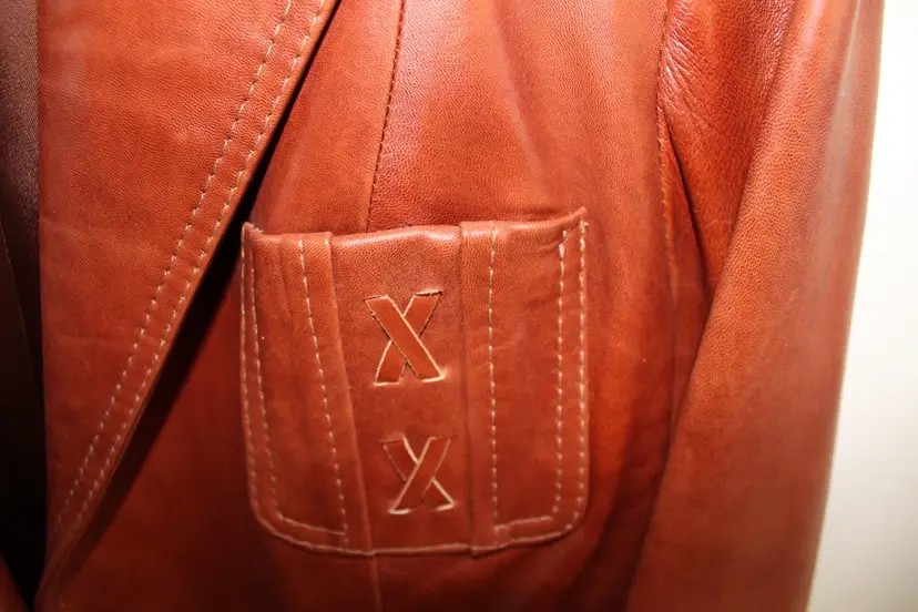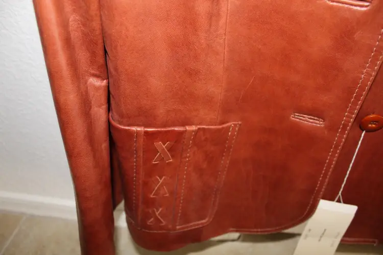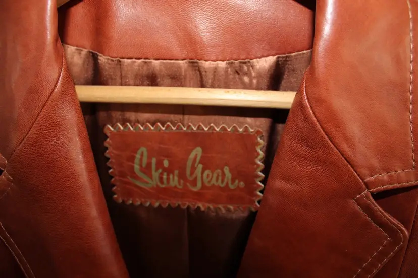 A sophisticated cognac-colored leather blazer by Skin Gear, featuring unique 'X' cross-stitching on the patch pockets and a classic two-button closure. Handcrafted in Mexico, this garment is brand new with original tags, showcasing the supple texture of high-quality Napa leather in a timeless 1970s-inspired silhouette. Made from leather in Mexico, this jacket features a tailored fit and a size 11/12, catering to those who prefer a more oversized, casual look. Perfect for adding a touch of vintage flair to any outfit, this original piece from the 1970s is a must-have for fashion-forward women looking to make a statement.