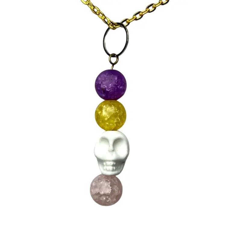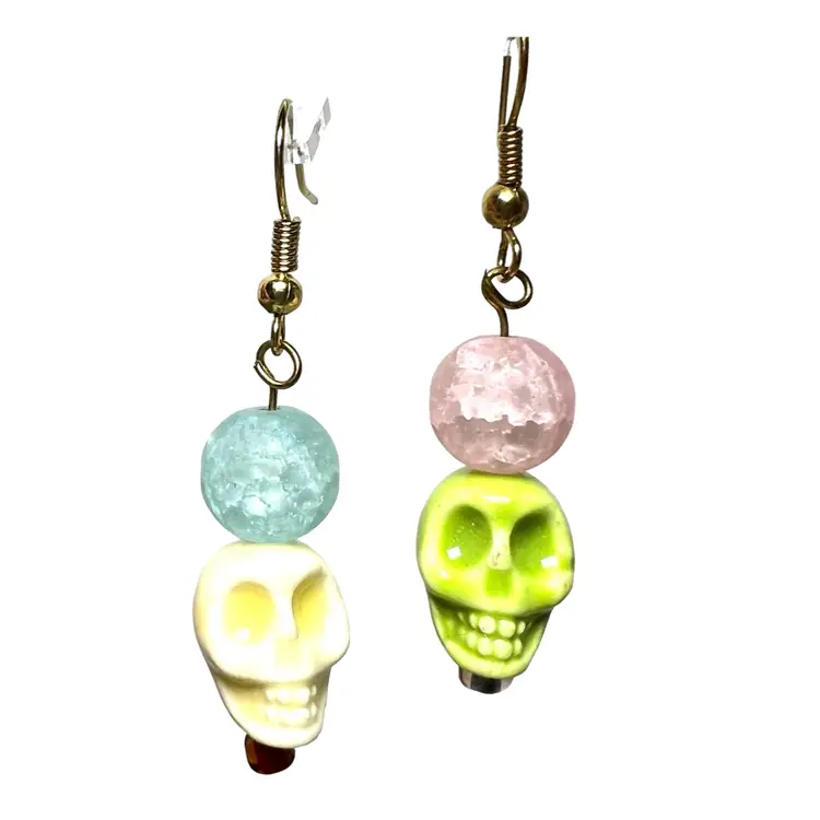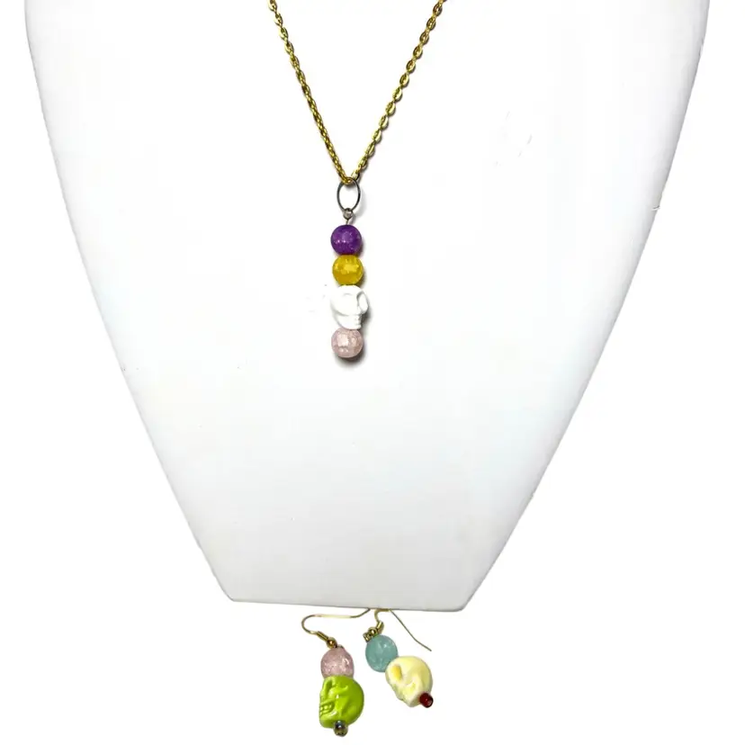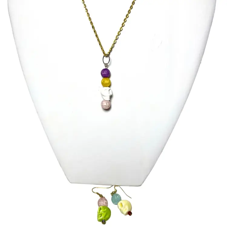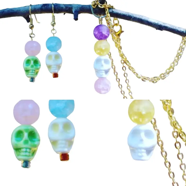 Handmade by me 🫶 Pastel colored skull charms adorn this beautiful Halloween / Day of the Dead jewelry set. __Gold-colored french hooks. __24" Gold-colored rolo style necklace chain.