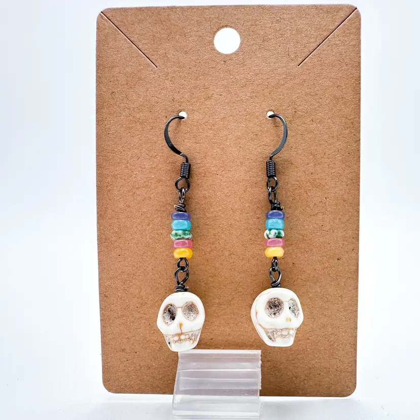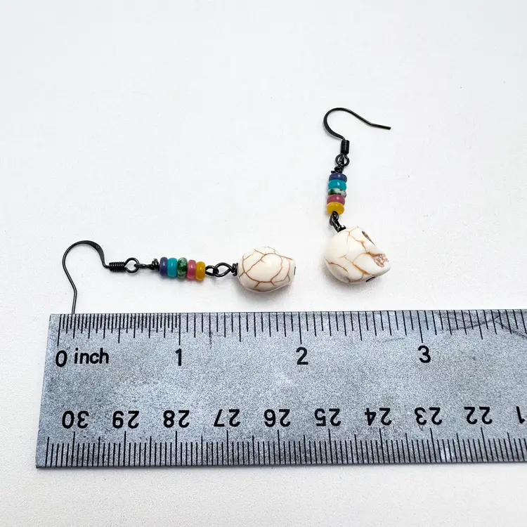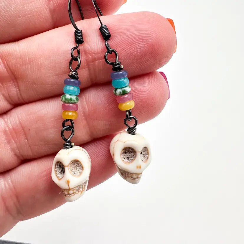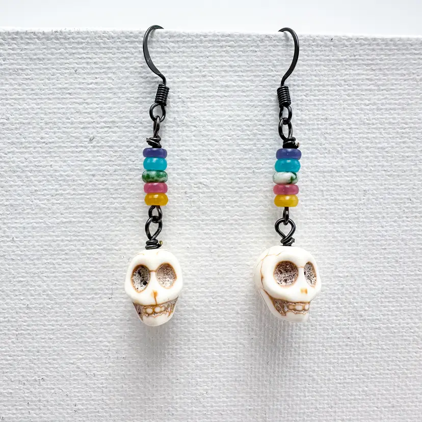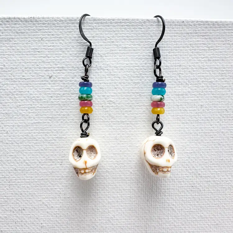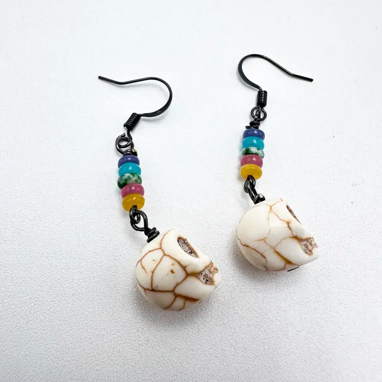 New handmade condition, see all photos Features white stone skull bead and multicolor disc bead accents Gunmetal tone findings