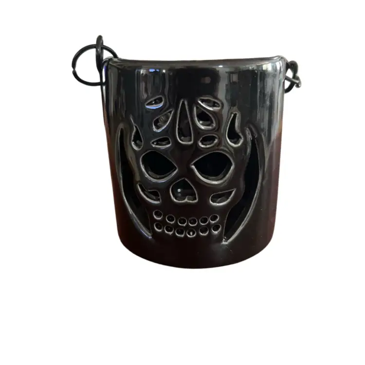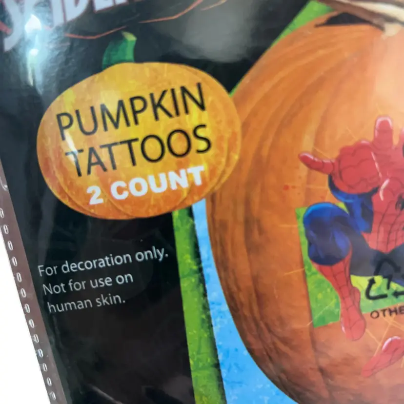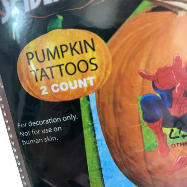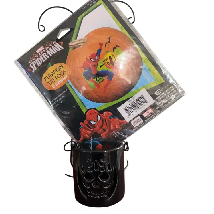 Skull votive holder measures approximately 3 1/4 inches tall and 3 inches in diameter. Mint condition. Included is the ultimate Spider-Man pumpkin tattoos! What an easy way to decorate a pumpkin!