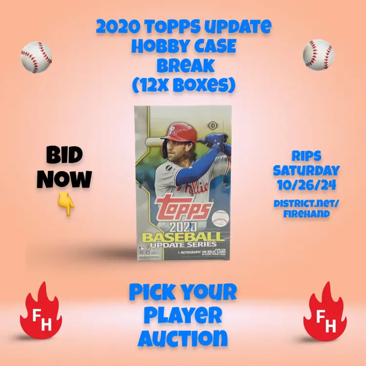 You are bidding on all the cards of the player listed in the title in this HOBBY Case (12x Hobby Boxes) of 2020 Topps Update Series Baseball Cards. Base Set "Combo Cards" have their own unique spots and will not be split by players. Auctions end Friday night 10/25 & Case will be opened LIVE on Saturday afternoon 10/26. Opening will be viewable & simulcast on Firehand Cards District as well as YouTube. US Shipping is $5.00 for your first auction spot won and only $.25 per additional spot won after that! Any spot won where no cards of the player are found in the box will receive a bonus card or pack from the Firehand collection. Any multi-player cards, relics, or autographs that do NOT have a combo card spot will be assigned by draw between the spots depicted on the card. Any hit pulled (Cut Signatures, Sketches, Reverence etc) of a player who is NOT listed in the auction will be assigned by draw between all participants.