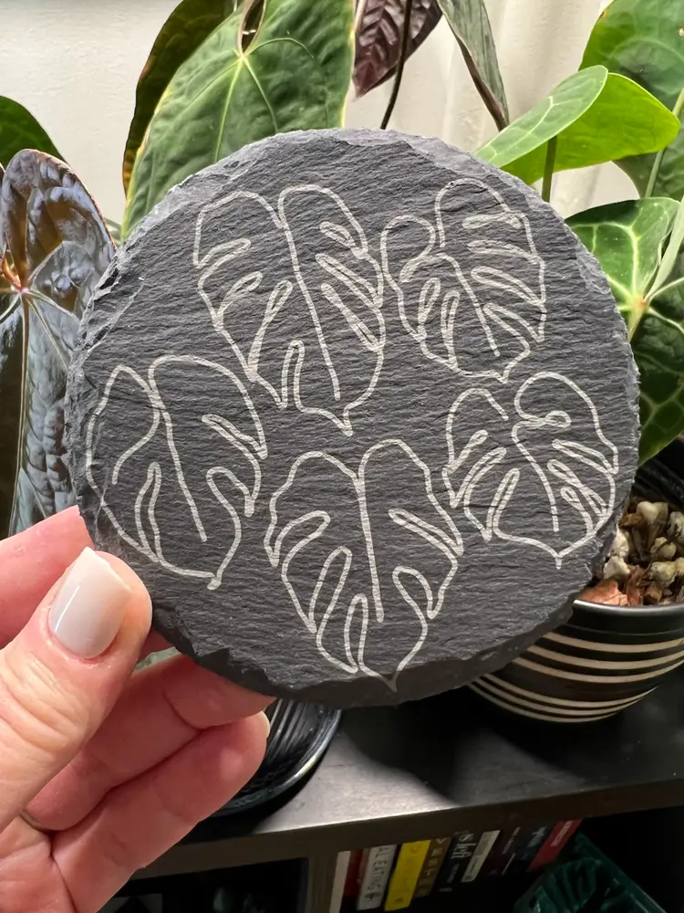 A clean, modern coaster crafted from natural slate and laser-engraved with a minimalist Monstera leaf design. Measures 4” in diameter and 1/4” thick. Felt pads on the bottom protect surfaces and keep the coaster in place.