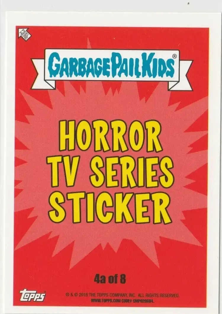 Related ID: overourheadz Card Size: Standard Autographed: No Set: Garbage Pail Kids - Prime Slime Trashy TV Subset: Horror TV Series Sticker Store ID: American Pop Cult Year Manufactured: 2016 Material: Card Stock Franchise: Garbage Pail Kids Original/Licensed Reprint: Original Vintage: No Series: 2016 Prime Slime Trashy TV Type: Non-Sport Trading Card Language: English Mononym: overourheads Manufacturer: Topps Features: Base Set, Sticker Genre: Comedy, Parody, Satire, TV & Movies Card Type: trading card sticker Country/Region of Manufacture: United States