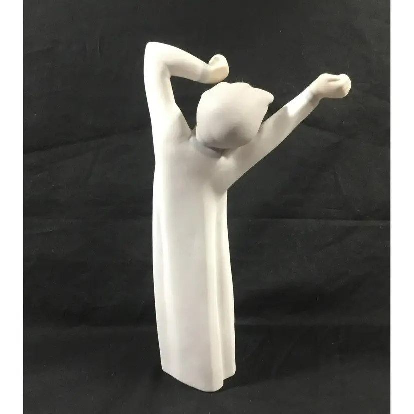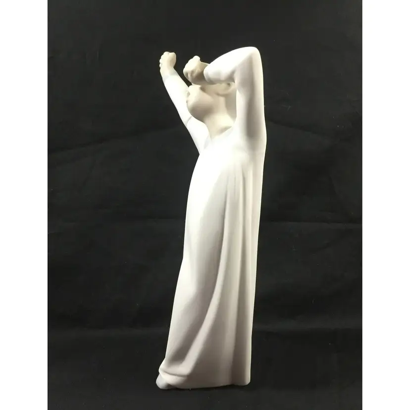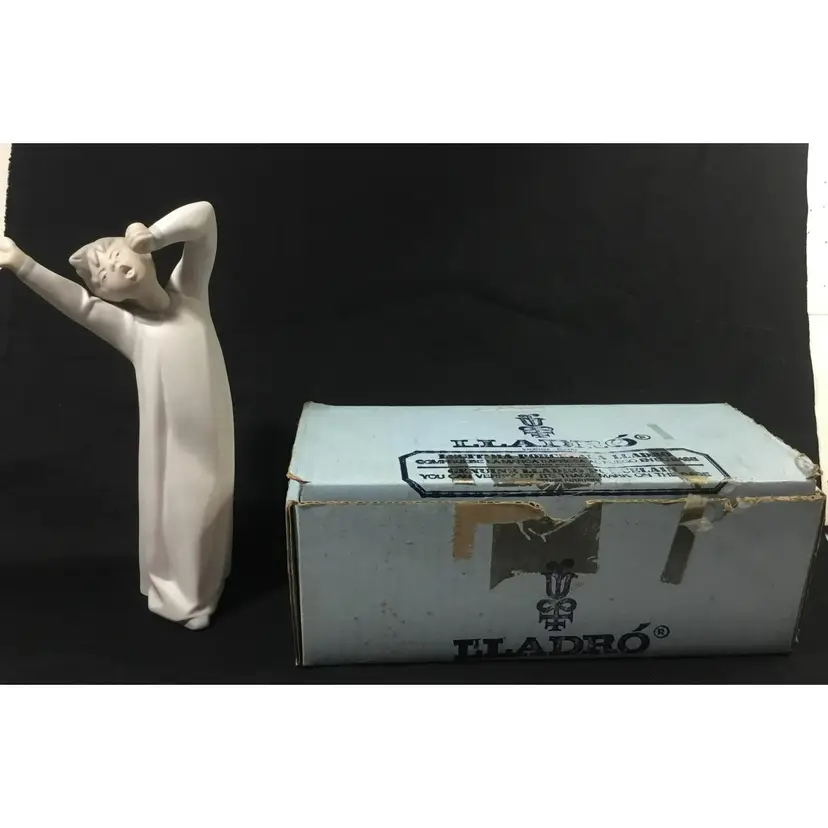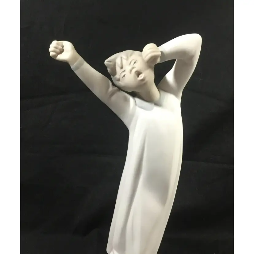 8.75" tall x 3.25" wide figurine of boy just waking up, yawning and stretching. He is dressed in a Victorian night shirt, hair is a little tousled. Figurine comes in original box.