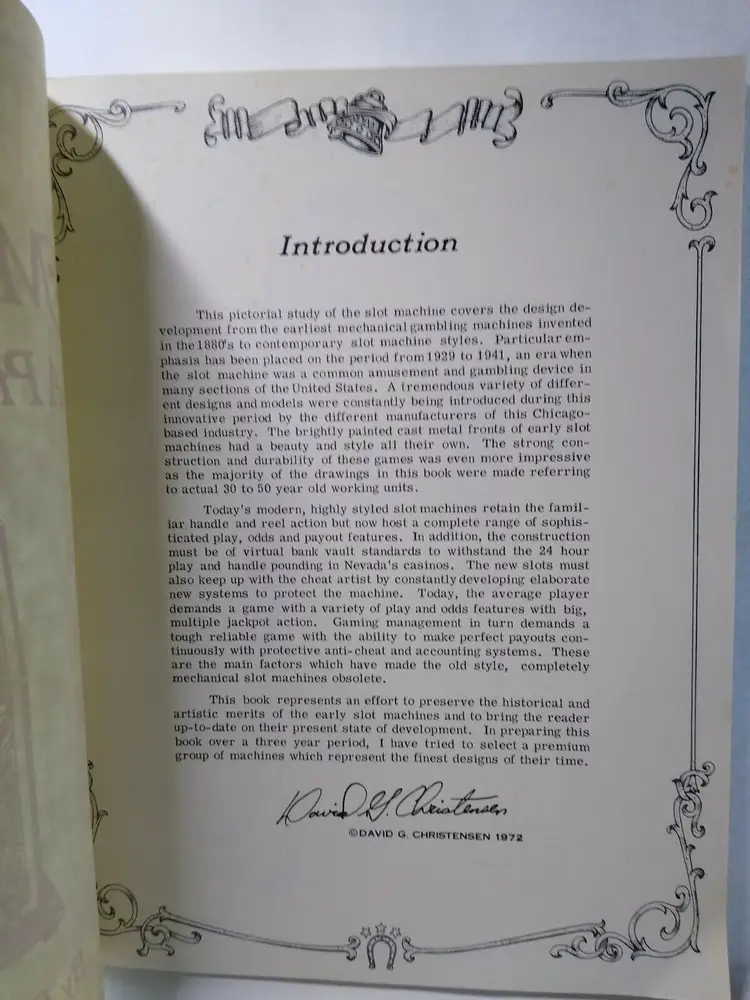 Features: Illustrated Format: Paperback Personalize: No Modified Item: No Subject: History Topic: Slot Machines, Coin Operated, Amusement Devices Book Series: Historical Country/Region of Manufacture: United States Ex Libris: No Edition: First Edition Language: English Publication Year: 1972 Book Title: Slot Machines A Pictorial Review Intended Audience: Adults Author: David G. Christensen Original Language: English Narrative Type: Nonfiction Publisher: D. G. Christensen Inscribed: No Signed: No Genre: History Type: Picture Book