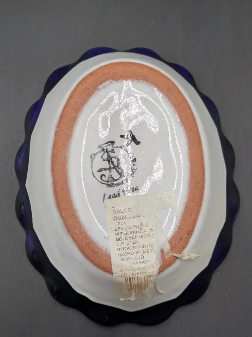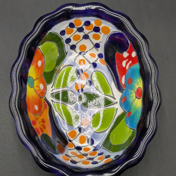 This adorable hand painted Talavera trinket bowl or soap dish measures 5-1/4" long, 4-1/4" wide, and 1-3/4" tall. Excellent condition, still has part of the label on the bottom.