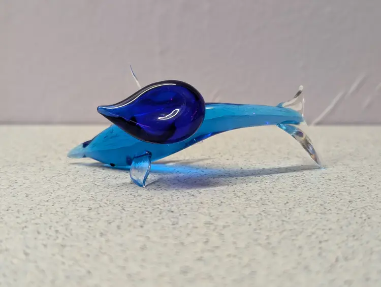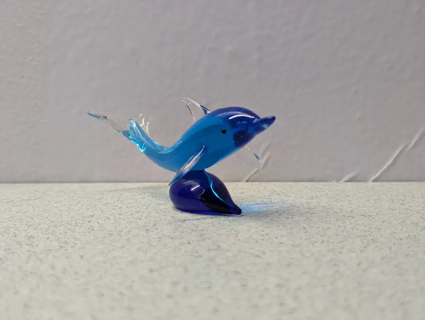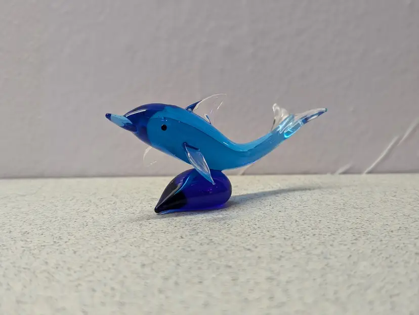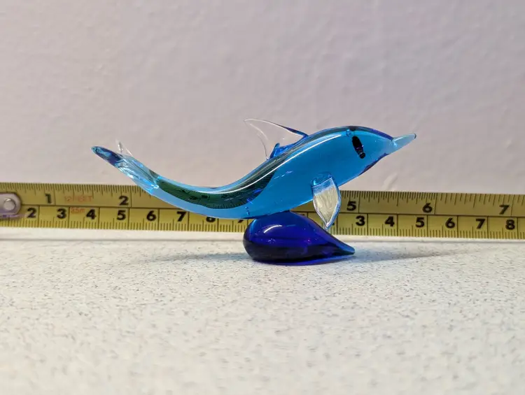 This beautiful small art glass dolphin figurine is a must-have for any collector or lover of marine life. The stunning cobalt aqua blue color of the figurine perfectly complements the clear black eyes and delicate fins. Crafted by hand with precision, this figurine is a true work of art and is sure to impress. Measuring 4 inches in length and 2 inches in height, this dolphin figurine is the perfect size for display on a shelf or in a fish tank. The animal class of dolphin and the material of glass make it a unique addition to any collection. Add this exquisite piece to your collection today!