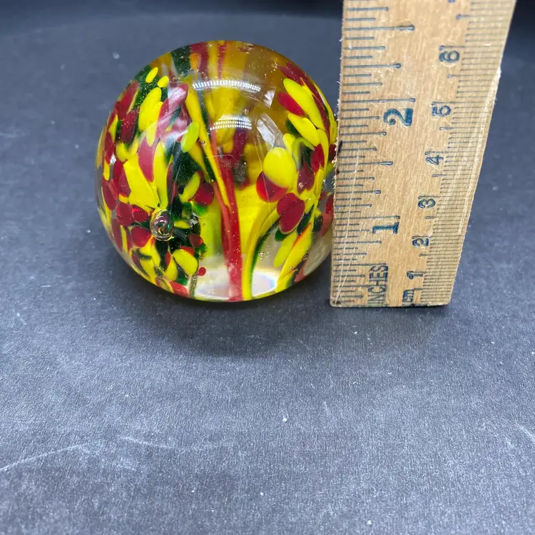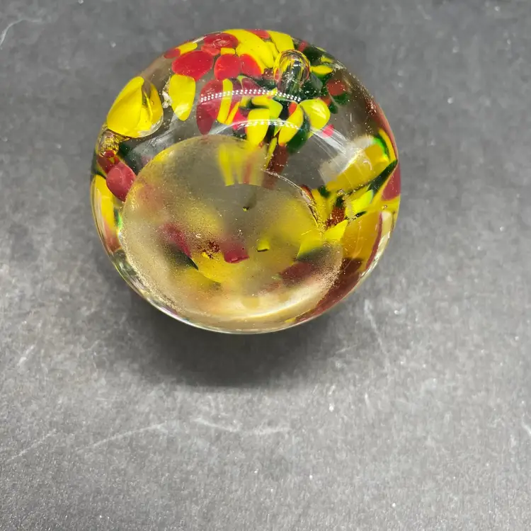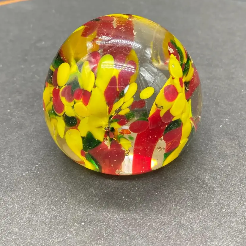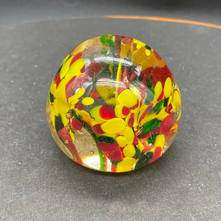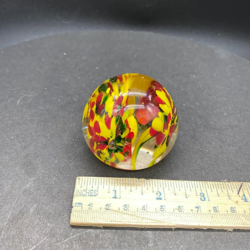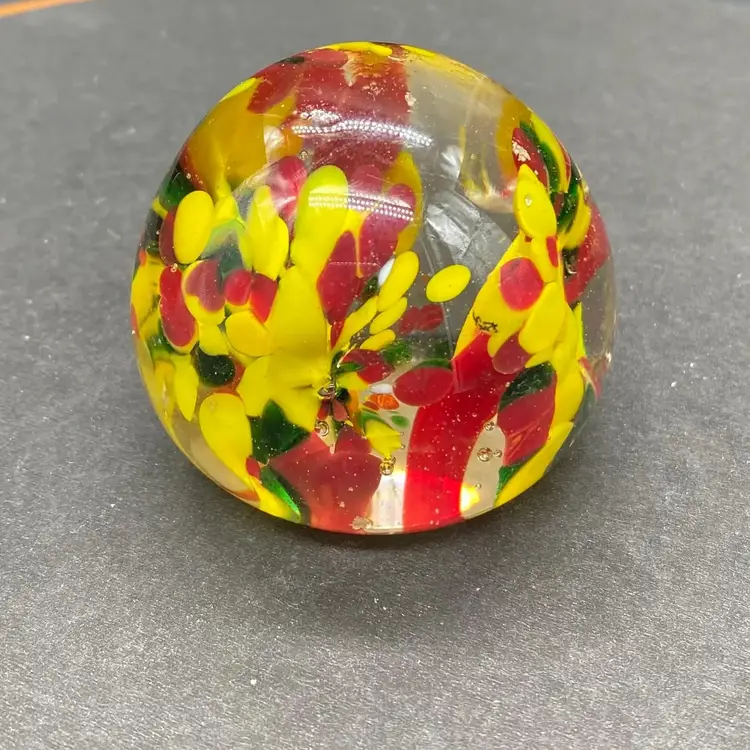 This small paperweight is a stunning example of mid 20th century art glass. Hand blown with precision, it features a vibrant blend of red, orange, and green hues that swirl together to create a mesmerizing multicolored sphere. The unmarked glass piece is a true work of art, perfect for collectors or anyone who appreciates the beauty of handcrafted glassware. Measuring approximately 2 x 2 inch, this unique piece makes a wonderful addition to any home or office. Its production technique is evident in the delicate details and flawless finish, showcasing the skill of the glassblower. Don't miss out on the opportunity to own this one-of-a-kind art glass paperweight from the 1960s.