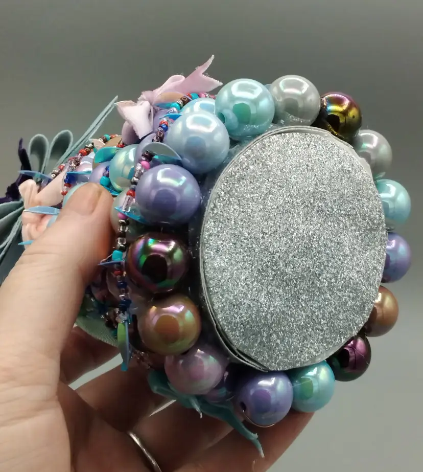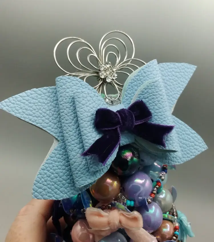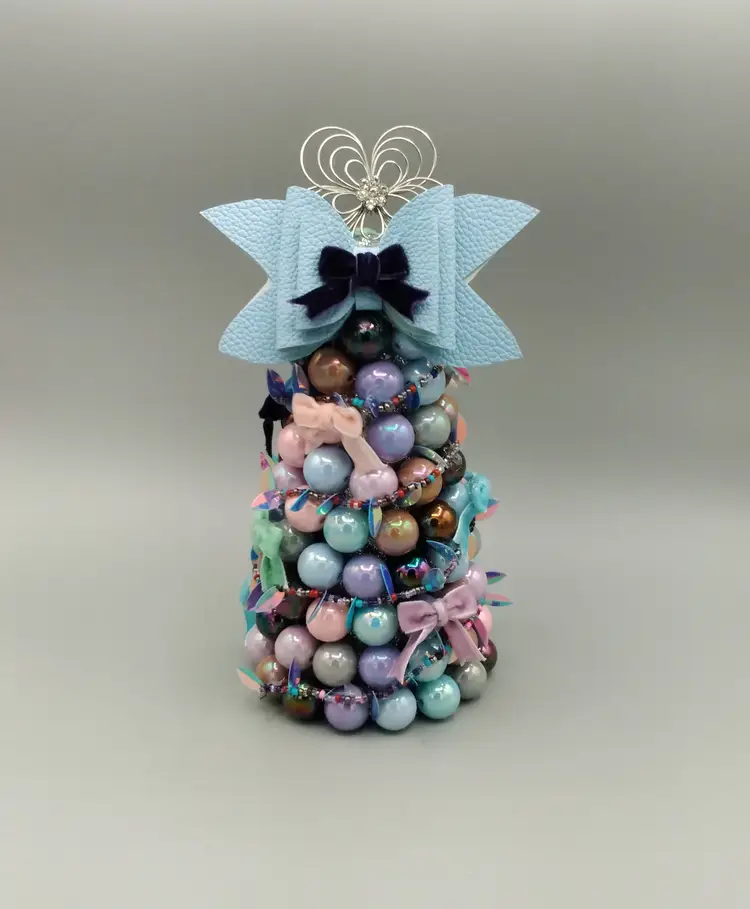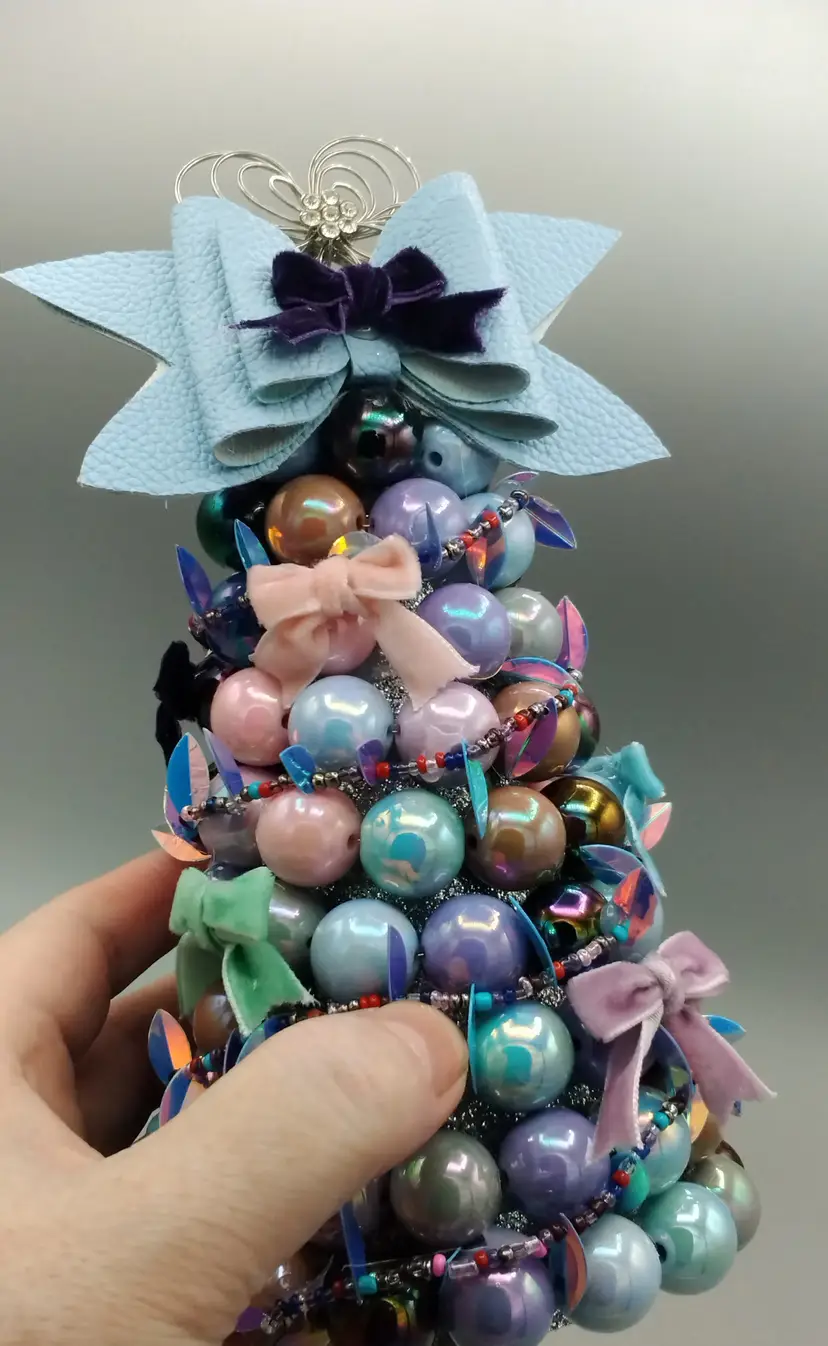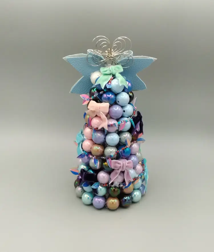 This 7.5 inch Cone shaped beaded tree in cool pearlized colors, is adored with a strand of glass Seed beads, and handcrafted bows in co-ordinating colors.