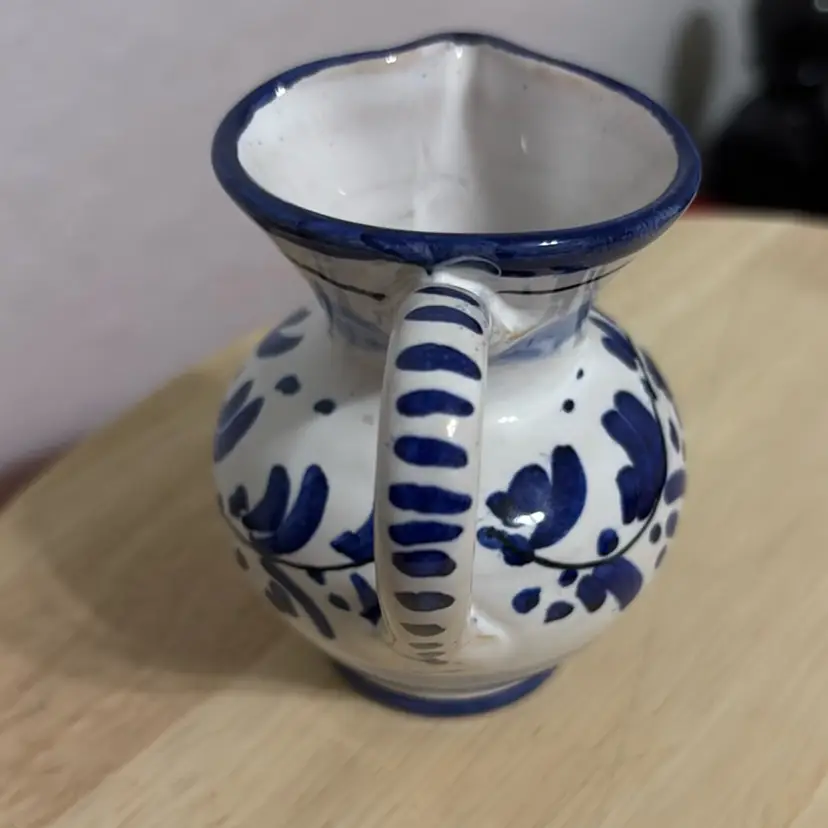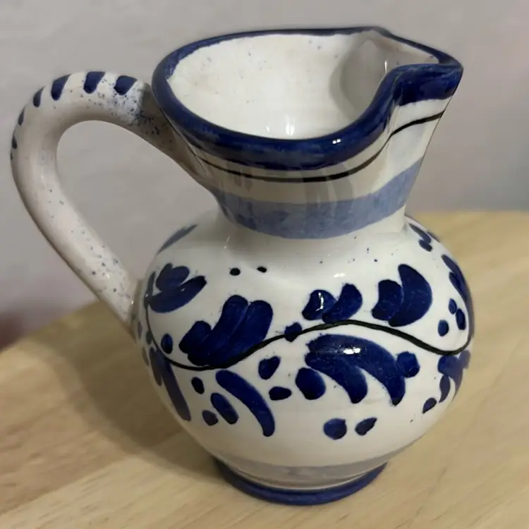 Italian small, hand-painted ceramic pitcher or creamer, likely a collectible piece of blue and white pottery. It features a distinctive fluted or ruffled rim and a rounded body with a small handle. The design is hand-painted in a folk-art style, with cobalt blue floral and leaf motifs over a white glaze. Probably from Italy.