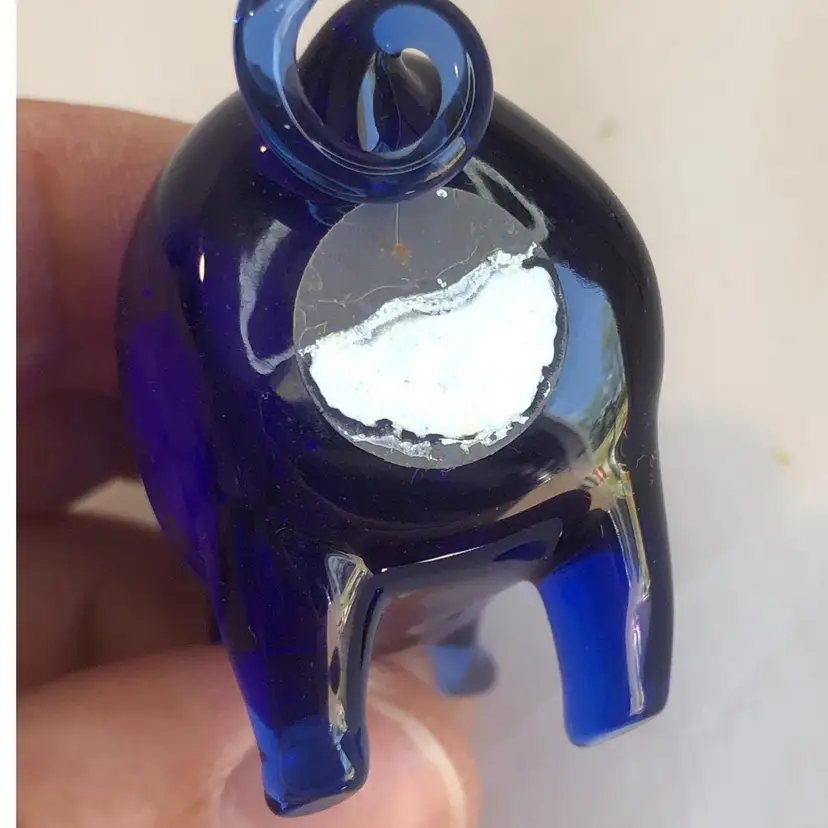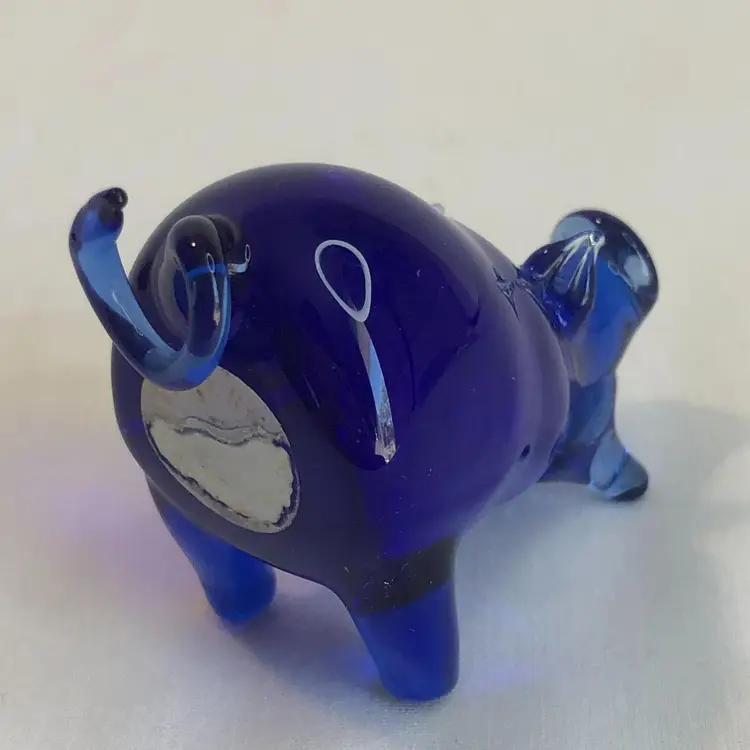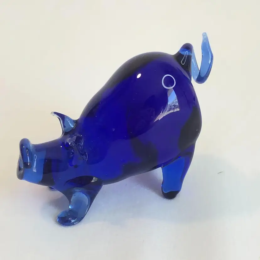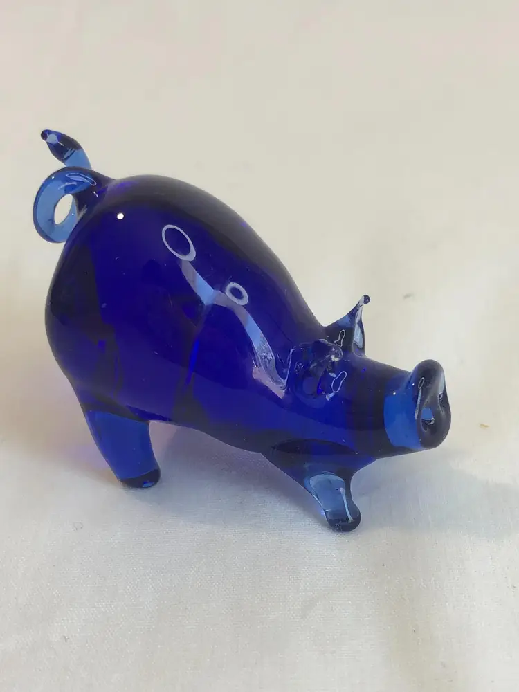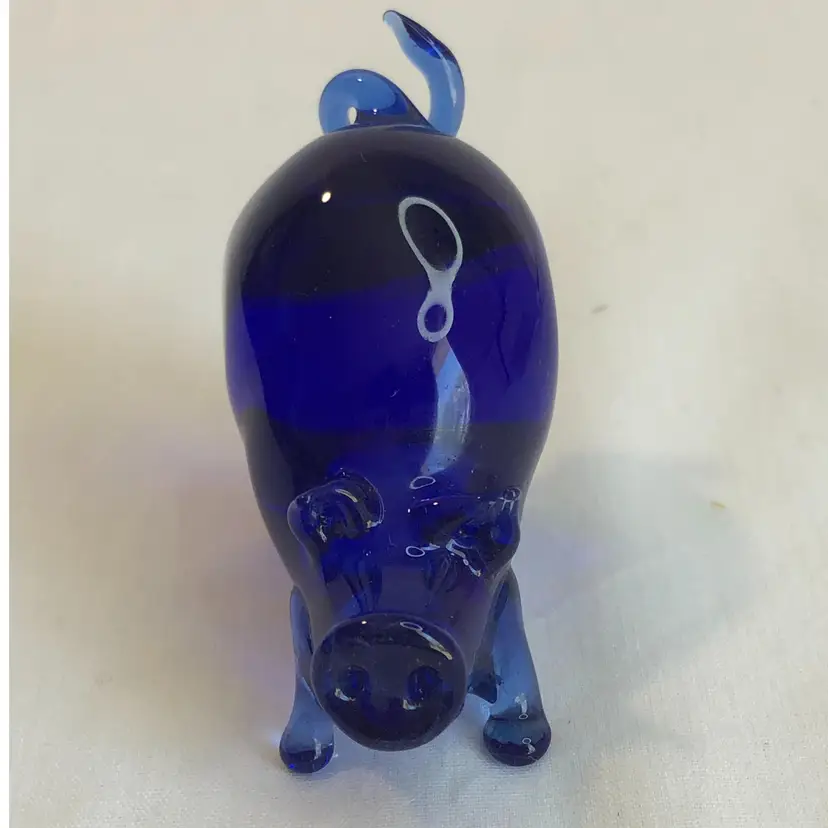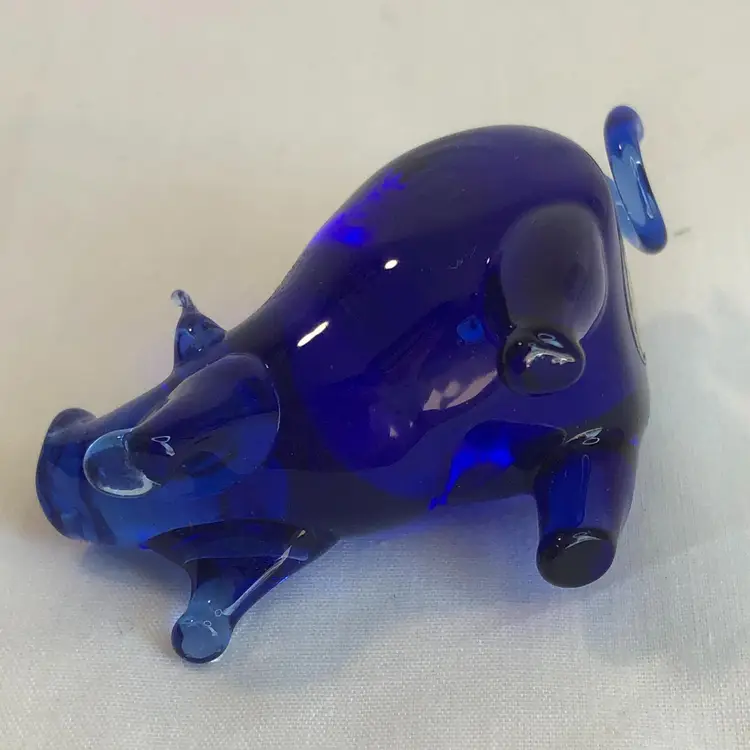 Small Bowing Cobalt Blue Art Glass Pig Figurine Handmade Blown Worn Label. 1.25" tall x 2.5" x 1". Great condition. No chips, no cracks. Original label is worn and I am not able to read it.