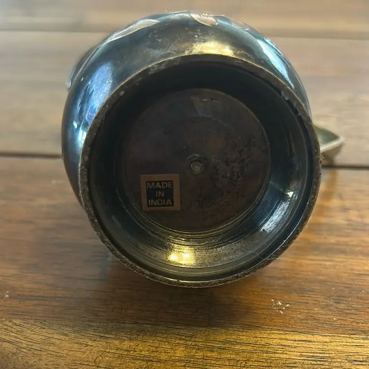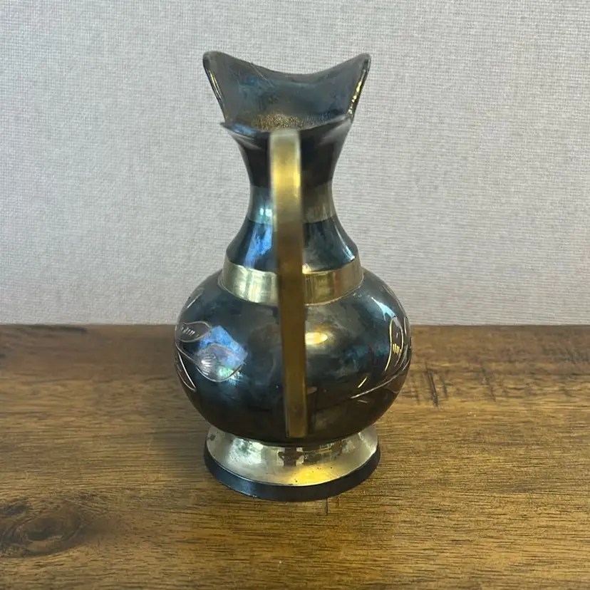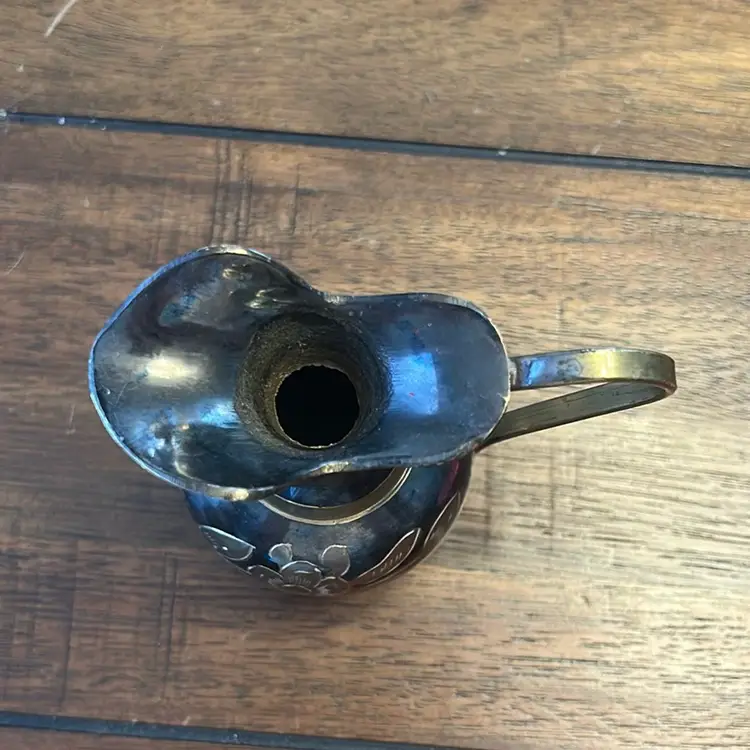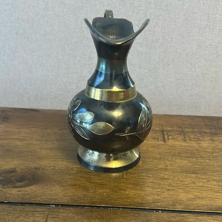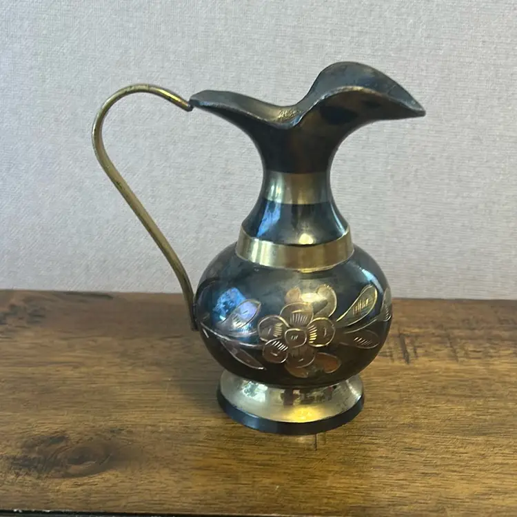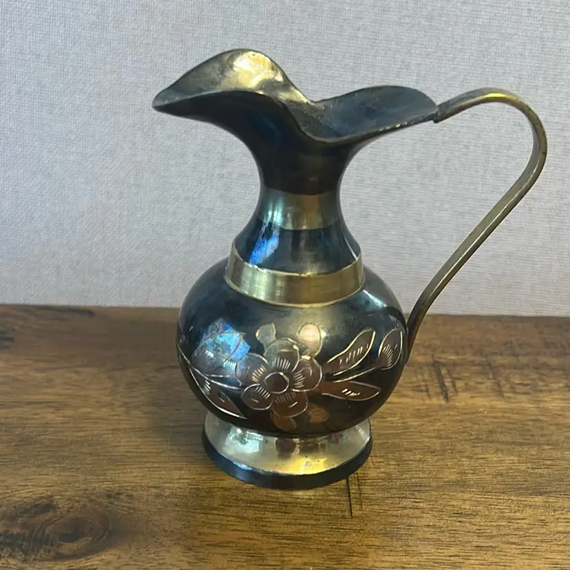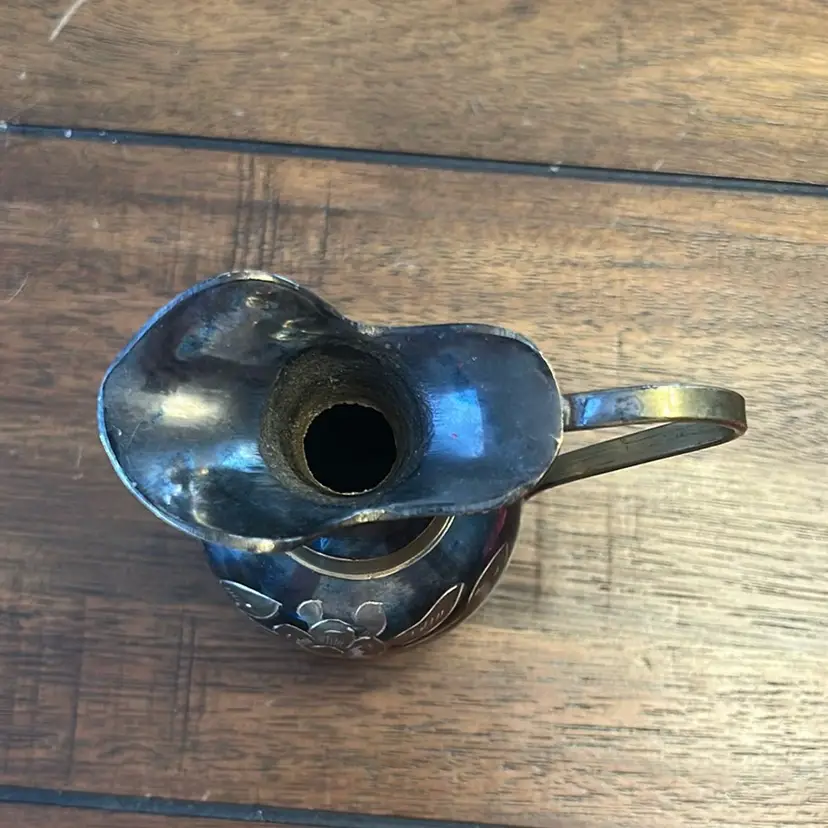 This small brass etched pitcher has flowers and was made in India. It is about 4” tall and 3.5” wide.