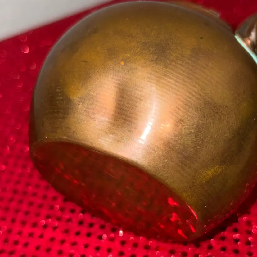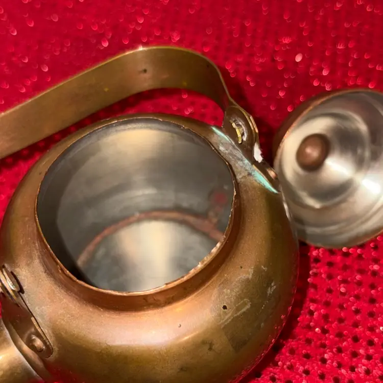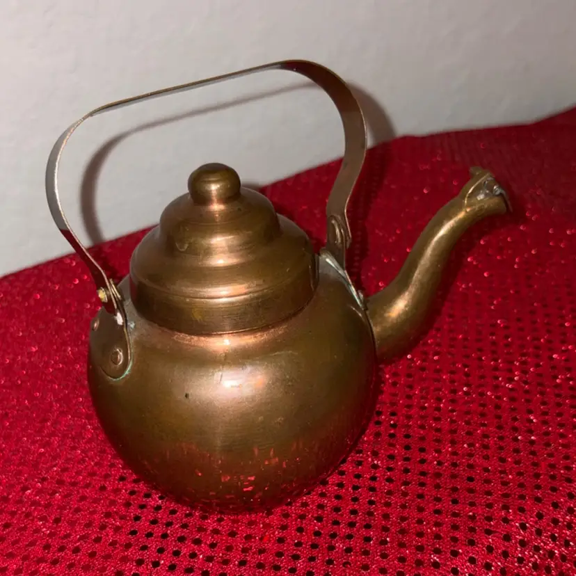 Small vintage brass decorative teapot or tea kettle. It is made of brass and features a simple, rounded body, a curved spout, and a hinged metal handle. Similar items are often sold as antiques or collectibles, used for home decor rather than functional use. The design is traditional and has a natural patina indicative of age. Some similar items are handcrafted and have specific origins like Mexico or India. 5.5" tall with handle up. Small ding on side.